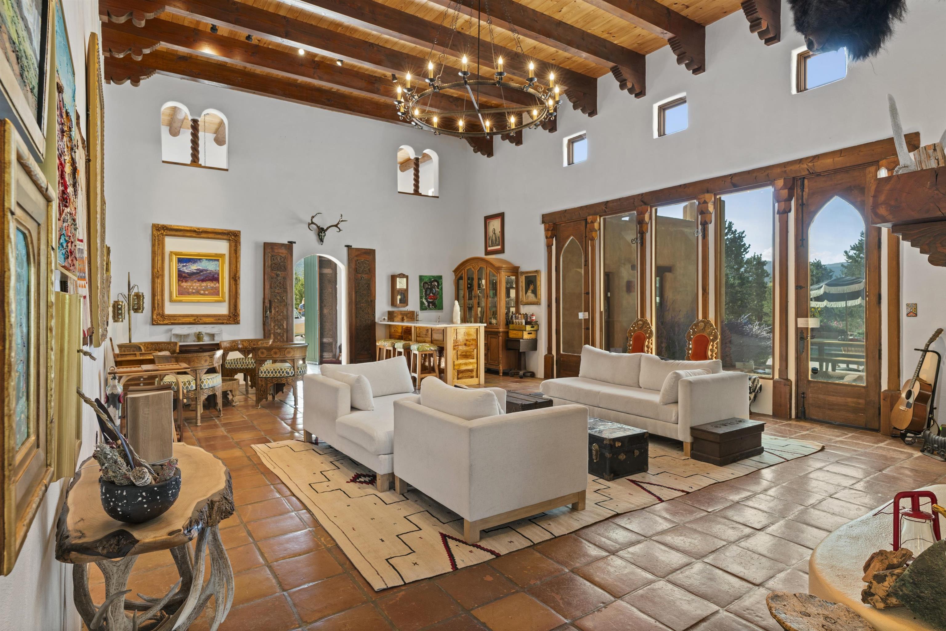 Perfect for refined hosting and elevated entertaining, this exceptional estate offers a rare blend of timeless design, global influence, and contemporary luxury. Crafted for those who value architectural artistry and effortless hospitality, the residence unfolds with thoughtful flow, generous gathering spaces, and sophisticated indoor and outdoor living. Each room opens like its own chapter. Distinct, intentional, and seamlessly connected to create a refined sense of livability and design. A timeless piece of Taos, New Mexico real estate, this 5-bedroom, 5-bathroom estate is haute couture in architectural form. A blend of classic Southwest character, Middle Eastern influence, and modern elegance, the home feels both storied and contemporary. Exquisite woodwork and one-of-a-kind doors anchor the estate with craftsmanship rarely seen today. A full, high-end renovation elevates the entire second floor as well as the lower pool suite, pairing luxury finishes with thoughtful spatial design. Every bathroom has been re-imagined to maximize comfort, serenity, and elevated hospitality. Designed for seamless entertaining, the sophisticated working chef’s kitchen opens into a grand dining room with soaring ceilings and an adjacent, beautifully appointed library. Two primary suites, one on each level, offer flexibility and privacy. From the upstairs porch, enjoy sweeping views of the town of Taos and the striking profile of the El Salto cliffs. Originally built by Ambassador Bill Eagleton, a career diplomat to numerous Middle Eastern nations, the residence carries an international pedigree matched by its exceptional design. With over 4,300 square feet of interior living and more than 3,100 square feet of outdoor patios, portals, and porches, the home is ideally suited for both intimate gatherings and large celebrations. The expansive great room opens onto a meticulously maintained patio featuring a 41-foot heated lap pool and in-ground hot tub. Lush gardens on drip irrigation create a private oasis of blooms, shade, and outdoor living. Set on 3 acres, the property also includes a peach orchard and thriving blackberry and raspberry patches just off the kitchen terrace. Six fireplaces, dramatic vaulted ceilings, generous art walls, and cozy architectural nooks complete the experience. An estate that feels both grand and deeply livable. A rare opportunity to own a truly singular oasis in the heart of magical Taos.