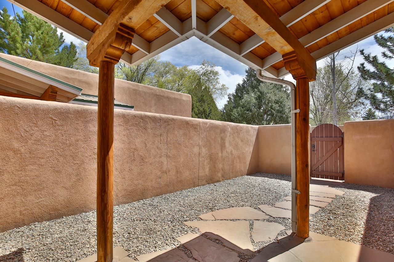 Immaculate, well-maintained 2-bedroom/2-bath condo in Town. Generous 1,113 square feet of classic Taos style. Good floor plan with kitchen open to living-dining areas, and bedrooms separated on either side of living room. New Navien system for the in-floor radiant heat. A "kiva"-style wood-burning fireplace, milled beams, tongue-and-groove ceiling, other southwestern features add to the ambiance. South-facing windows in living room provide passive solar warmth. Private courtyard with high privacy wall. The common pathway leading to the condo's entrance gate is nicely landscaped with trees and plantings. The condos are nestled behind a high wall along the city street. There is a separate individual owner's storage closet. Located about 3/4 mile south of Taos Plaza and Historic District. Close to the Taos Valley Inn, Apothecary coffee shop, The Bread Club restaurant, Mary Jane's food truck, Albertsons and SuperSave supermarkets, and the Farmers Market. Note: Seller will not consider offers from unrepresented buyers. Any documents included with this listing are provided as a courtesy only. Buyer should rely on documents provided with title commitment. Neither the Listing Broker or Seller warrant the square footage of the home or the acreage of the property. If the size of the home or the property acreage is pf material concern to Buyer, then Buyer should have it measured and/or surveyed. The fire depicted in the fireplace is virtually included.