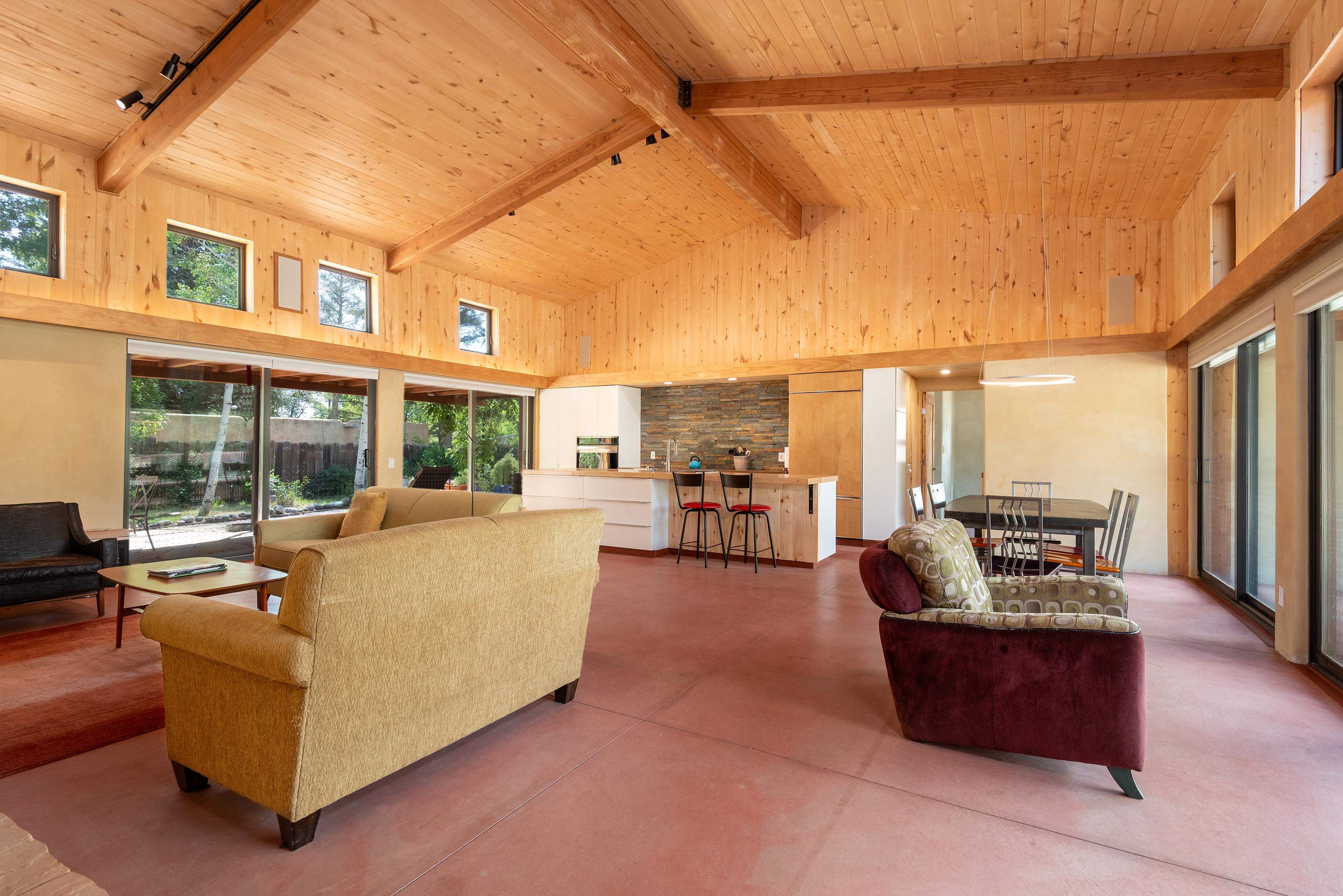This Beautiful and unique home has great views, and a great location with many wonderful custom features. No monthly gas bills and very low electric bills. Everything needed to make for a wonderful home on an approximate ½ acre fee simple lot in the heart of Taos. This architecturally designed home is exceptionally well built, highly energy efficient and is in a perfect location in the heart of Taos. Its quiet location is at the back of a secluded neighborhood cul-de-sac within easy walking distance to Taos Plaza, numerous restaurants, museums, shopping and Kit Carson Park. The home features a magnificent view of Pueblo Peak from all the major rooms. The open floor plan and generous portals provide plenty of opportunities for comfortable living. Located near the historic district, the property is not encumbered by architectural restrictions or any homeowner association. The architect/owner designed the home to exceed LEED Platinum energy efficiency standards. With no connection to the gas line, the all electric house and separate workshop has an array of solar panels that generate enough electricity to balance out all electrical usage annually. With Kit Carson Electric's net metering policy, there is a minimum monthly charge of $ 28 which is basically the price for providing back up power. The air source heat pump provides hot water for both domestic use and for the zoned radiant floor heating. In summer the system can be switched to provide cold water to cool the home while still providing hot water for domestic use. The exterior walls and roof structure were built with Ray-Core insulated panels plus 2" of exterior rigid foam insulation for a total R value of 55. The roof has an R-value of over 66. The tinted concrete floors (R-10 value with underfloor insulation) are integrally colored, making the surface very durable. The very high quality Alpen windows and patio doors are quad glazed - (yes, you read that correctly, 4 layers of glazing) and have fiberglass frames to minimize heat loss. Windows and patio doors have honeycomb insulating blinds, some are motorized. Special care was taken to seal all seams and joints during construction to minimize air intrusion and associated heat loss. A heat recovery ventilator assures high air quality and is timed to operate 2 hours each day. Interior walls are finished with an earthen plaster product from NM based American Clay which gives the house a certain warm, organic feel. All interior wood doors were custom made on site. There is a propane fueled gas fireplace that is see through and can be enjoyed from the den or living room sides of the wall. This is the only nonelectric appliance, depending upon usage, it uses 1 or 2 four gallon tanks of propane per year. While primarily for aesthetic enjoyment it can serve as a heating source during an extended power outage. The open plan KITCHEN features a built-in Sub Zero refrigerator/freezer, induction cooktop, wall oven, dishwasher and oversized stainless steel sink, The large island invites guests to join in with meal preparation and has storage on both sides. The microwave and coffee station are inside cabinets and are hidden from view. Counter tops are copper and hardwood, and a pantry closet is just off to the side. The whole house air ventilation system with intake above the range can be used to remove cooking odors if needed. THE GREAT ROOM with high ceilings has portals on both north and south sides, clerestory windows and Aspen tongue and groove high walls and ceiling for woodsy warmth above the earthen plastered walls. The stereo system will stay with 9 built-in speakers, including 2 subwoofers. The large recessed TV will also remain. Outdoor living is premium with large porches on both north and south sides of the home which are perfect for entertaining and enjoying the unobstructed view of Pueblo Peak. In addition to the oversized 2 car garage, there is a 720 sf heated shop with a small attached greenhouse.
