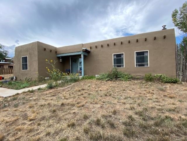 Discover this enchanting Pueblo Style, in-town house featuring 2 bedrooms and 1 bath, perfect for those seeking a cozy and convenient living space in the town of Taos. This appealing property boasts a fenced yard and a delightful flagstone patio off the living room, ideal for barbecues and outdoor gatherings in the spacious backyard. Located in the picturesque town of Taos, this home includes an office with a woodstove, providing a warm and inviting space for work or relaxation. The private office is versatile, offering room for a computer, television and more. There also is a separate entrance into the office from the outside. The house has beautiful pine floors and is comfortable and well maintained. The house offers many possibilities and the thoughtfully designed kitchen, dining area, and living room create a cozy and warm ambiance, perfect for entertaining guests. The property is equipped with town water and septic, ensuring the convenience of all utilities installed. There is a parking spot for your RV, and the house is "turnkey," coming fully furnished with a washer and dryer. The property has been owned since 2005. The house sits on a spacious .488-acre lot, adorned with shade trees, lilacs, cottonwoods, an apple tree, a plum tree, hollyhocks and has ample room for a garden. The house is constructed with 2x4 and 2x6 framing, 4x6 beams, and tongue and groove. The pine floors, double-hung windows, and a living room fireplace, add to the home's charm and desirability. The kitchen window overlooks the fenced backyard, and the house features electric baseboard heating. There are also two water spigots for easy property maintenance. This property offers great income potential and is a wonderful opportunity to enjoy country comfort in a downtown setting. This house offers all the conveniences of living in town, with shopping and restaurants nearby. Come and explore this beautiful home, featuring a wide range of amenities.