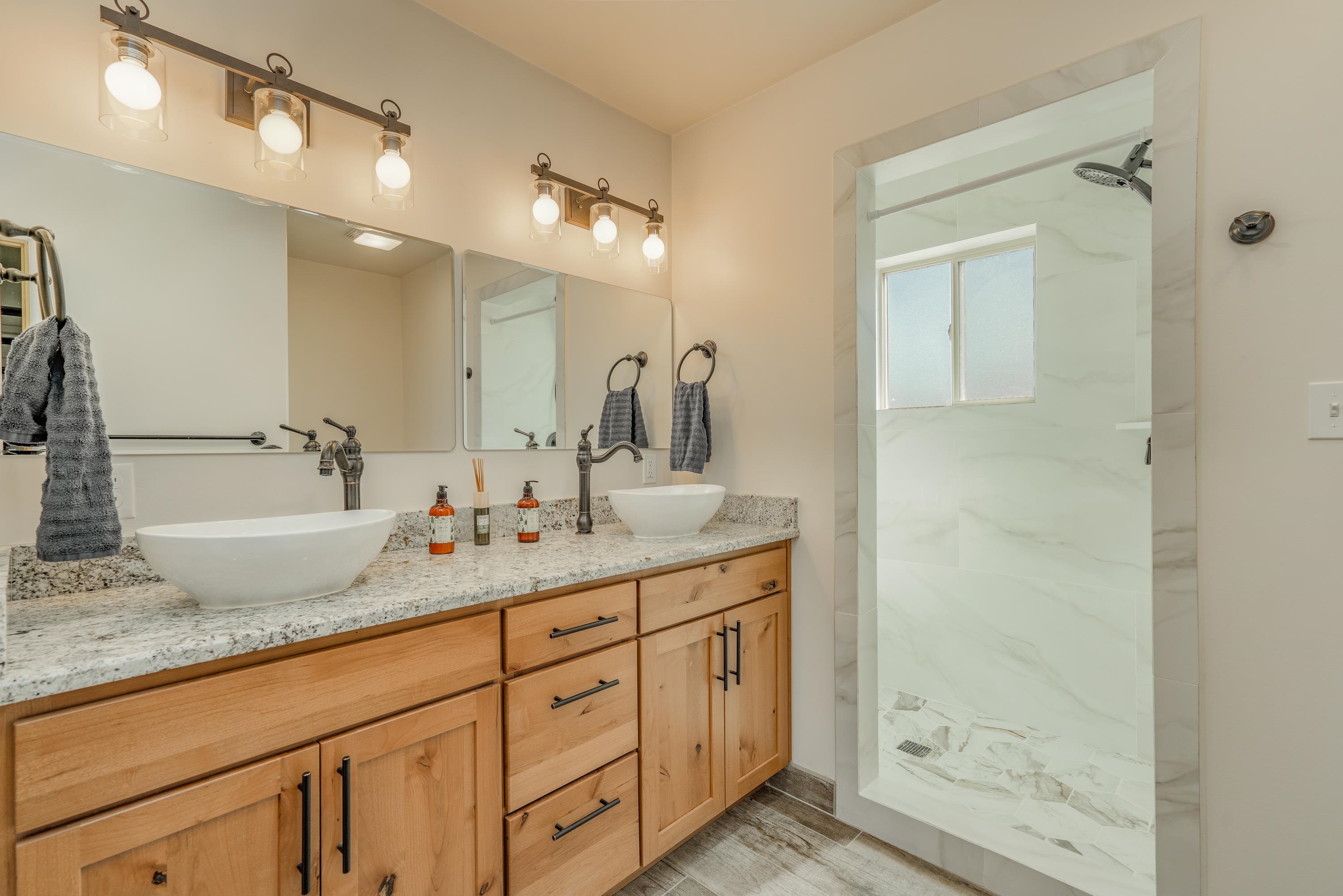 Wow! This home has a LOT of elements that make it an ideal place to live. Want to know more? Set off a dead-end road with a perfect floor plan, views, no deferred maintenance, with the most ideal bedroom and bathroom count — this home is rockin’! The road and parking area are fully graveled — no dirt or mud to worry about. The front courtyard is gated with custom metal gates set in an adobe wall and features a big flagstone patio, a large real rock water feature, and great Taos Mountain views you can also enjoy from the living room and master. Inside, you’ve got 1,382 sq ft, 3 bedrooms, and 2 full baths. The living room feels open with 12’ tongue-and-groove ceilings with large vigas, and a wood-burning kiva fireplace with a nice diamond plaster finish. The kitchen has granite counters, oversized cabinets, stainless steel appliances, and even a wine cooler. In the spaces where window coverings matter most, you’ll find top-of-the-line Hunter Douglas cellular blinds already in place! The master suite comes with a walk-in closet, dual vanity sinks, and large windows that let in tons of natural light. The house was built in 2021, so there’s no deferred maintenance. It’s heated by radiant floor heat with an on-demand boiler powered by natural gas for low heating bills. The attached 2-car garage is heated and completely finished. There’s also a whole-house water softener, ADT security system (just needs activation), and a dedicated laundry closet. Out back, you’ll find a fully fenced yard that’s perfect for pets, a portal with a matching flagstone patio, and a brand-new oversized shed for storage. Xeriscaping in the front keeps things easy, and the neighborhood itself is quiet and welcoming. Put your roots down in this neighborhood!