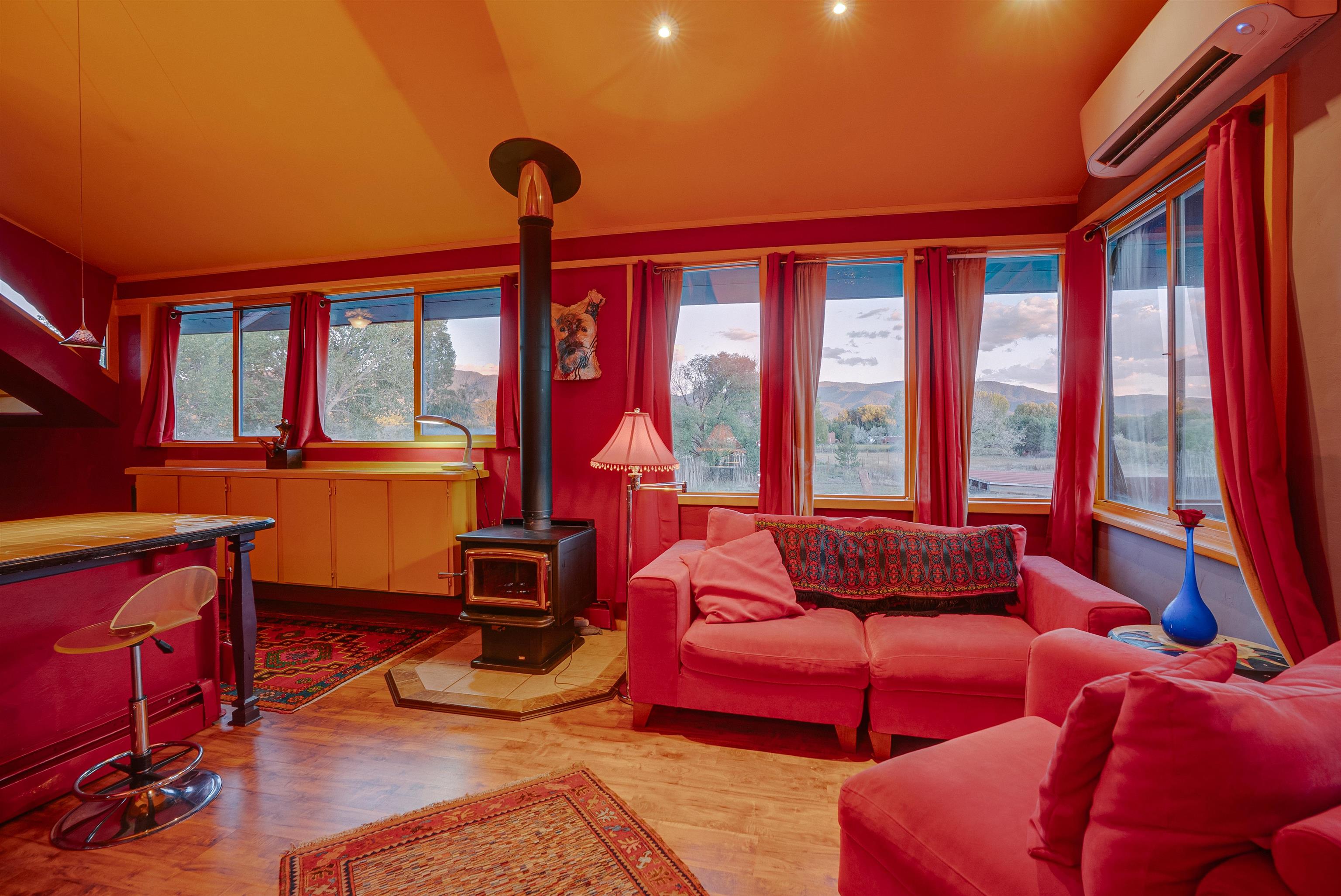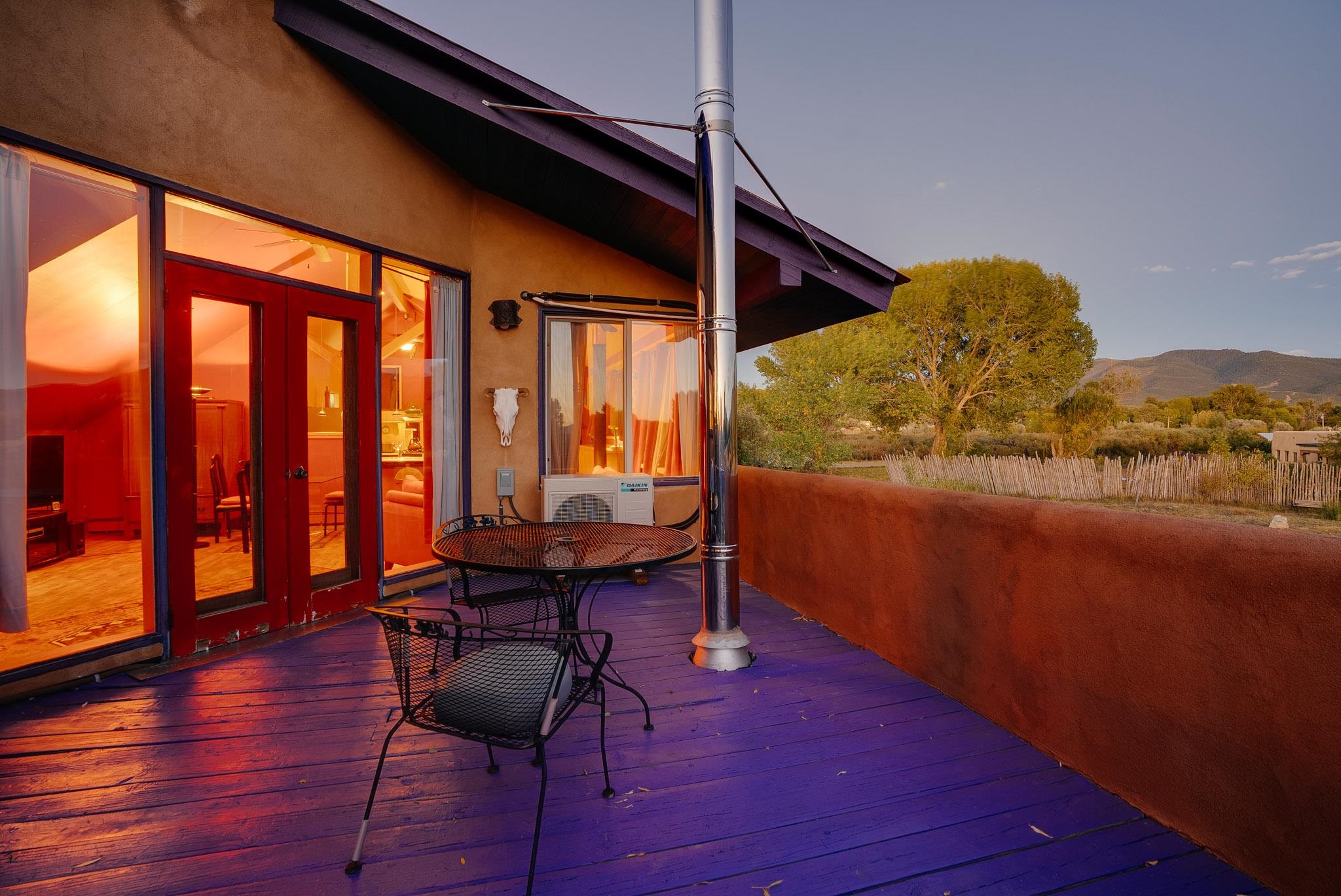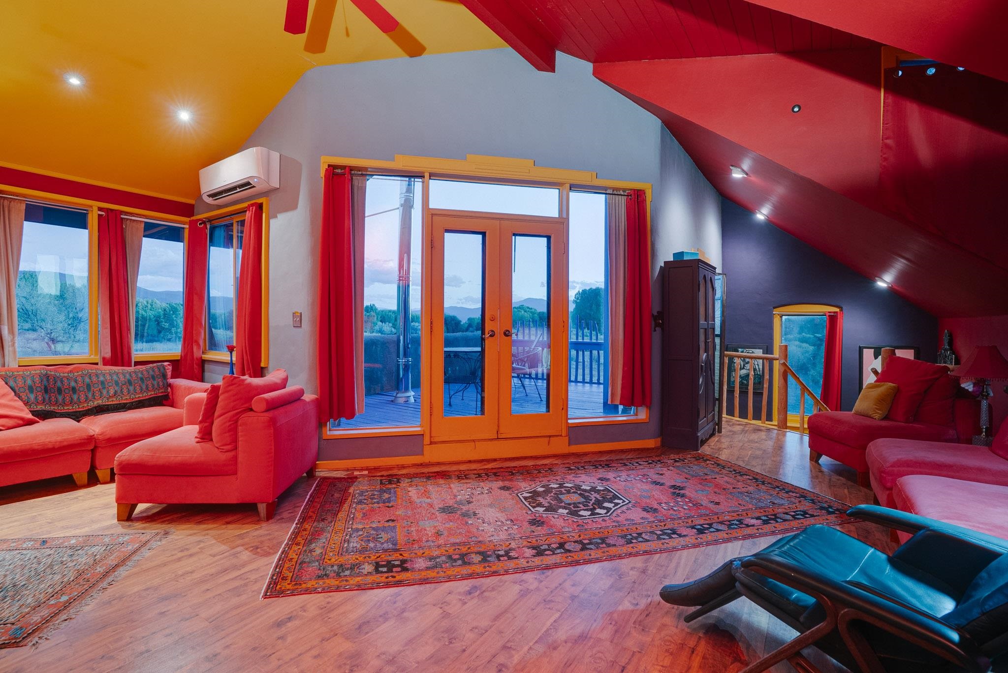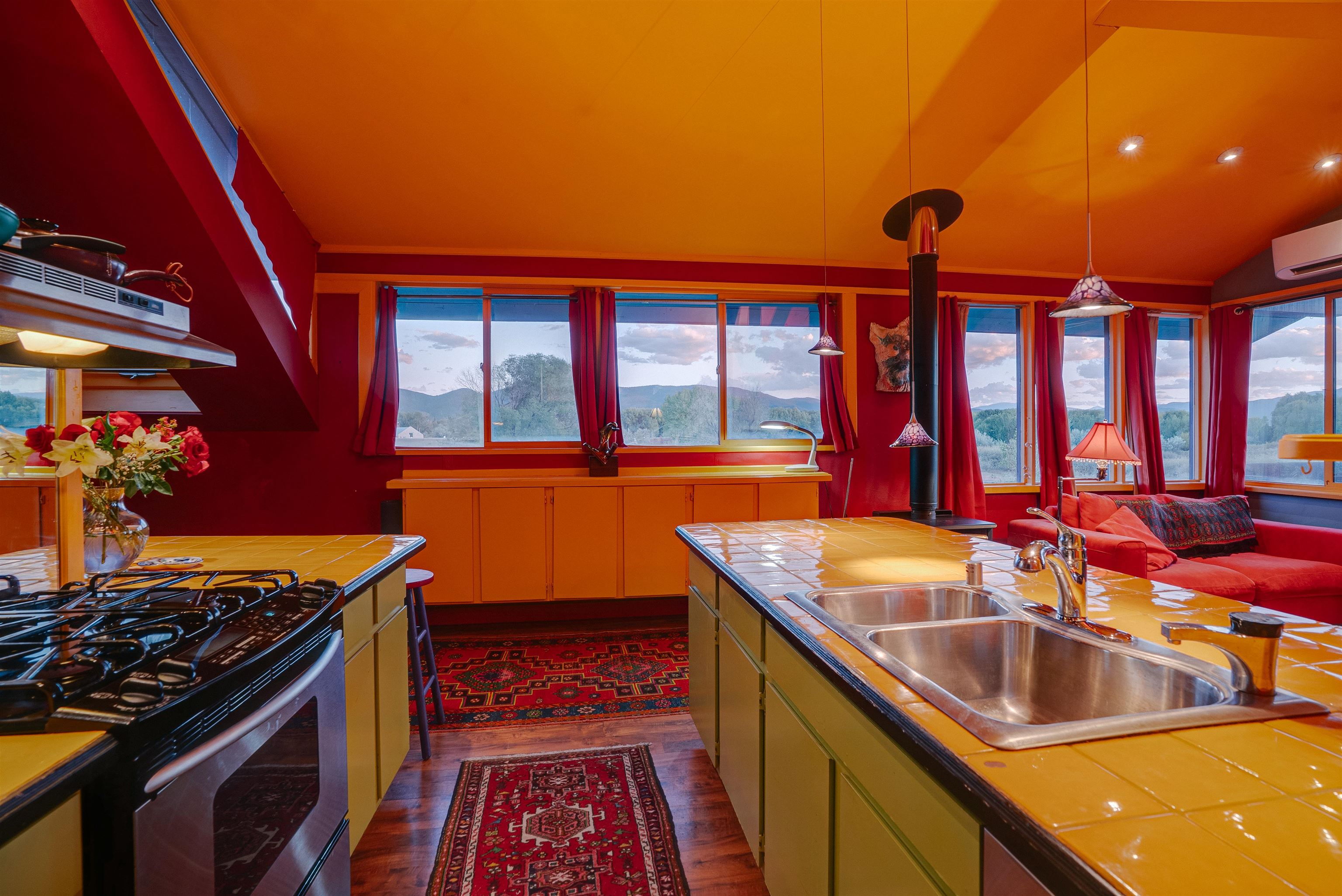 Drenched in vibrant color and situated on two acres of irrigated land in an enormously desirable location, this property, with wonderful views of both Taos Mountain and the Sangre de Cristos, invites you to bring along your imagination because 1016 La Cienega has a lot to offer its next owner. Four bedrooms/3 baths, a 4 car garage/studio space, rental property, storage, mini split, carport and more! La Cienega is one of those roads that is close to town and yet feels like it's a world away. This is a neighborhood in the true sense of the word. People watch out for one another here and yet it is quiet, private and rural with Pueblo Land on two sides. The main house is a celebration of festive color that echos the artistic spirit of Taos. An open living room and kitchen feature vividly colored tile and very high ceilings- feeling warm and alive. In the main house there are two bedrooms and one full bath and there is also a double door that connects to an additional bedroom and bathroom on the ground level. This design offers perfect flow for entertaining- leading out to a fabulous deck to watch sunset. Then, there is the adorable one bedroom/one bath income generating casita/apt. With convenient exterior doors, there are many opportunities for flex use for these spaces. Another door leads to a laundry room that could also be an office/studio/gym/yoga. In addition to all these interesting living spaces, there is a 4 car garage with electricity, additional storage area and a shed. Bring your vision, artistry and originality to this wonderful property. Call today for your private showing.