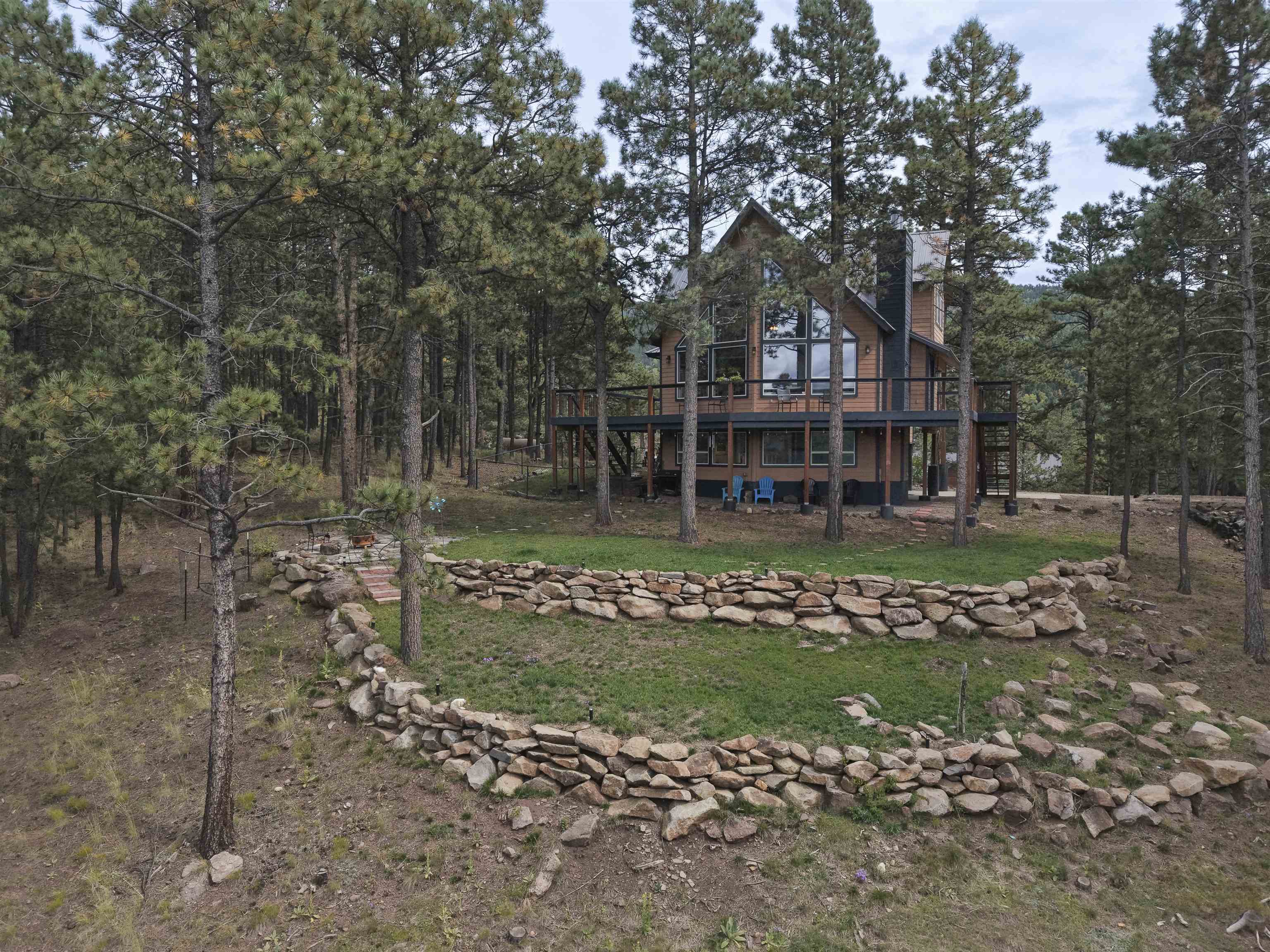 Nestled on 1.68 forested acres and just 1.2 miles from the base of Angel Fire Resort, this three-story home boasts 2,443 square feet of living space offering room for everyone. The lower level features its own full kitchen and bathroom with exterior access through the garage or private entry, creating excellent options for guests or rental potential. On the second floor, soaring ceilings and large windows frame views of the valley, while the open kitchen and living area provide a warm gathering space. Upstairs, you'll find two additional bedrooms and two full bathrooms. Surrounded by towering pines and mountain scenery, this property combines the feeling of seclusion with the convenience of being minutes from skiing, mountain biking, dining, and all the amenities of Angel Fire.