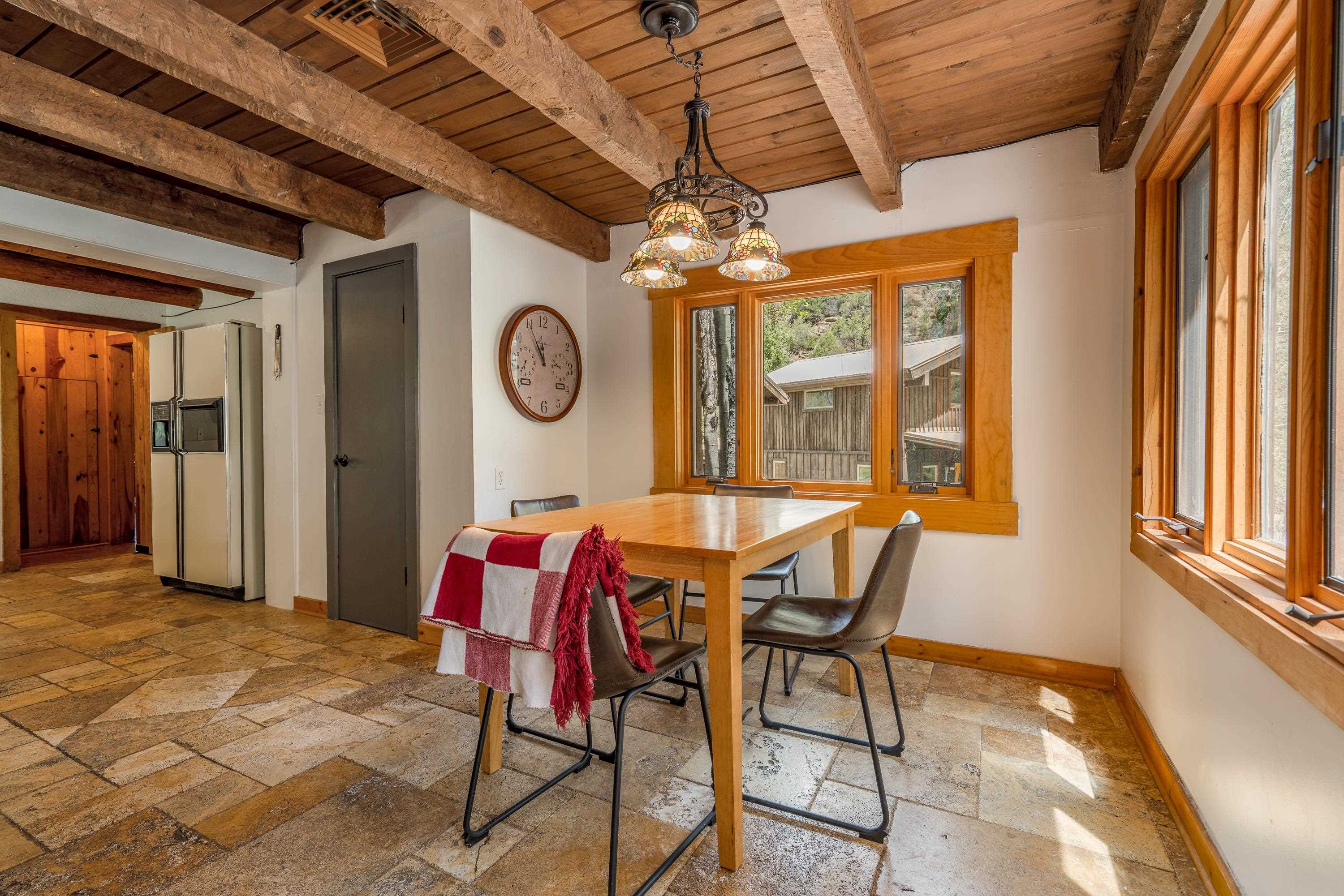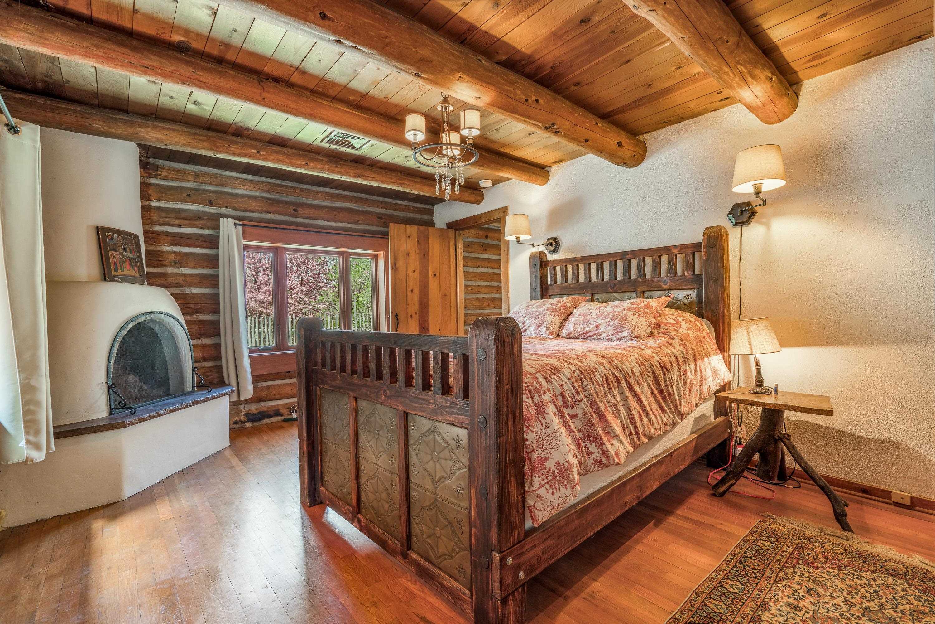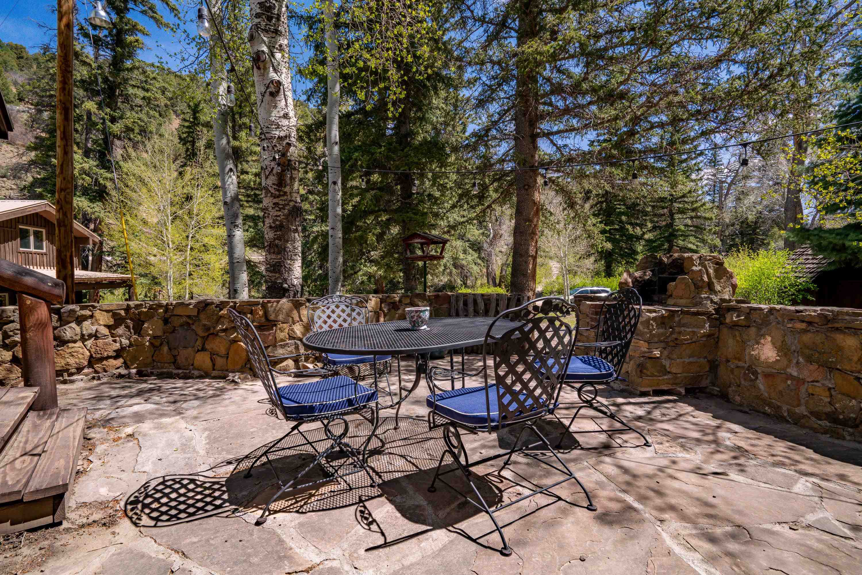 This 7.57-acre property includes a main house and a guest house, with the Rio Fernando running along the entire front portion and the Carson National Forest bordering the back portion. The main house is 1,780 sq ft with 2 bedrooms and 2 bathrooms—one with a shower, the other with a bathtub. It includes a large living room with a grand stone fireplace, a sunroom, and a fenced backyard perfect for pets, and a hot tub easily accessed off the master. The kitchen has travertine floors, a large enamel farm sink, new double door fridge, large pantry, and a light filled breakfast area with views of the surrounding forest. There’s a dedicated laundry room with additional cabinet storage. The home’s flooring includes oak in the living room and aged pine in the bedrooms; soft on the toes and warm in the winter! The master suite features a wood-burning kiva fireplace, a large walk-in closet, and an en suite bathroom. A stone patio with a built-in wood-fired grill sits off the kitchen and the front porch is covered and has a inviting view; two of many places around the property to enjoy the outdoors. A lawn gently slopes away from the main house leading to the river where you can find several good spots for sitting near the water. Stacked stone walls add borders where needed. The guest house is 1,168 sq ft with 1 bedroom and 1 bathroom. It has multiple closets for storage, and a large downstairs area suitable for use as a game room, living space, art studio, or anything else you may desire. The covered porch off the guest house keeps you dry when he thunderstorms roll in and would be a great place to put a chat set. A storage shed provides extra space; great for wood storage or all the gear you don’t want in the house! If the home and guest house were not enough, there are multiple building spots around the property, a couple with great views down the canyon. The acreage is comprised of two separate lots; affording you the ability to sell one or keep both! The property is accessed via a bridge over the Rio Fernando, making it an easy property to secure if you are away for long periods of time. You won’t be disconnected from the world as there is a high speed internet connection! The main house has forced air heating while the guest house has two gas heaters, both run off propane. A private well supplies all domestic water. This is the property dreams are made of; you’ll want to stay if you come visit so be prepared when booking a showing!