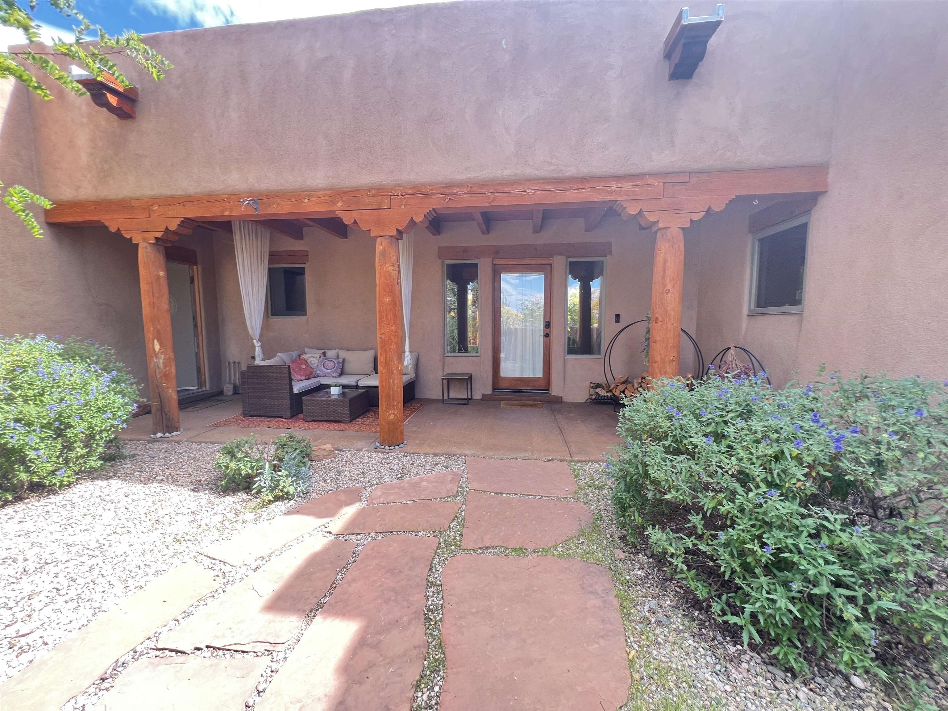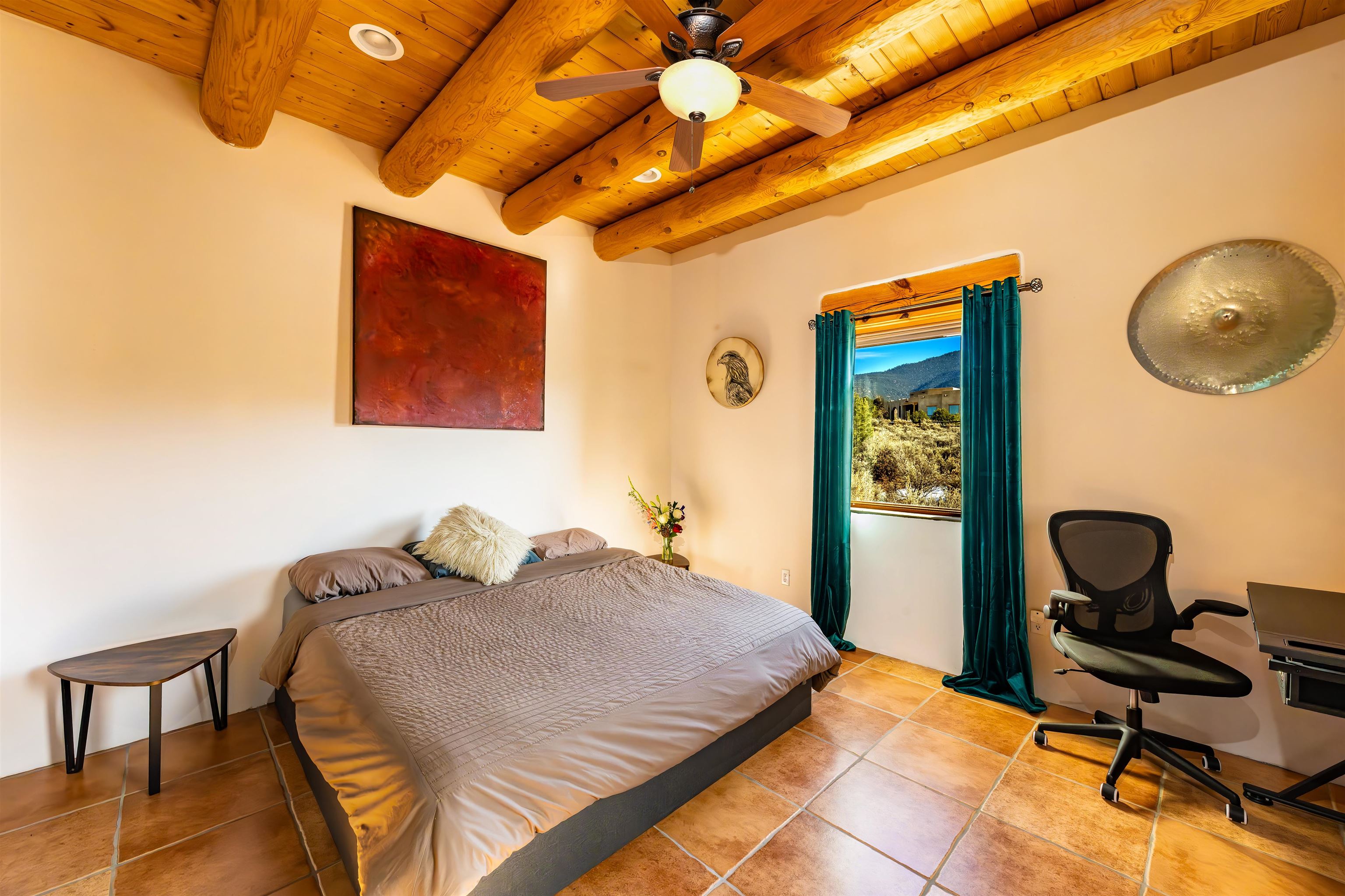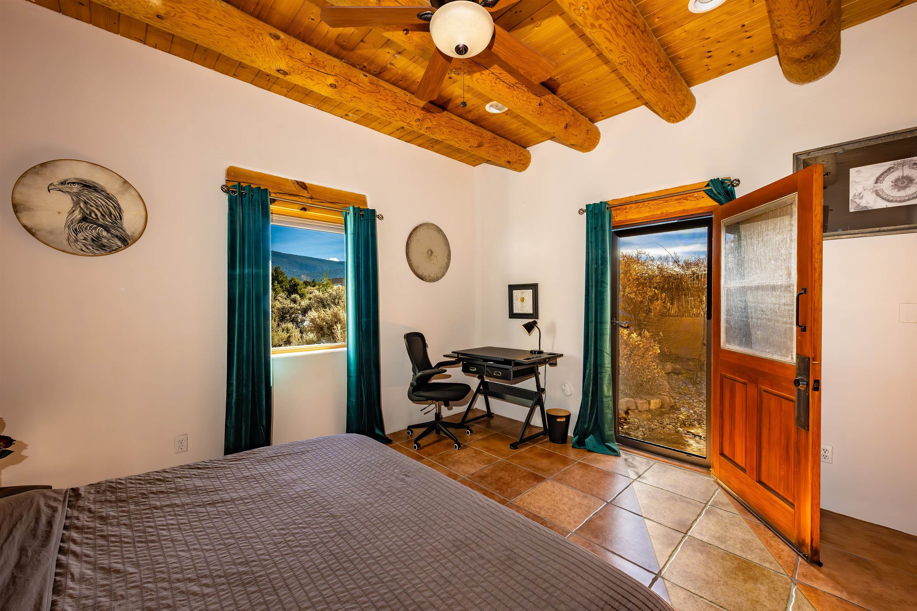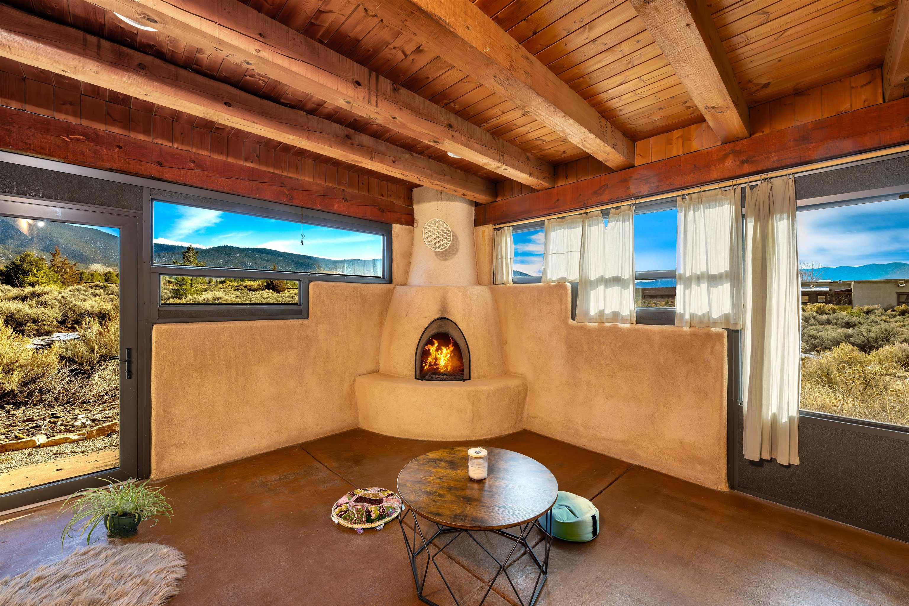 Beautiful, bright, turnkey single-level Pueblo-style home in the desirable Dos Arroyos neighborhood with breathtaking mountain views. Featuring 3 bedrooms, 2 baths, and 1,793 sq ft, this property combines traditional Taos charm with modern comfort. Spacious interiors showcase extra tall ceilings with exposed vigas and detailed woodwork throughout, complemented by two kiva fireplaces, and additional 255 sq ft sunny studio. Offers natural gas radiant floor heat throughout, a heated double garage, and custom kitchen cabinetry. Boasts a spa-like setting with cedar barrel sauna, outdoor shower, and salt water hot tub! Option for furnishings to convey via bill of sale upon buyers request. Fast fiberoptic internet. The home sits on a 0.25-acre lot with mountain views and easy access to hiking trails, Holy Cross Hospital, and Taos Plaza. Key Features: - 3 Bedrooms / 2 Bathrooms - 1,793 sq ft (approx.) - Lot: 0.25 acres / 10,802 sq ft - Year Built: 2007 - Natural Gas radiant floor heat - Attached 2-car radiant floor heated garage - Pueblo/Southwestern, single level - Hot Tub - Cedar Sauna - Xeriscape Landscaping with drip irrigation. Interior Highlights: - Soaring ceilings with exposed vigas & woodwork detail - Open floor plan with abundant natural light - Two kiva fireplaces (living room & master) - Tile flooring - Custom cabinetry & built-ins - Sunroom + covered portals for indoor/outdoor living - Fast fiberoptic internet - Stainless kitchen appliances Community: - Subdivision: Dos Arroyos - Low HOA Fee: Only $513/year (approx. $43/month) - Near Holy Cross Hospital & Dos Arroyos Trail system - 5 minutes to Taos Plaza