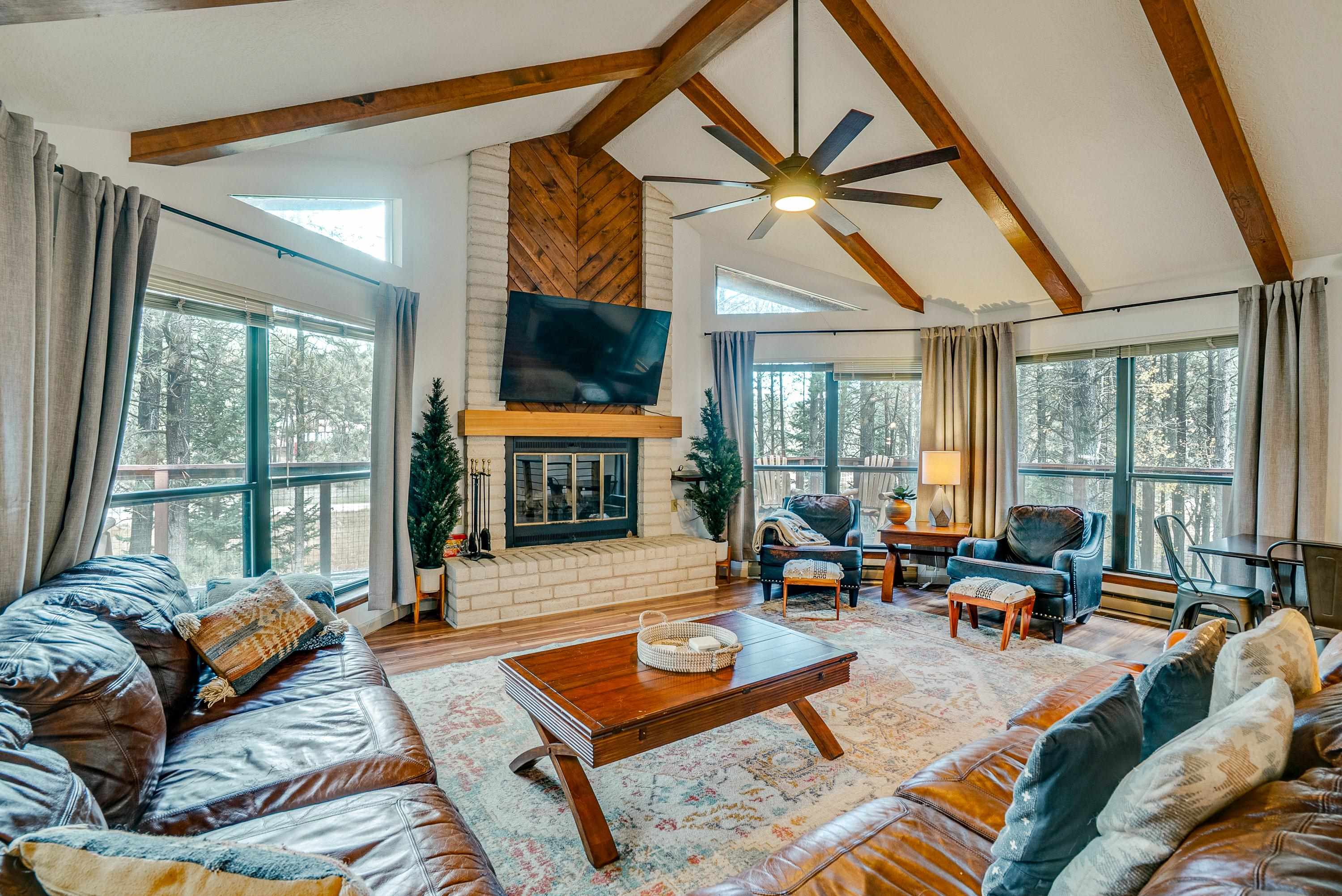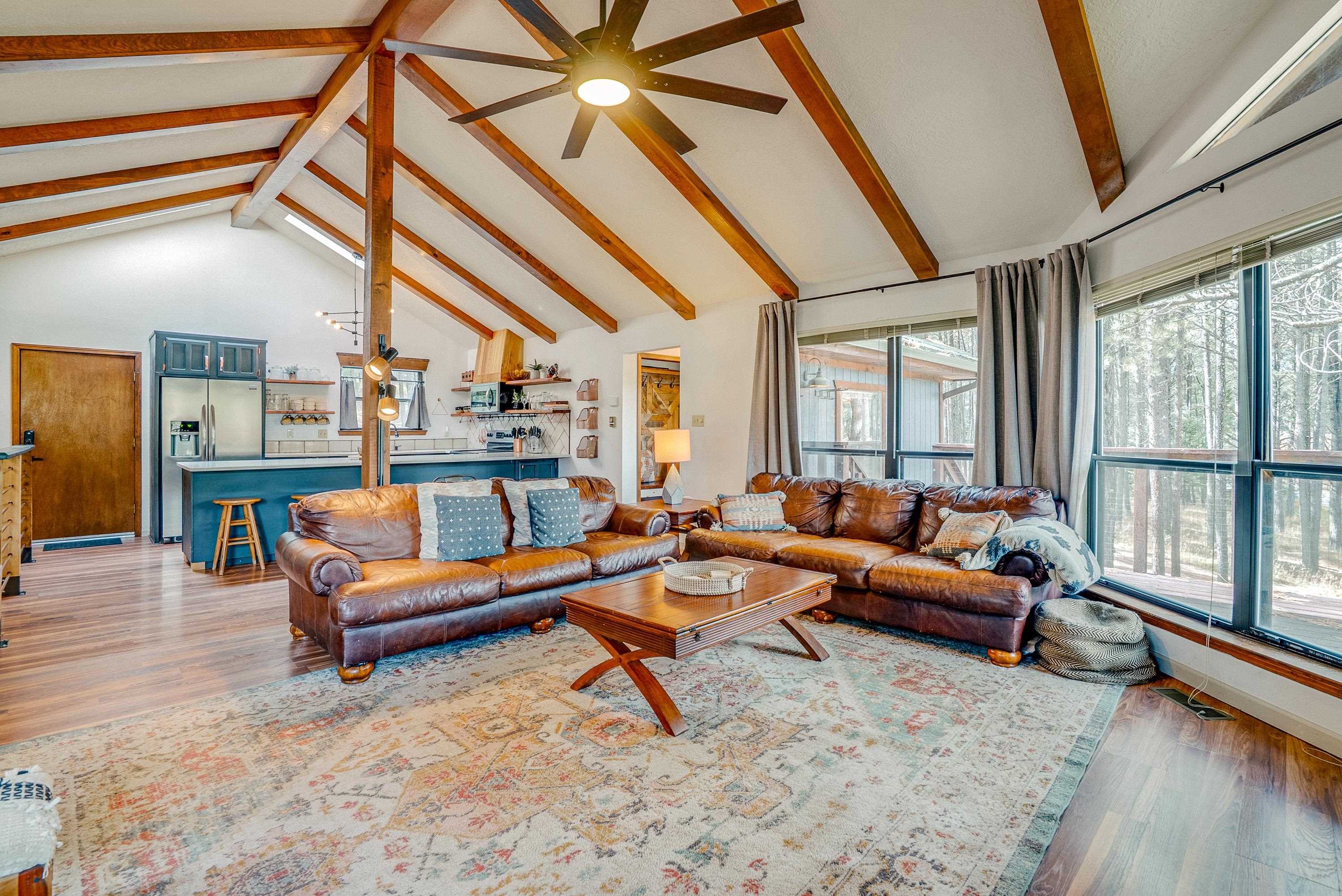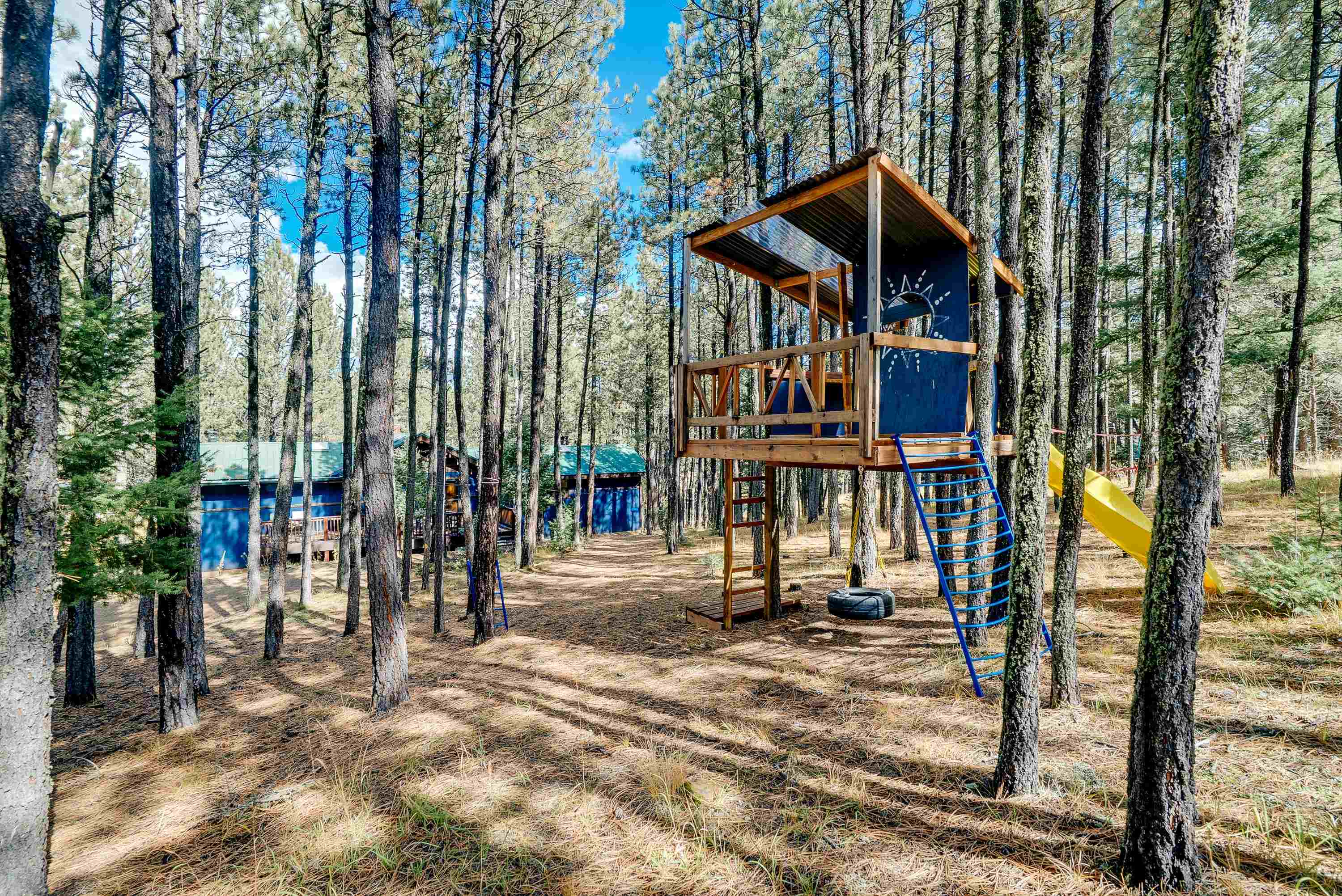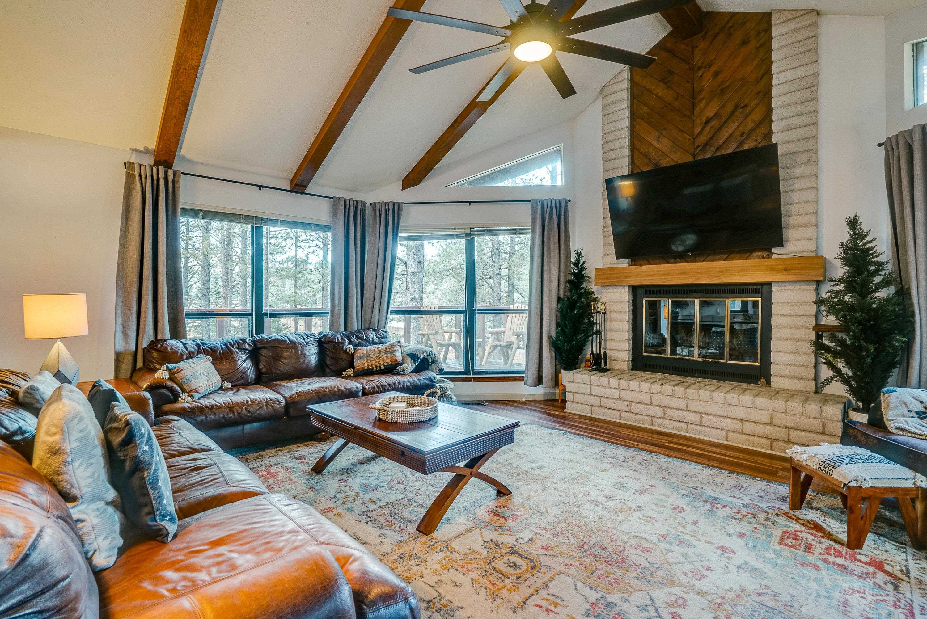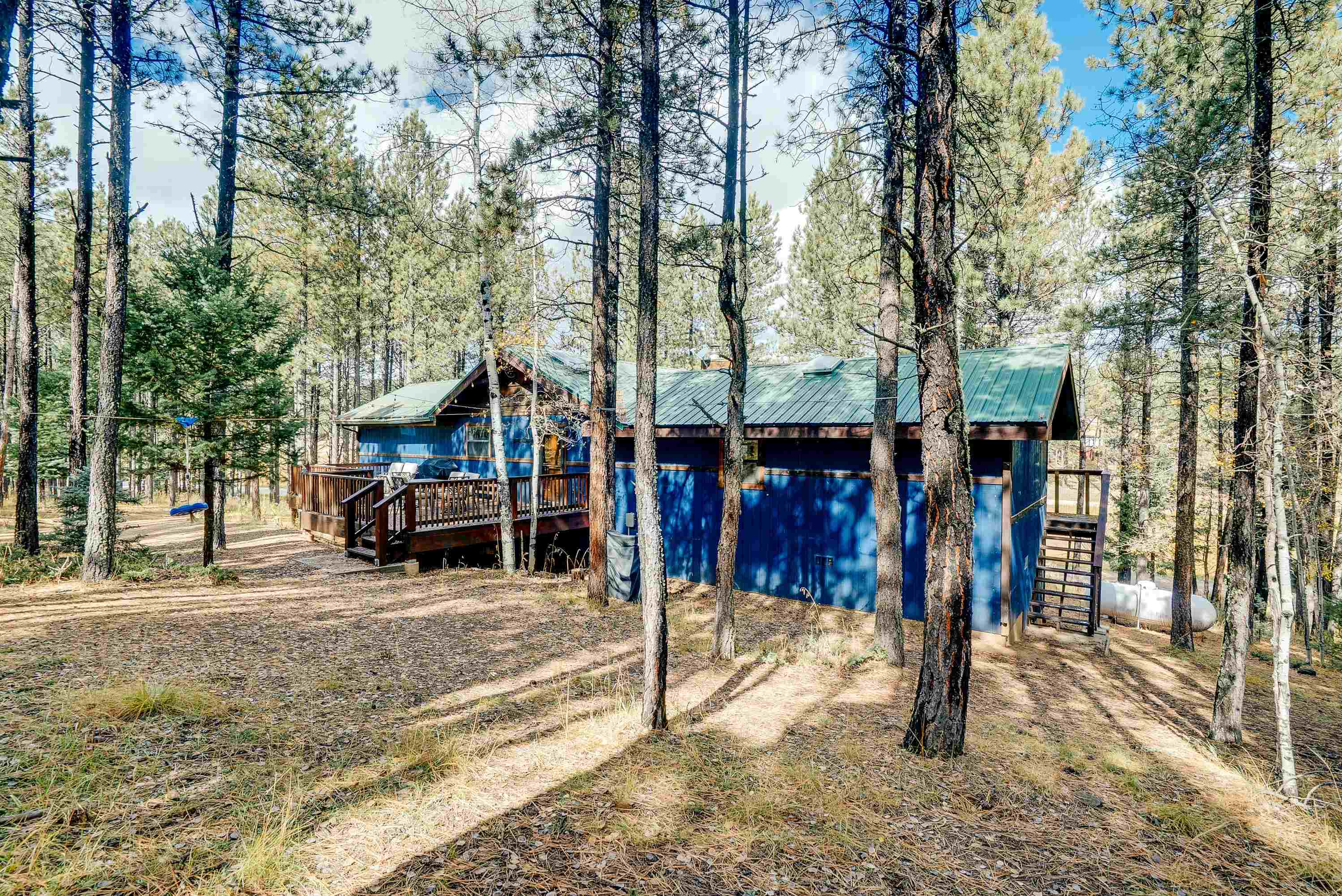 Tucked low in the Moreno Valley for easy, year-round access, this peaceful mountain retreat captures the best of Angel Fire living. Surrounded by towering pines on more than an acre of forested privacy, with a greenbelt across the street and no neighbors in sight, it’s a place where the only sounds you’ll hear are birdsong and the wind moving through the trees. Here, the days move at the pace of mountain life. Hop on your UTV or golf cart and ride to the Country Club, tee off at the golf course, or wander nearby hiking trails under clear summer skies. Just minutes away, Monte Verde Lake invites you to cast a line for trout, paddleboard or canoe across calm mountain waters, or stroll around its scenic shoreline. And when winter arrives, you’re only a short drive from the ski mountain, Nordic Center, and sledding hill, then back home to a cozy wood-burning fire and the hush of the forest. Inside, rustic charm meets modern comfort. Quartz and marble countertops, LVP flooring, and a wood-burning fireplace create a warm, welcoming vibe. With four bedrooms and three full baths, there’s space for everyone to gather. Outside, the zip-line, fort, and slack-line turn the backyard into a forest playground for kids and adults alike. Thoughtfully furnished and beautifully styled, this home is offered fully furnished and turn-key, right down to the details, so you can start enjoying it from day one. Whether you’re looking for a personal retreat, a family getaway, or a ready-to-go short-term rental with sleeping for eight, 57 Sarazen Terrace delivers the freedom, connection, and serenity you’ve been searching for. Bring your suitcase and toothbrush, and step straight into Angel Fire living. To see everything included in the sale, contact your favorite REALTOR® for details and a private showing. AAFPO Membership is $1,695 paid annually (valid May 2025-April 2026)