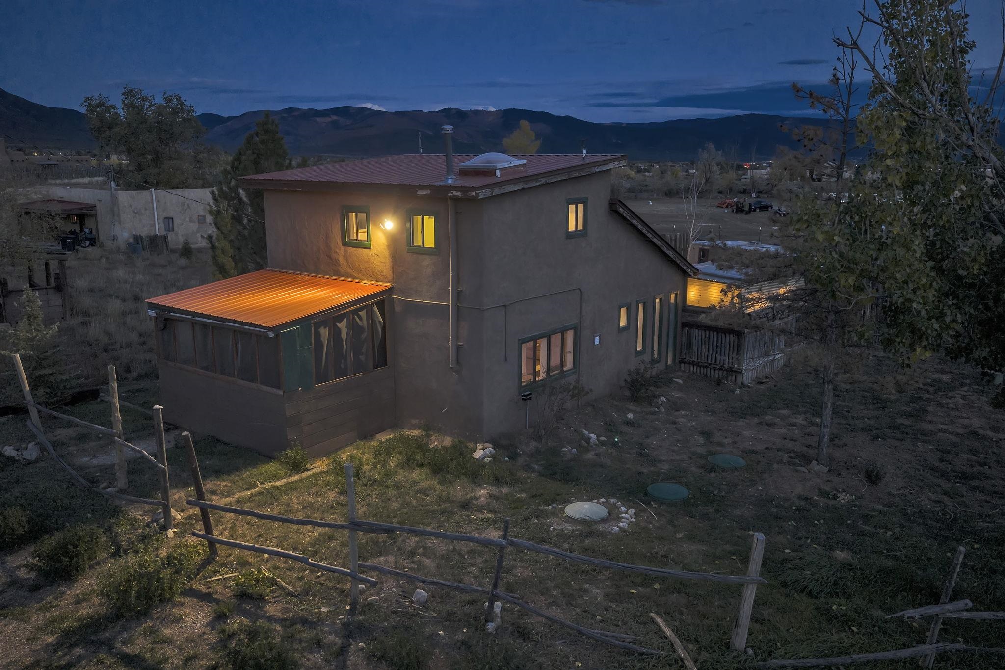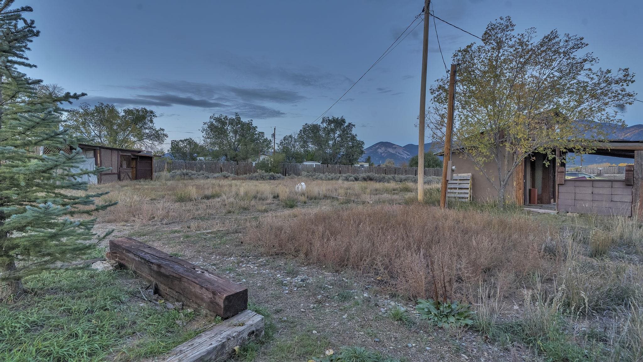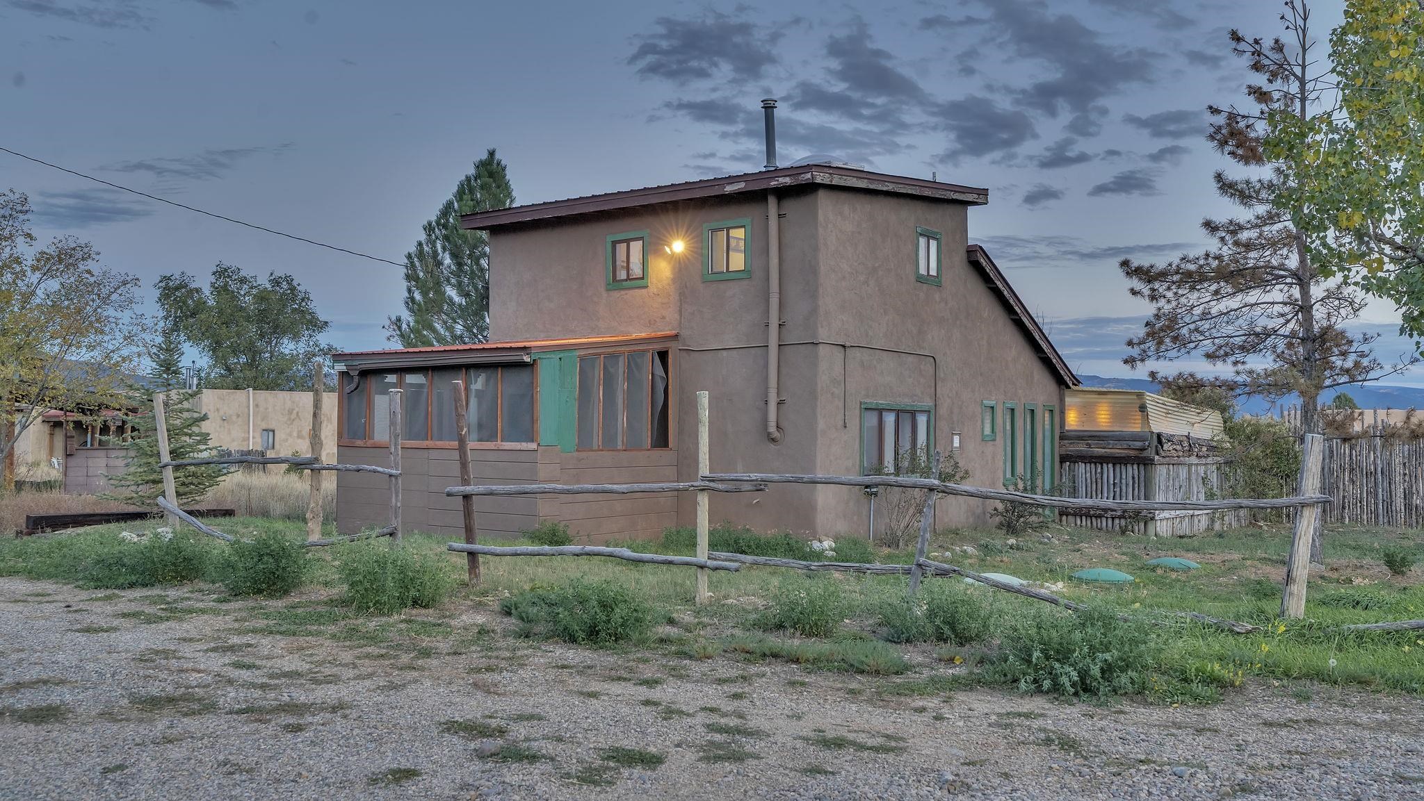 The Taos Escape You've Been Searching For ~ In the Upper Colonias neighborhood conveniently located near Highway 522, you will find this perfect little home situated on three-quarter acres of land with stellar mountain views. The residence capitalizes on panoramic southern exposure which helps to keep the home nice and warm naturally. Inside, the fluid, open-plan is enriched by a traditional kiva fireplace, a reclaimed Spanish-era timber beam, with classic brick floors. The upper level contains a private sanctuary, complete with slate flooring and magnified mountain views. The exterior features a small portal with bistro lighting beside the garden and a secure, fenced perimeter for pets. The grounds are surrounded by trees, punctuated by towering ponderosa pines and aspen. A detached, two-story annex (currently an artist's refuge) offers additional potential, and can possibly be converted to an equine enclosure, offering forty linear feet of secure storage. Here, you will be few minutes from the Taos Ski Valley, the Town of Taos, John Dunn Bridge at the Rio Grande, and many more desirable locations for outdoor exploring. this property presents a rare investment opportunity or a deeply personalized homestead, come see for yourself!
