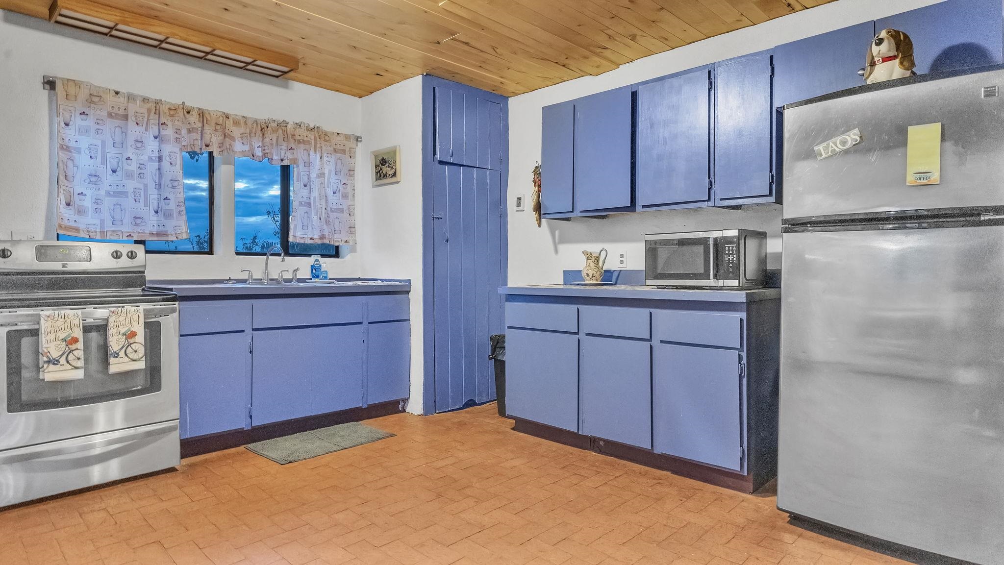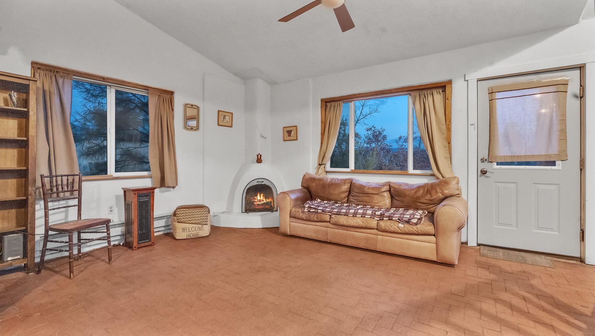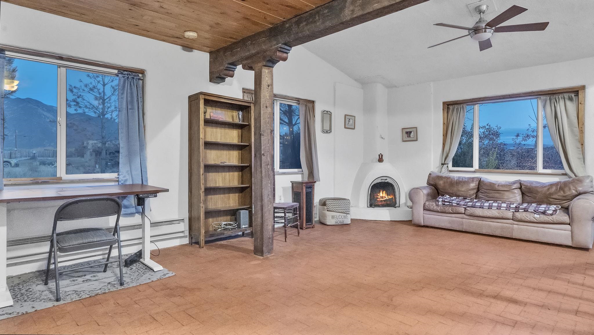 The Taos Escape You've Been Searching For ~ In the Upper Colonias neighborhood conveniently located near Highway 522, you will find this perfect little home situated on three-quarter acres of land with stellar mountain views. The residence capitalizes on panoramic southern exposure which helps to keep the home nice and warm naturally. Inside, the fluid, open-plan is enriched by a traditional kiva fireplace, a reclaimed Spanish-era timber beam, with classic brick floors. The upper level contains a private sanctuary, complete with slate flooring and magnified mountain views. The exterior features a small portal with bistro lighting beside the garden and a secure, fenced perimeter for pets. The grounds are surrounded by trees, punctuated by towering ponderosa pines and aspen. A detached, two-story annex (currently an artist's refuge) offers additional potential, and can possibly be converted to an equine enclosure, offering forty linear feet of secure storage. Here, you will be few minutes from the Taos Ski Valley, the Town of Taos, John Dunn Bridge at the Rio Grande, and many more desirable locations for outdoor exploring. this property presents a rare investment opportunity or a deeply personalized homestead, come see for yourself!