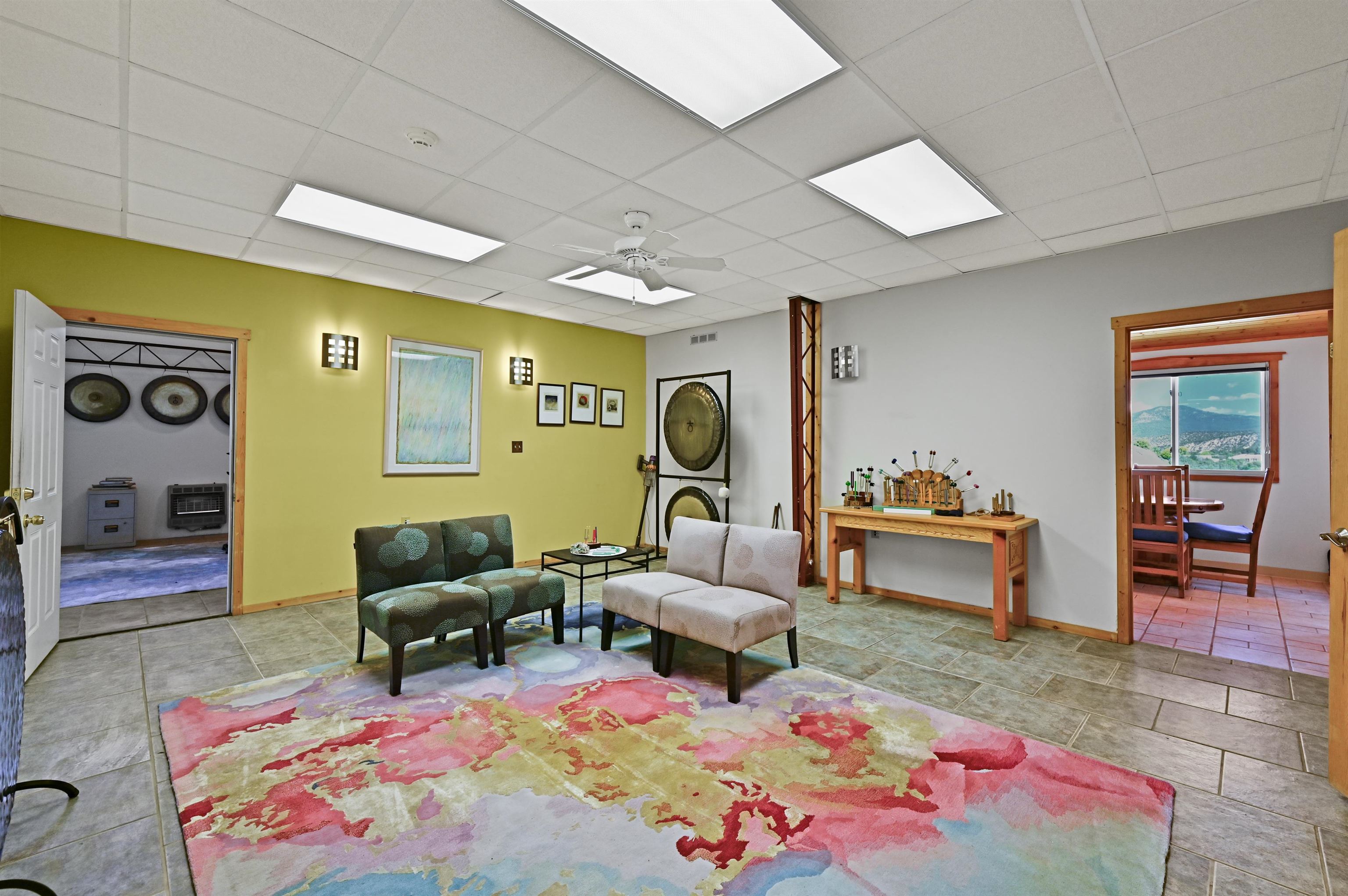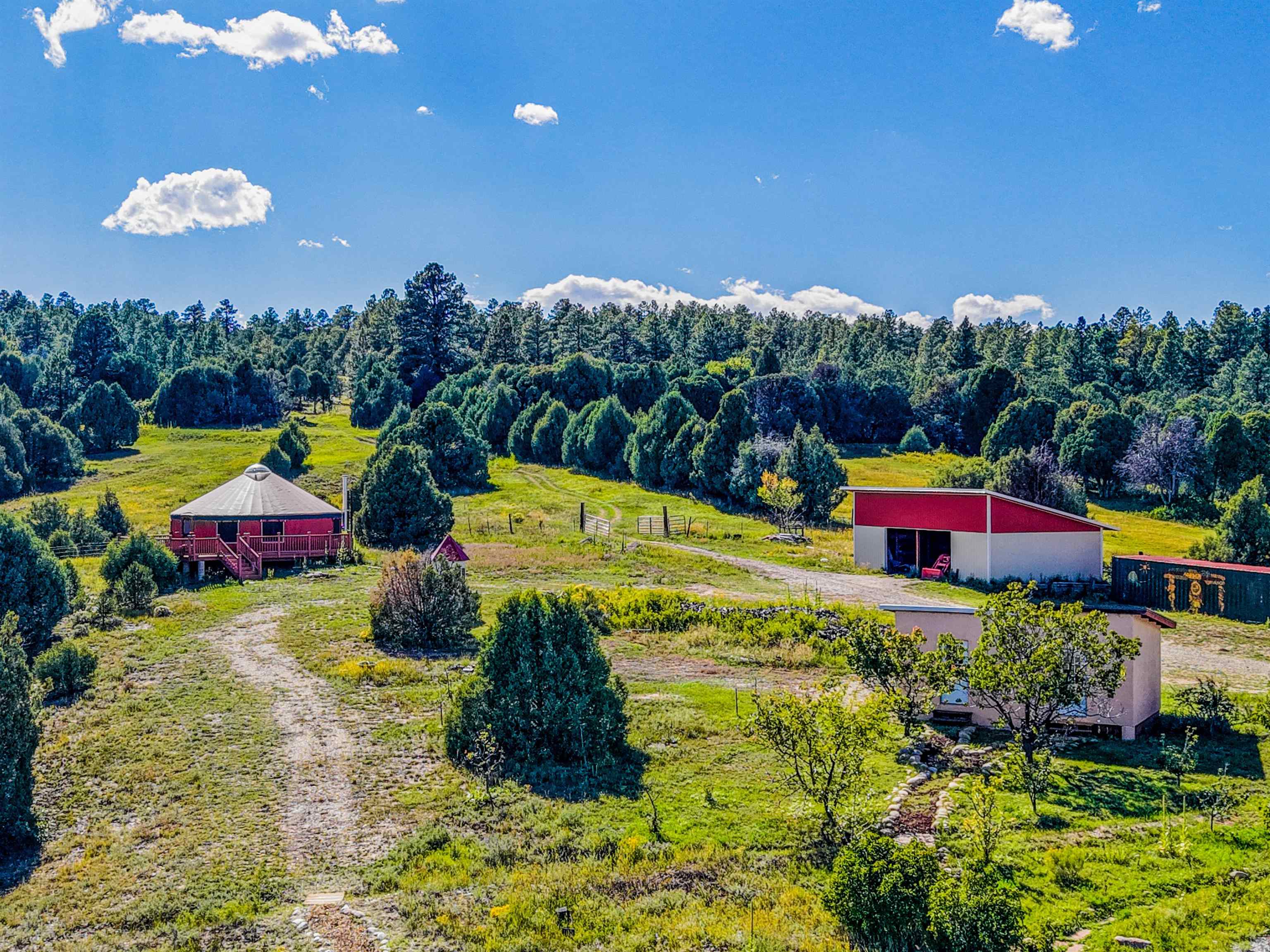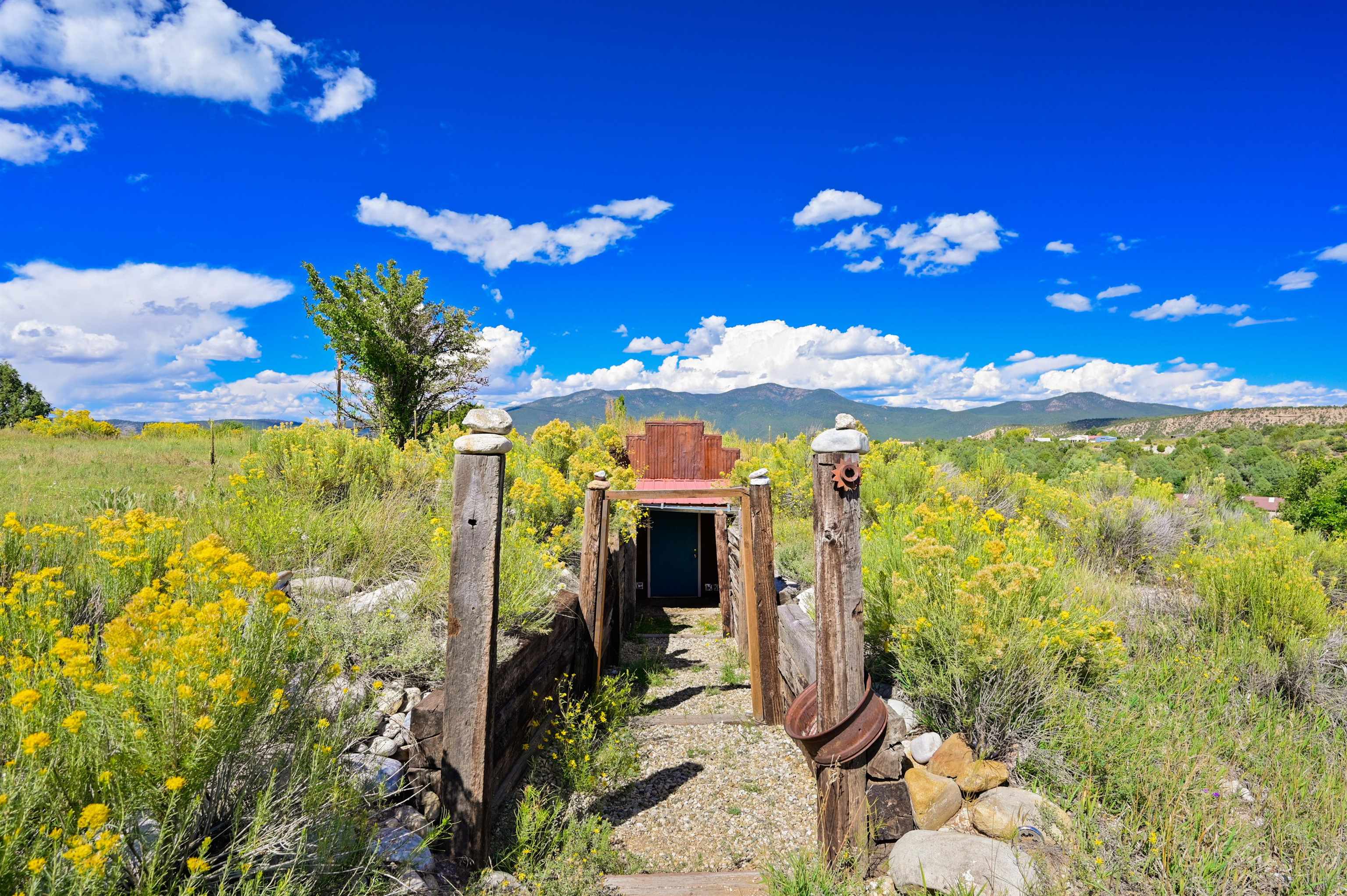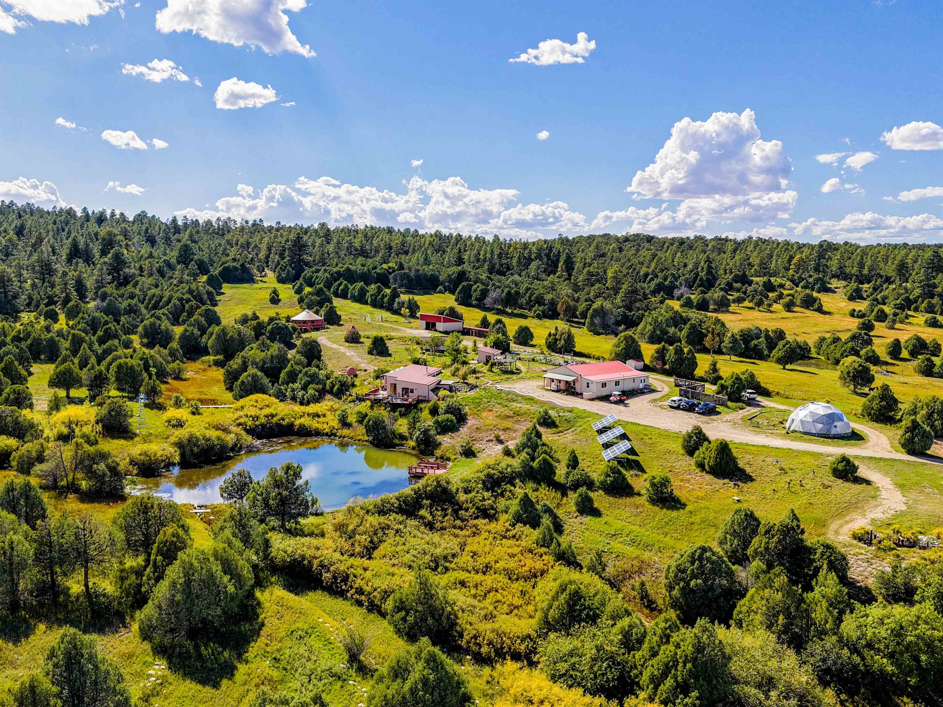 A truly rare 34-acre mountain retreat awaits, nestled in the Sangre de Cristo Mountains with stunning views of Jicarita Peak and Truchas Peaks. This exceptional, self-sufficient, and sustainably developed property is perfect for a small family business, equestrian estate, or serene retreat center. The total living space of 4,100 sq ft includes a charming 1,600 sq ft earth-bermed 2-bedroom home featuring custom stone floors, vigas, radiant in-floor heat in the kitchen and master suite, and an updated kitchen with a Wolf Stove and granite countertops. The home is designed for energy efficiency, maximizing solar gain, and has a wrap-around deck with captivating pond and mountain views. The property also boasts a 2,225 sq ft office/mixed-use building (zoned for cottage industry, previously a successful institute), a 275 sq ft studio/guest house with a half-bath, and a 30’ insulated yurt with off-grid solar, ideal for meditation or a classroom—offering immense flexibility and separate spaces for living, working, and gathering. Outside, find unparalleled amenities dedicated to Earth Stewardship and conservation: • 10 irrigated acres with water rights for farming or grazing. • Rustic 3-stall horse barn and tack room, horse fencing throughout property. • 33’ geodesic Growing Dome for year-round production. • A comprehensive water catchment system utilizing heavy-duty roof guttering on all buildings and multiple cisterns. • A quarter-acre pond with a Trex deck, fed by wetlands and springs, and aerated by a windmill. • A vast network of maintained trails on forested acres (thinned and managed), offering direct access to the Carson National Forest. Additional features include an owned grid-tied solar array, a root cellar, a 40’ cargo container, and extensive landscaping with drip irrigation. This property is a rare gem, beautifully developed, and ready for its next steward.