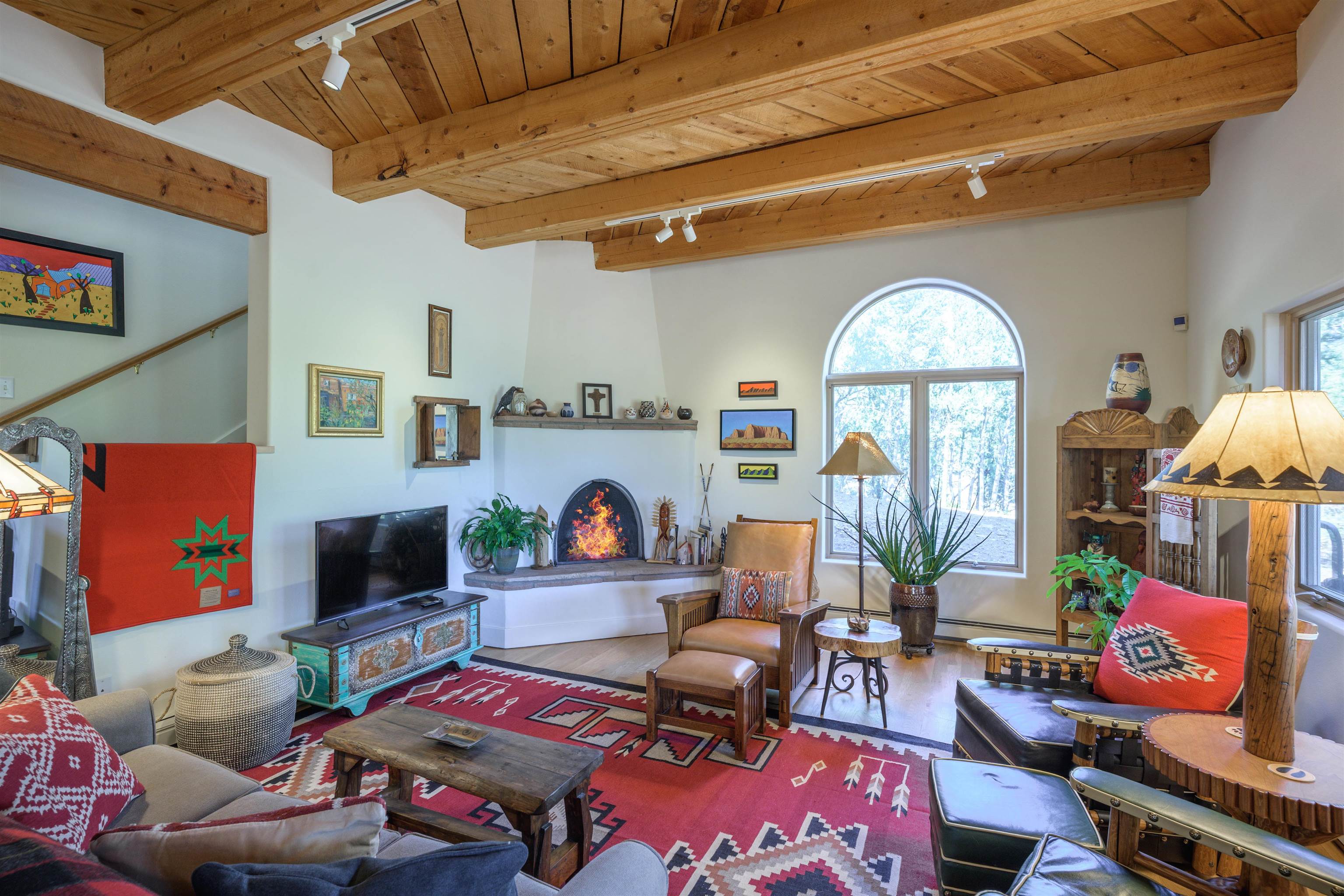 Peaceful mountain living meets timeless New Mexico charm in this beautifully updated territorial-style home on 2.54 wooded acres between Taos Ski Valley and the Town of Taos. Thoughtfully designed for comfort and connection to nature, this 3-bedroom, 2.5-bath home offers 2,064 sq ft of warm, light-filled living space. The main level features a welcoming living room with a southwest-style kiva fireplace, open-beam ceilings, and large windows that frame forest and mountain views. The inviting kitchen blends modern convenience with traditional detail and opens to the dining area for easy entertaining. The private primary suite has an updated ensuite bath, while the upper level provides a spacious multi-purpose room ideal for guests, a studio, or a family retreat. Enjoy expansive outdoor living on two covered decks and a flagstone patio surrounded by low adobe walls—perfect for morning coffee or evenings by the fire pit under starry skies. The detached garage, mature trees, and serene mountain backdrop make this property a rare Taos-area gem—move-in ready and minutes to Arroyo Seco, hiking, and skiing. This home is ready for your arrival to enjoy the Winter Holidays & Ski Season Joy! PLEASE NOTE: The current owners will need to remain in the property until the end of January 2026. They are open to closing early and engaging in a lease-back agreement until their departure. HOA fee is $200/yr for road maintenance. The seller has shared a design plan for a potential addition to the house - it is located under the "documents" section.