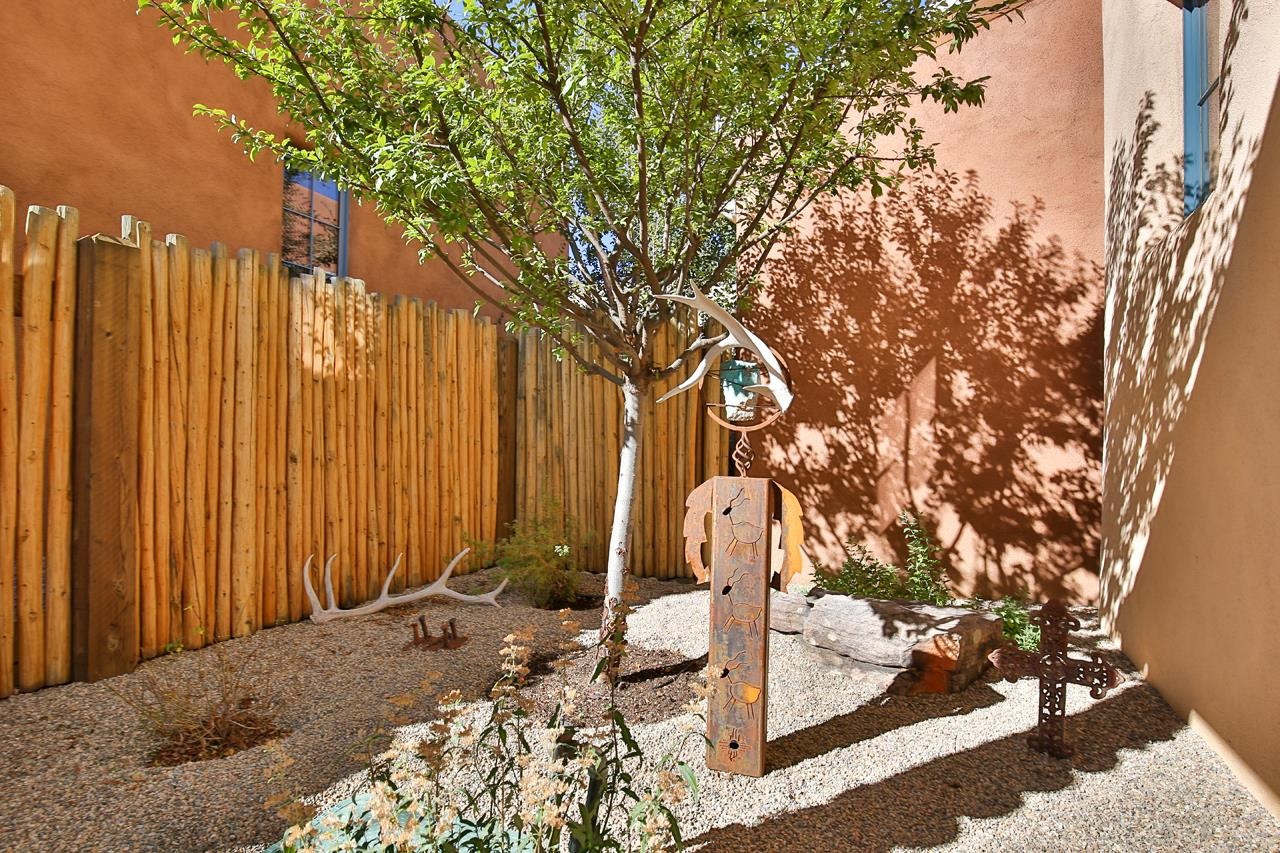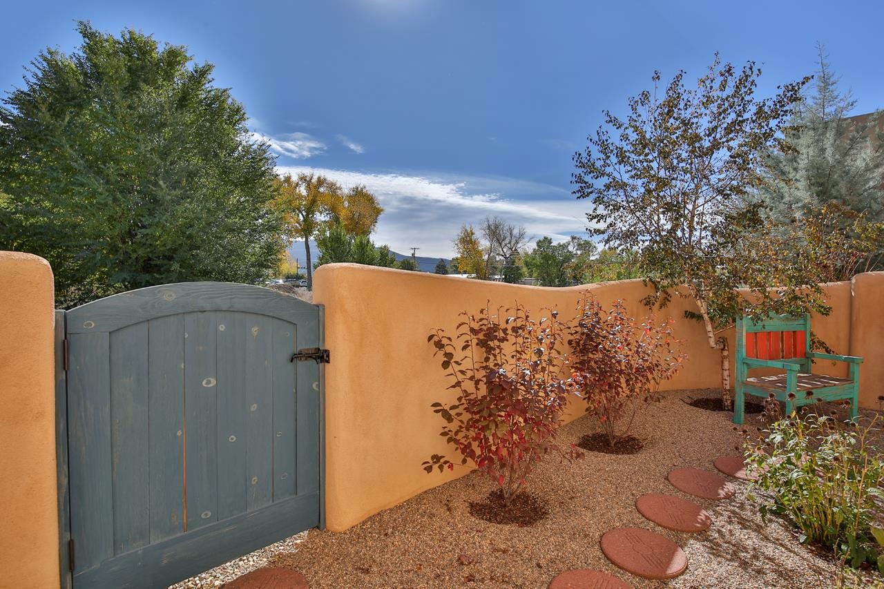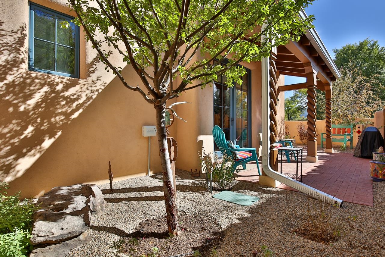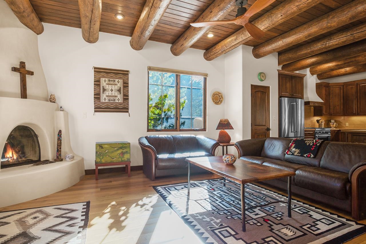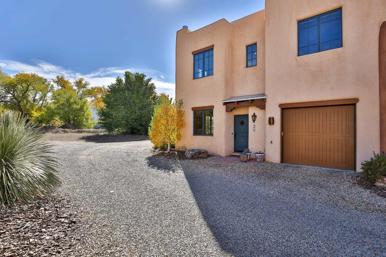 Move right in and start living the good life; no to-do list required! This stunning, high-quality condo in the heart of town is as turnkey as they come. Beautifully maintained and barely lived in, it feels brand new but with all the benefits of thoughtful, careful ownership. Every detail shines, every finish sparkles. This is the kind of home where you can drop your bags, pour a drink, and immediately feel at home. As a desirable corner end unit, this condo enjoys extra privacy, wonderful natural light, and beautifully landscaped surroundings that make it feel like its own little oasis but is under a mile to Taos Plaza. Inside, the open-concept great room glows with natural light, featuring gorgeous white oak floors, soaring viga-accented ceilings, and a cozy gas kiva fireplace for that perfect Taos touch. The kitchen is a dream. Knotty Alder cabinetry with soft-close hinges, sandstone countertops, premium KitchenAid appliances with a Bertazzoni range. The layout flows effortlessly from kitchen to dining area to a private backyard with a covered portal, perfect for sunny brunches or starlit evenings. Upstairs, you’ll find three spacious bedrooms, views straight toward Taos Mountain, and two spa-like bathrooms finished in travertine. The primary suite is serene and elegant, with an ensuite bath that feels like a boutique retreat and a plus sized closet for your summer AND winter duds. Every inch of this home whispers quality, from the soundproofed walls, 2x8 construction and Sierra Pacific windows to the Hunter Douglas shades, Kohler fixtures, and built-in radon mitigation system. Even the roof and wall insulation levels are top tier, (R51 and R33) to be exact. With an attached garage, unbeatable in-town location, and not a single project in sight, this condo is pure Taos ease, polished, pristine, and absolutely move-in ready.