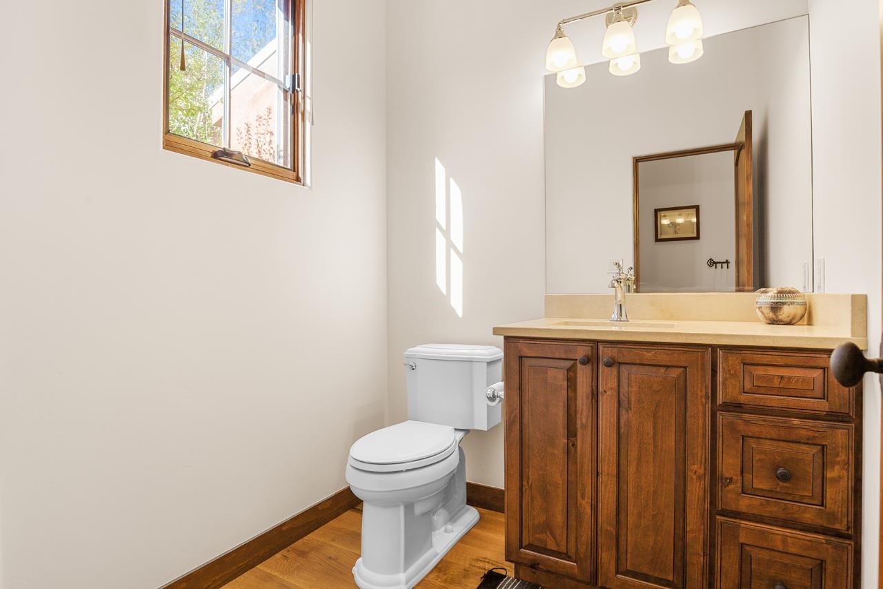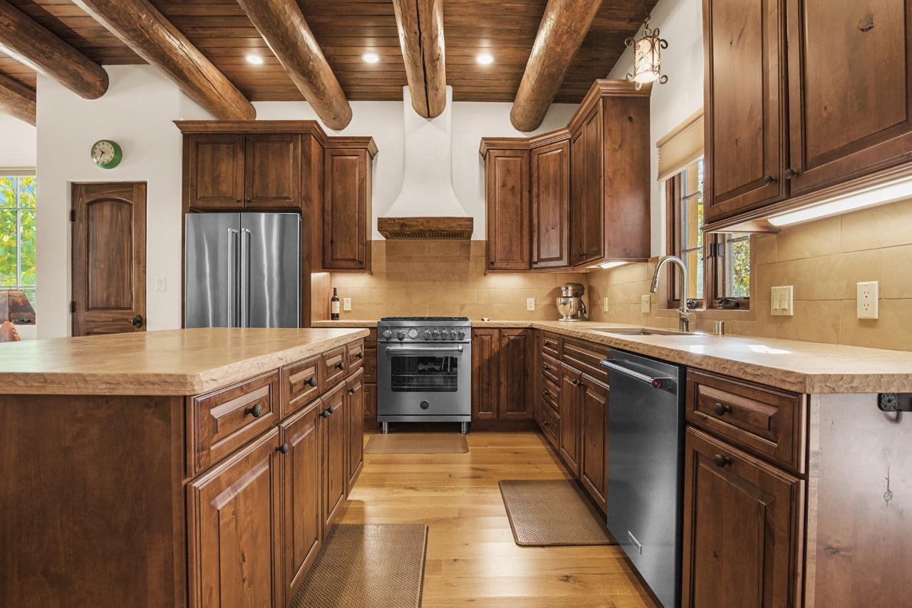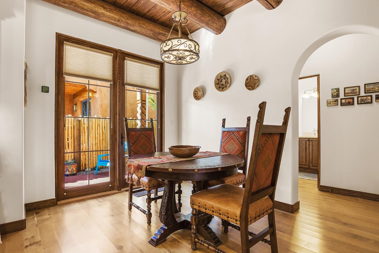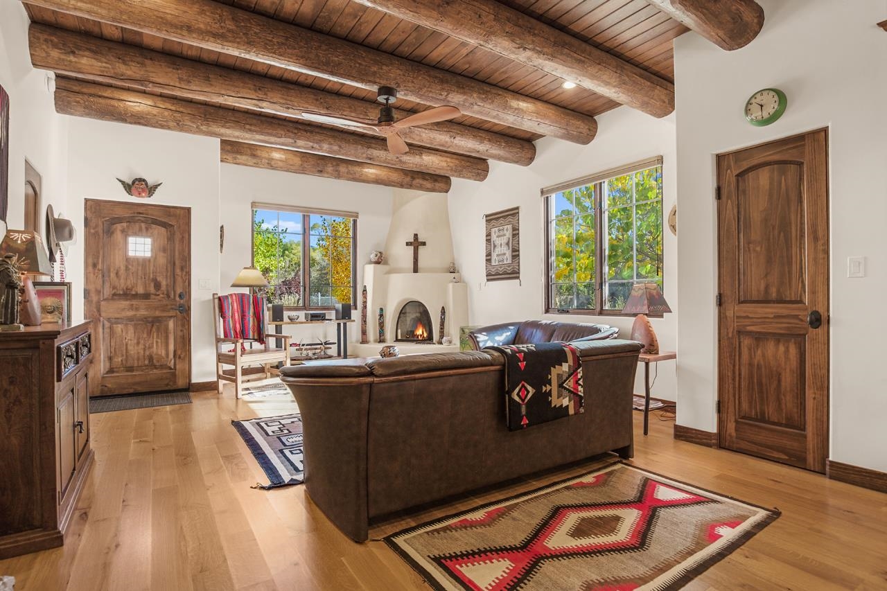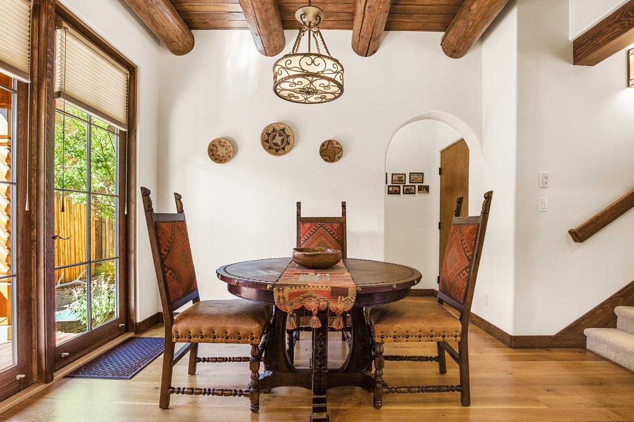 Move right in and start living the good life; no to-do list required! This stunning, high-quality condo in the heart of town is as turnkey as they come. Beautifully maintained and barely lived in, it feels brand new but with all the benefits of thoughtful, careful ownership. Every detail shines, every finish sparkles. This is the kind of home where you can drop your bags, pour a drink, and immediately feel at home. As a desirable corner end unit, this condo enjoys extra privacy, wonderful natural light, and beautifully landscaped surroundings that make it feel like its own little oasis but is under a mile to Taos Plaza. Inside, the open-concept great room glows with natural light, featuring gorgeous white oak floors, soaring viga-accented ceilings, and a cozy gas kiva fireplace for that perfect Taos touch. The kitchen is a dream. Knotty Alder cabinetry with soft-close hinges, sandstone countertops, premium KitchenAid appliances with a Bertazzoni range. The layout flows effortlessly from kitchen to dining area to a private backyard with a covered portal, perfect for sunny brunches or starlit evenings. Upstairs, you’ll find three spacious bedrooms, views straight toward Taos Mountain, and two spa-like bathrooms finished in travertine. The primary suite is serene and elegant, with an ensuite bath that feels like a boutique retreat and a plus sized closet for your summer AND winter duds. Every inch of this home whispers quality, from the soundproofed walls, 2x8 construction and Sierra Pacific windows to the Hunter Douglas shades, Kohler fixtures, and built-in radon mitigation system. Even the roof and wall insulation levels are top tier, (R51 and R33) to be exact. With an attached garage, unbeatable in-town location, and not a single project in sight, this condo is pure Taos ease, polished, pristine, and absolutely move-in ready.