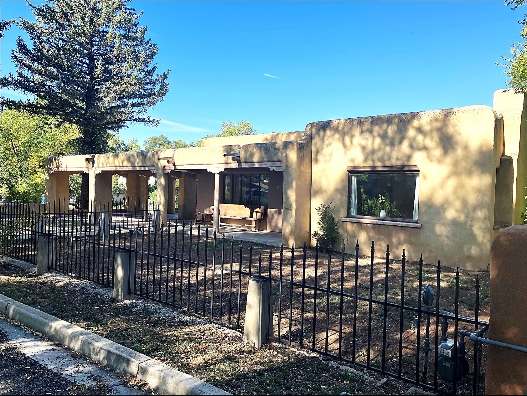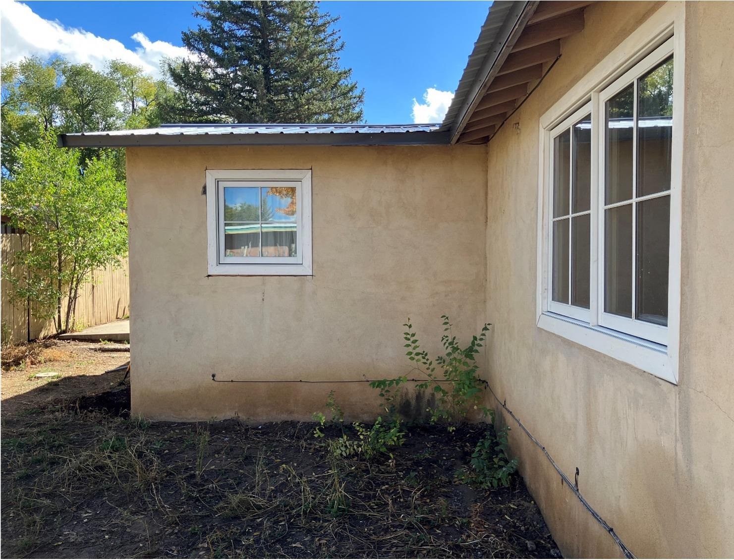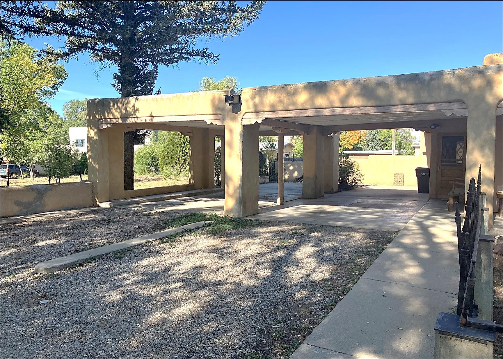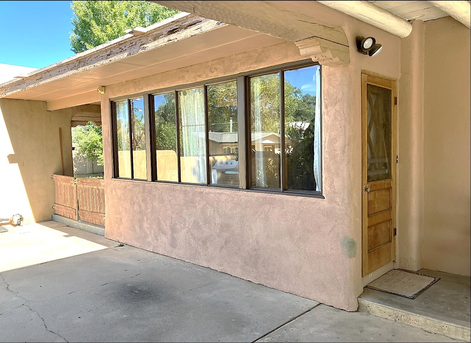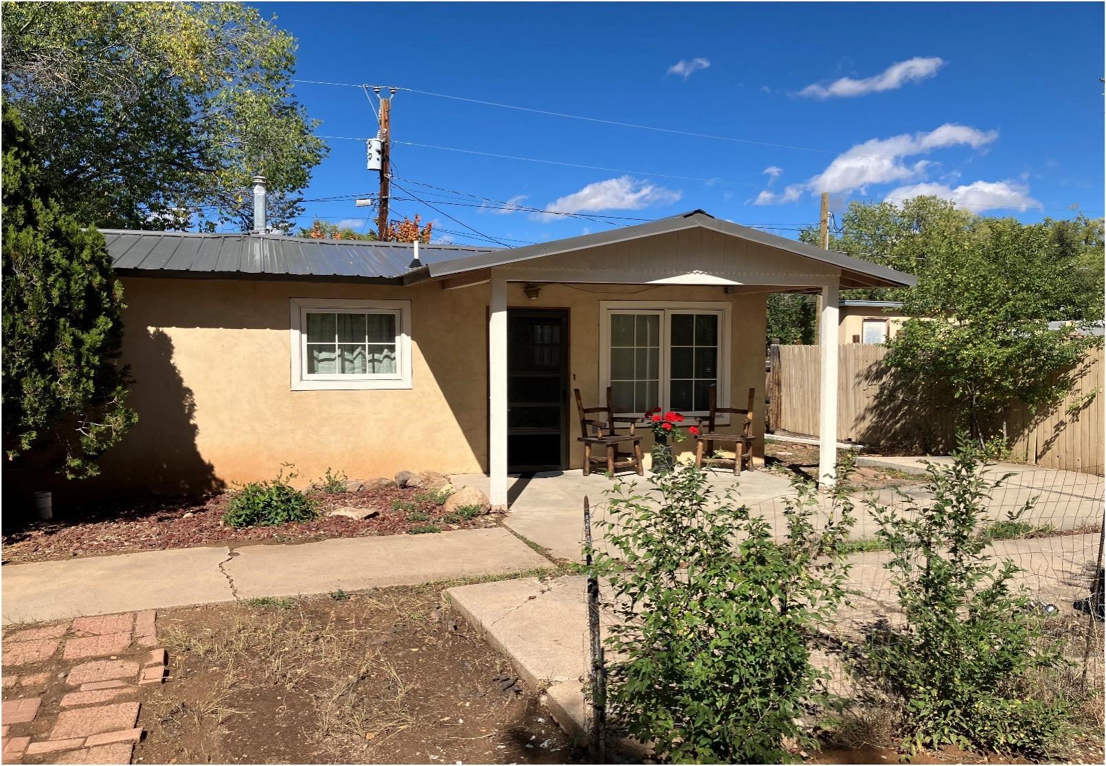 This traditional Taos property sits on two lots in the historic Lund subdivision of downtown Taos. The main house, in Pueblo/Southwestern style, has 3 bedrooms and two bathrooms, while the charming casita has one bedroom, one bath. Built in 1951, the 1,392 sq.ft. main house has a fireplace, galley kitchen, and separate laundry room. House has hot water baseboard heating with an additional wall heater in the livingroom. The generous front and back yards provide ample space for gardening and entertaining. The main house also has two attached carports. Original pecan wood paneling and built-ins throughout. Property features preserved authentic, retro design elements that are hard to find today. Update or restore this original and unique architectural home in the historic Taos district. The one-bedroom, 762 sqft casita was built in 1987 and has new Sierra Vista windows and metal roof, with wall heaters in the bedroom and living area. The casita has a large, private yard with several patios. Walk to everything in downtown Taos, including the historic Taos Plaza, the Taos Inn, the Harwood Museum, restaurants and shops. Fast, fiber-optic internet available in both houses.