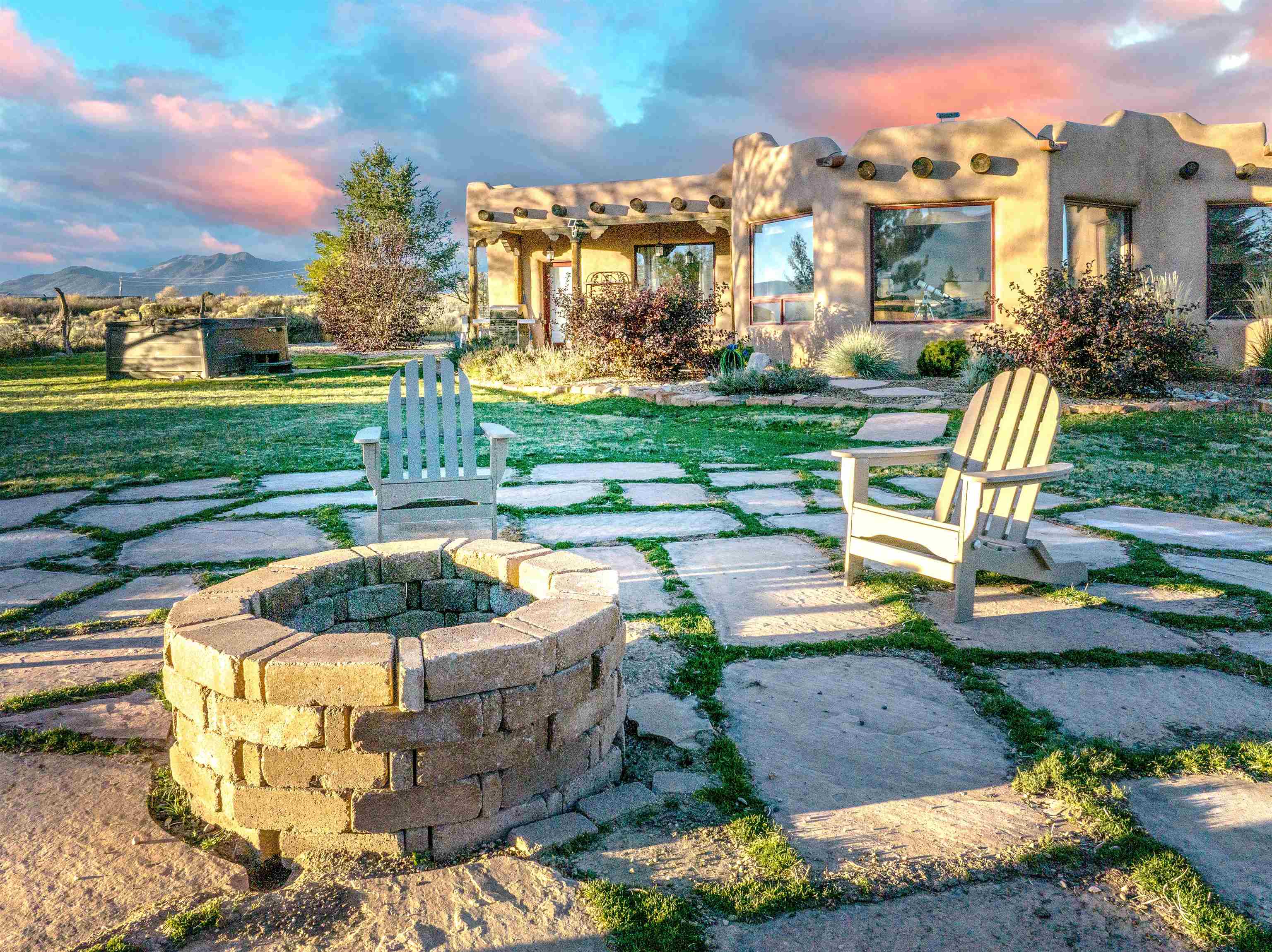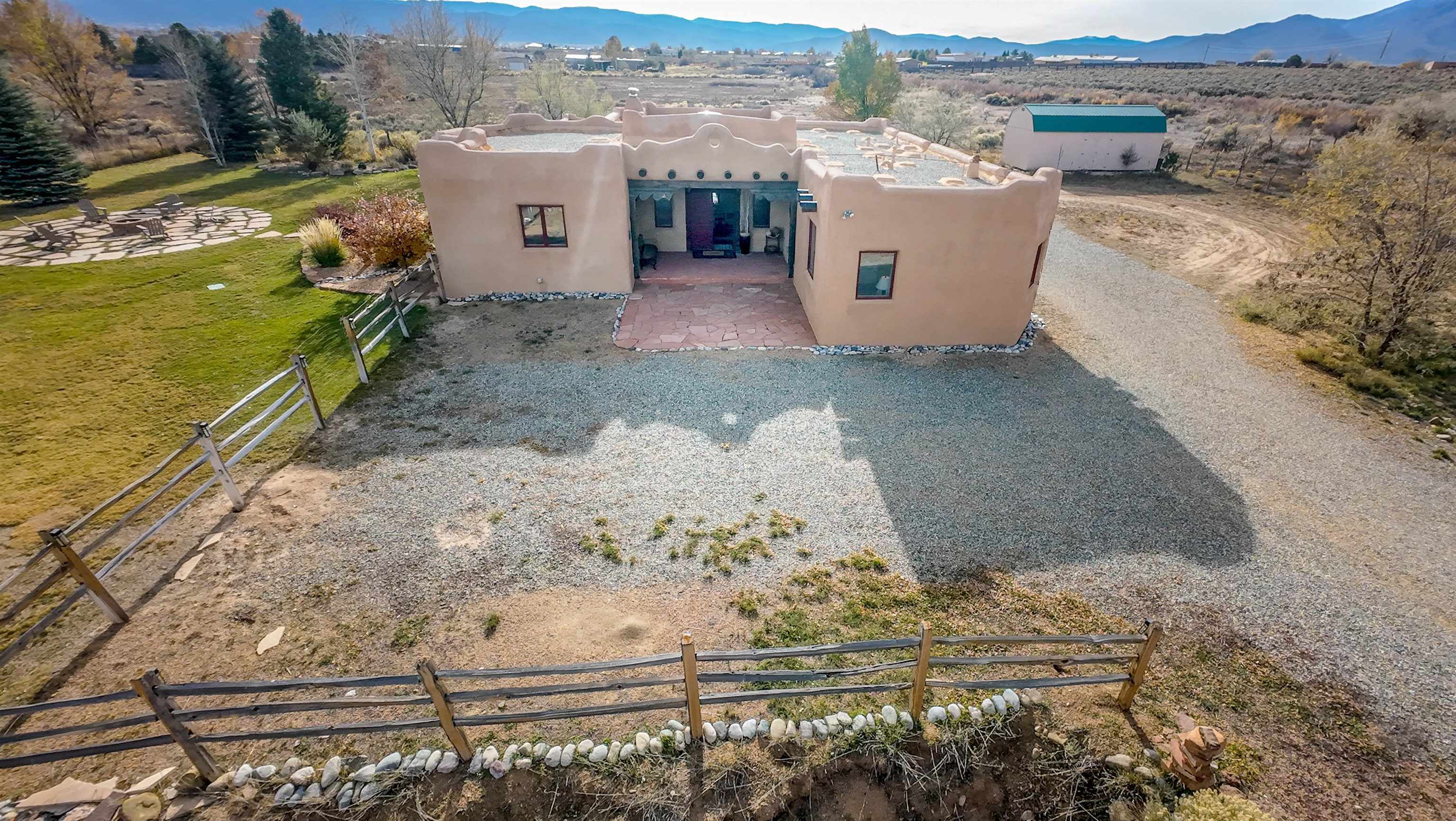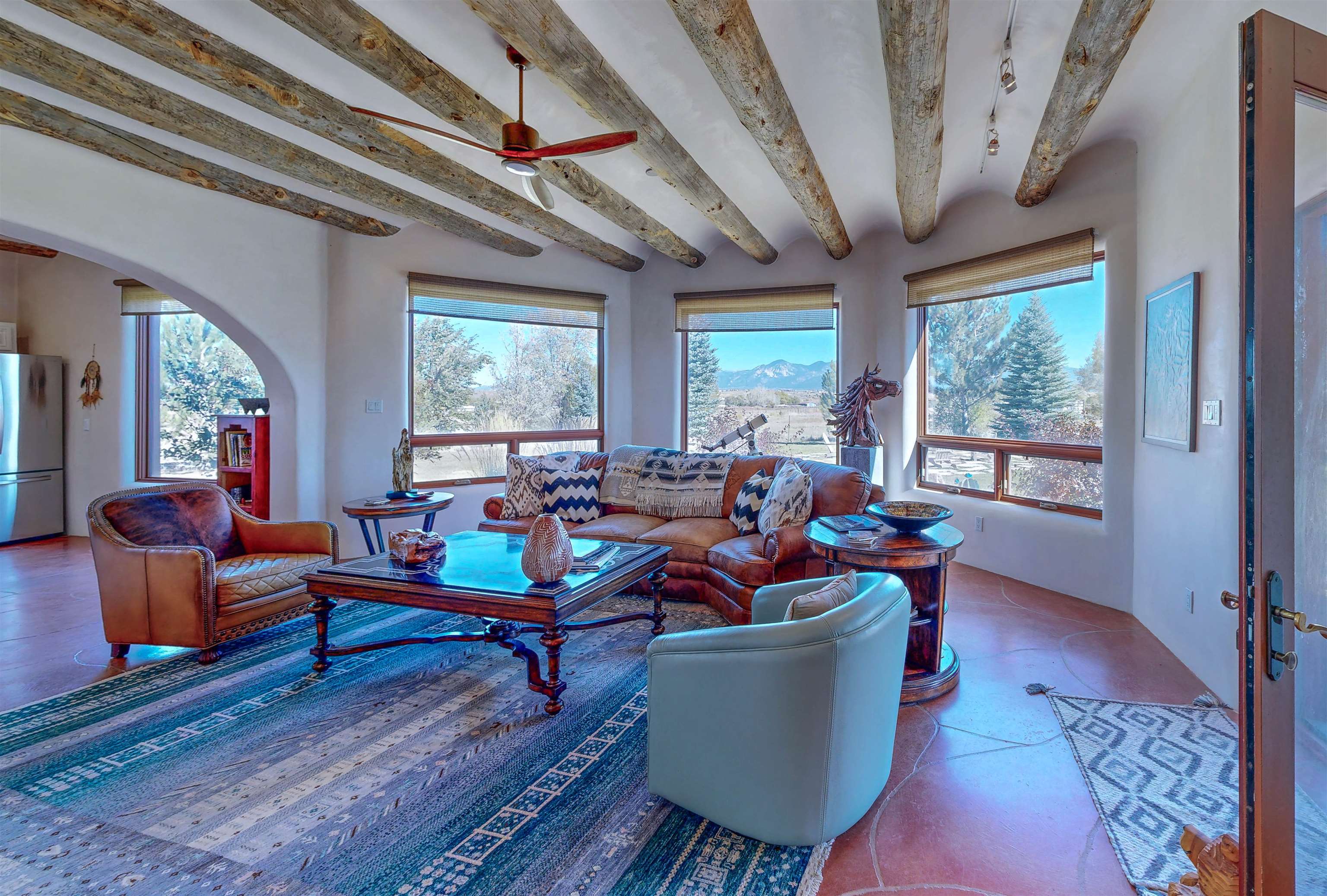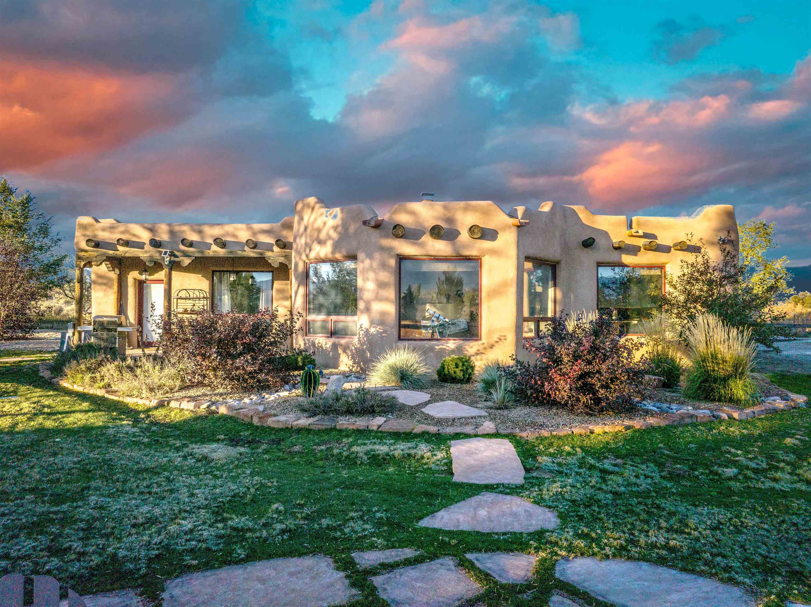 Welcome to Casa Vogue - timeless elegance and sophistication abound with this home designed by Nona Wesley, owner of Maya Designs Inc. of Taos, and built by Felipe Rodriguez, owner of 90 Degree Corners. This stunning three-bedroom, three-bathroom home with an additional office/study is being sold fully furnished with the absolute finest in elegance and comfort. You immediately enter through the hand carved double doors into an exquisite dining room with a stunning fireplace dividing the living room and dining room. There are very large picture windows with breathtaking views of Taos Mountain from the kitchen and living room areas, and admirable details in every room of the home. This home is perfect for entertaining with the open concept design, and with mountain views for starry nights, sunsets and ultimate privacy. This adobe constructed Pueblo-style home cannot be fabricated in today’s environment, and the artistic details throughout each of the rooms are unmatched. If that is not enough, there are also water rights from the acequia running along the property. Only ten minutes to the Town of Taos, one still feels like you are miles away from the hustle and bustle. This is a true treasure, and it is definitely one not to miss. Check out the exterior drone video, and the interior and exterior video tours on the listing and then schedule your private showing today. You definitely will not regret it.