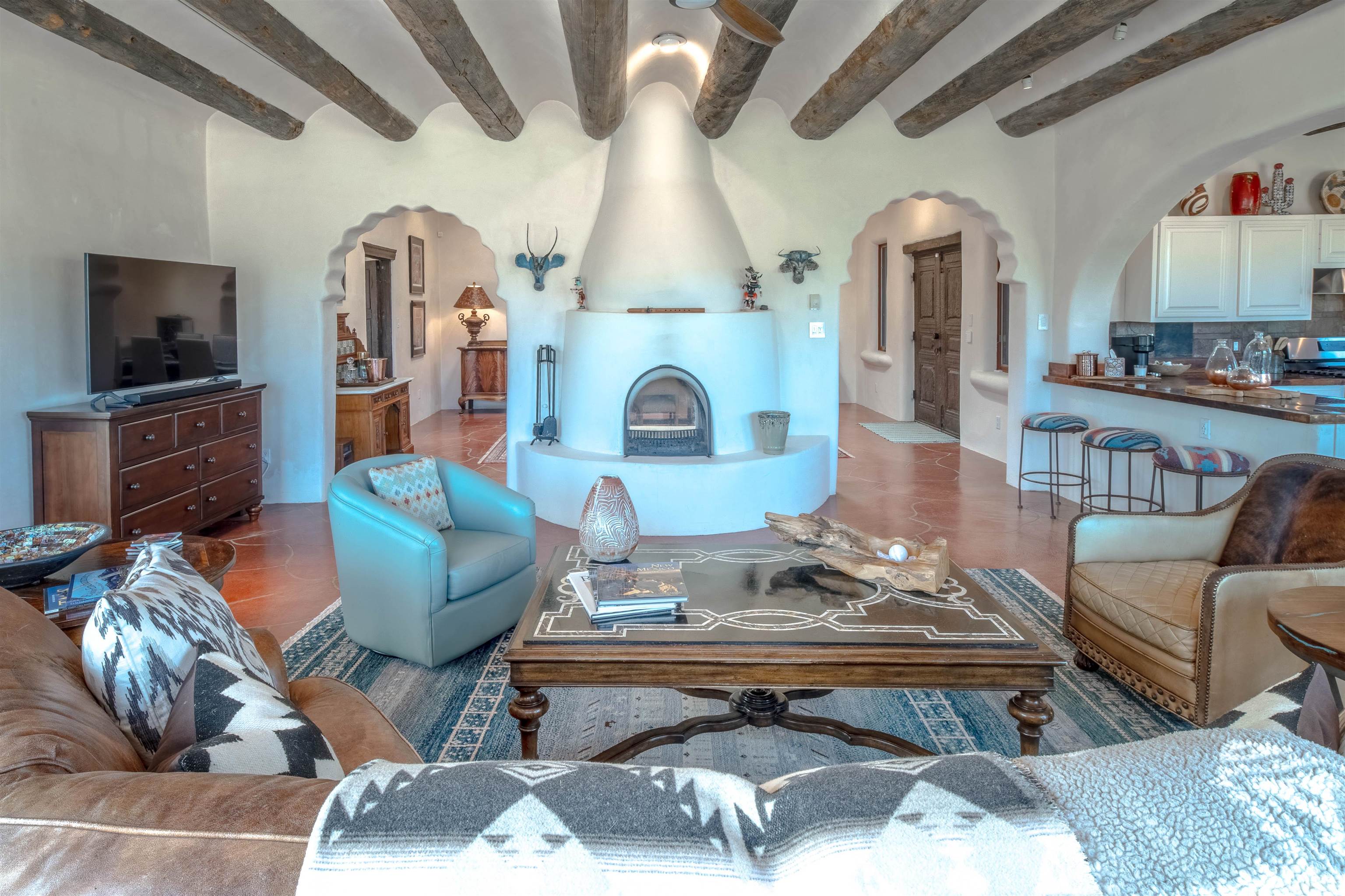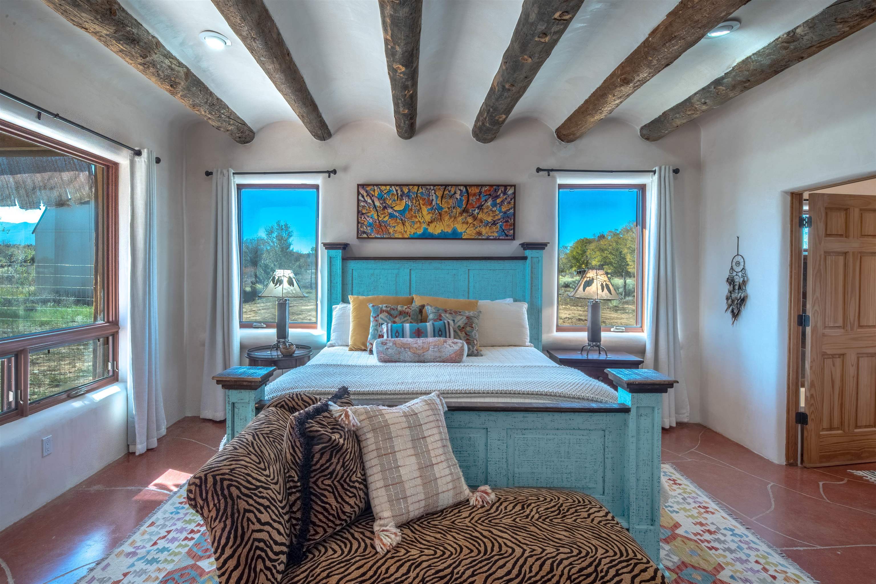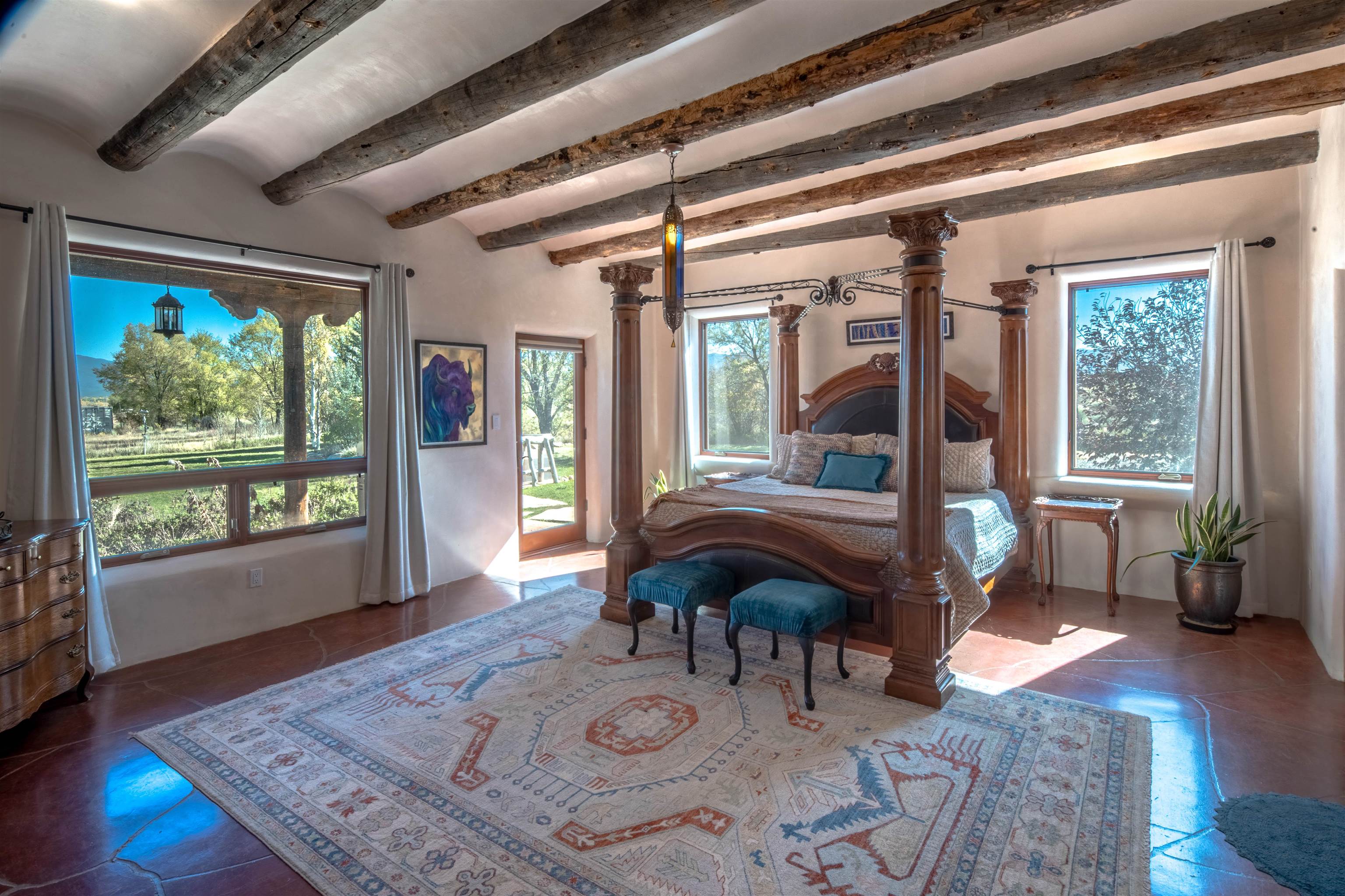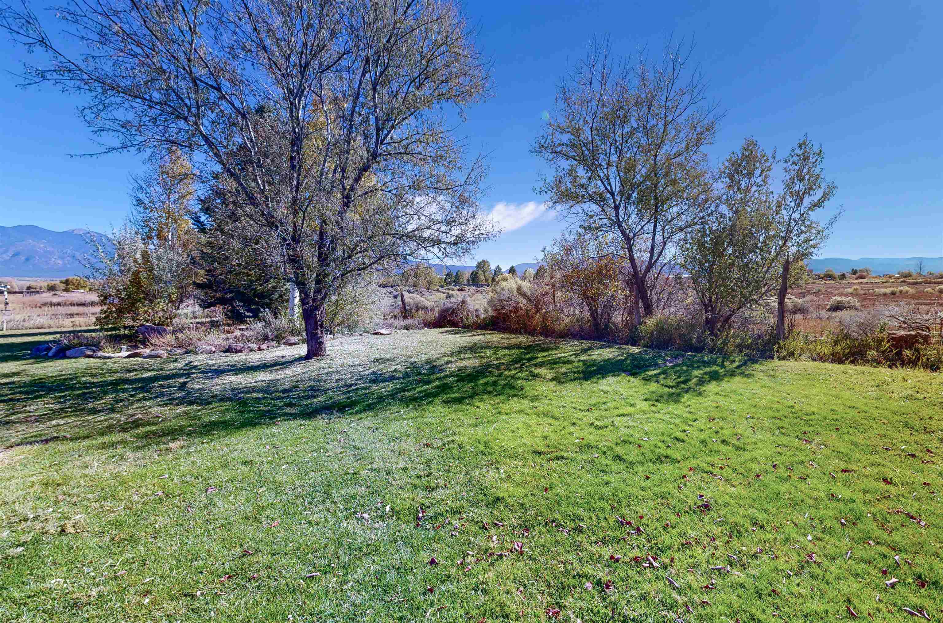 Welcome to Casa Vogue - timeless elegance and sophistication abound with this home designed by Nona Wesley, owner of Maya Designs Inc. of Taos, and built by Felipe Rodriguez, owner of 90 Degree Corners. This stunning three-bedroom, three-bathroom home with an additional office/study is being sold fully furnished with the absolute finest in elegance and comfort. You immediately enter through the hand carved double doors into an exquisite dining room with a stunning fireplace dividing the living room and dining room. There are very large picture windows with breathtaking views of Taos Mountain from the kitchen and living room areas, and admirable details in every room of the home. This home is perfect for entertaining with the open concept design, and with mountain views for starry nights, sunsets and ultimate privacy. This adobe constructed Pueblo-style home cannot be fabricated in today’s environment, and the artistic details throughout each of the rooms are unmatched. If that is not enough, there are also water rights from the acequia running along the property. Only ten minutes to the Town of Taos, one still feels like you are miles away from the hustle and bustle. This is a true treasure, and it is definitely one not to miss. Check out the exterior drone video, and the interior and exterior video tours on the listing and then schedule your private showing today. You definitely will not regret it.