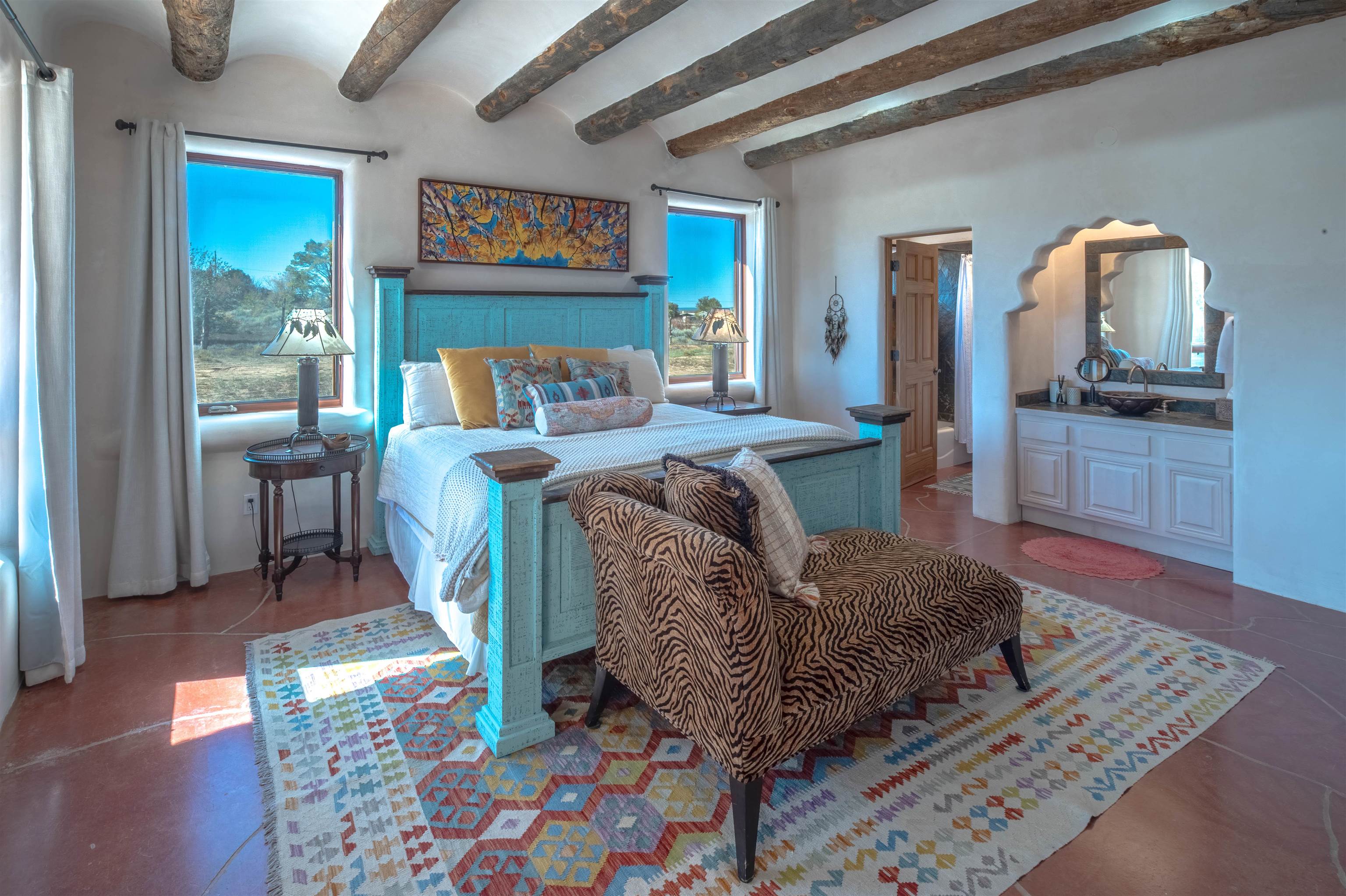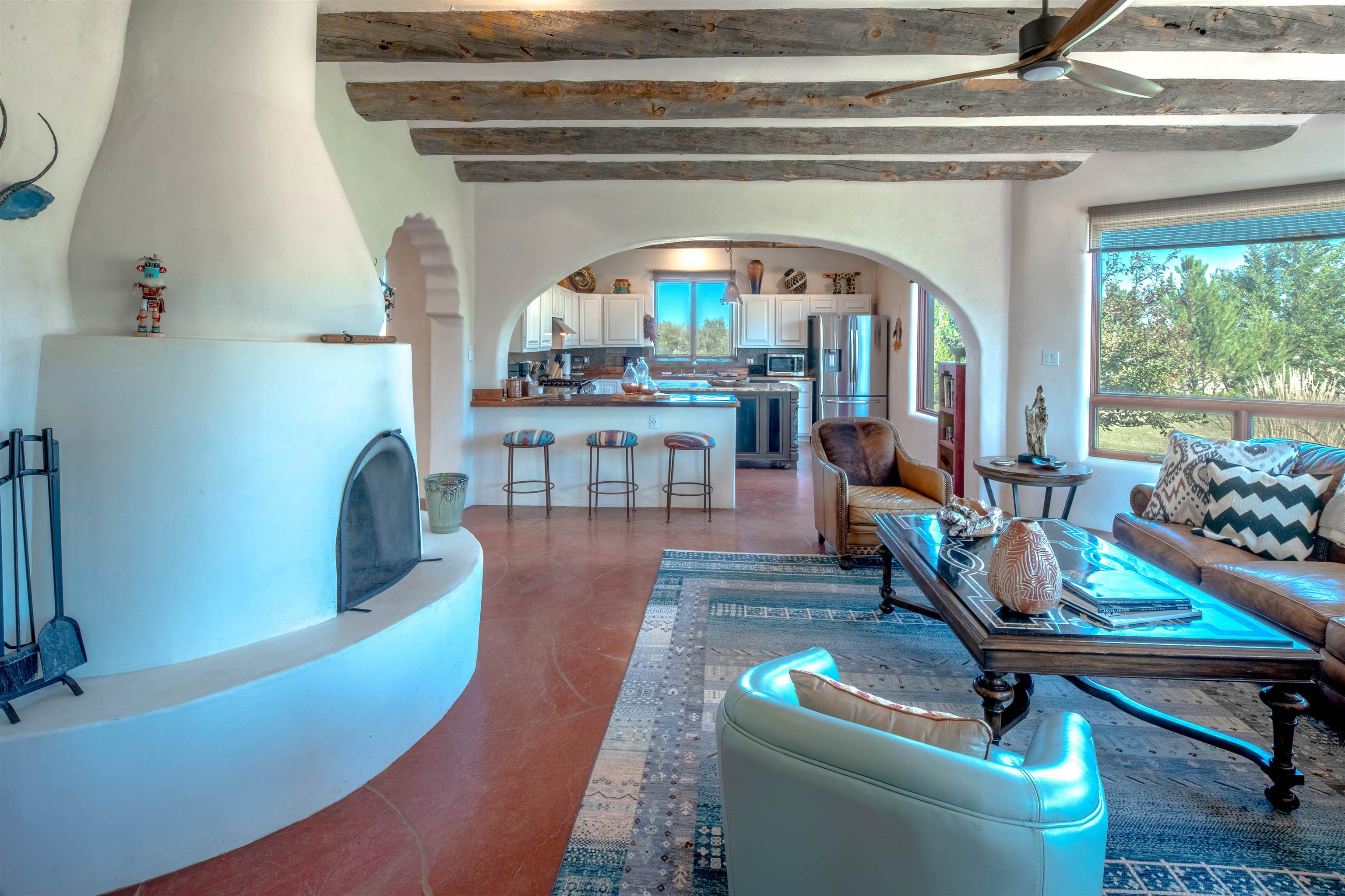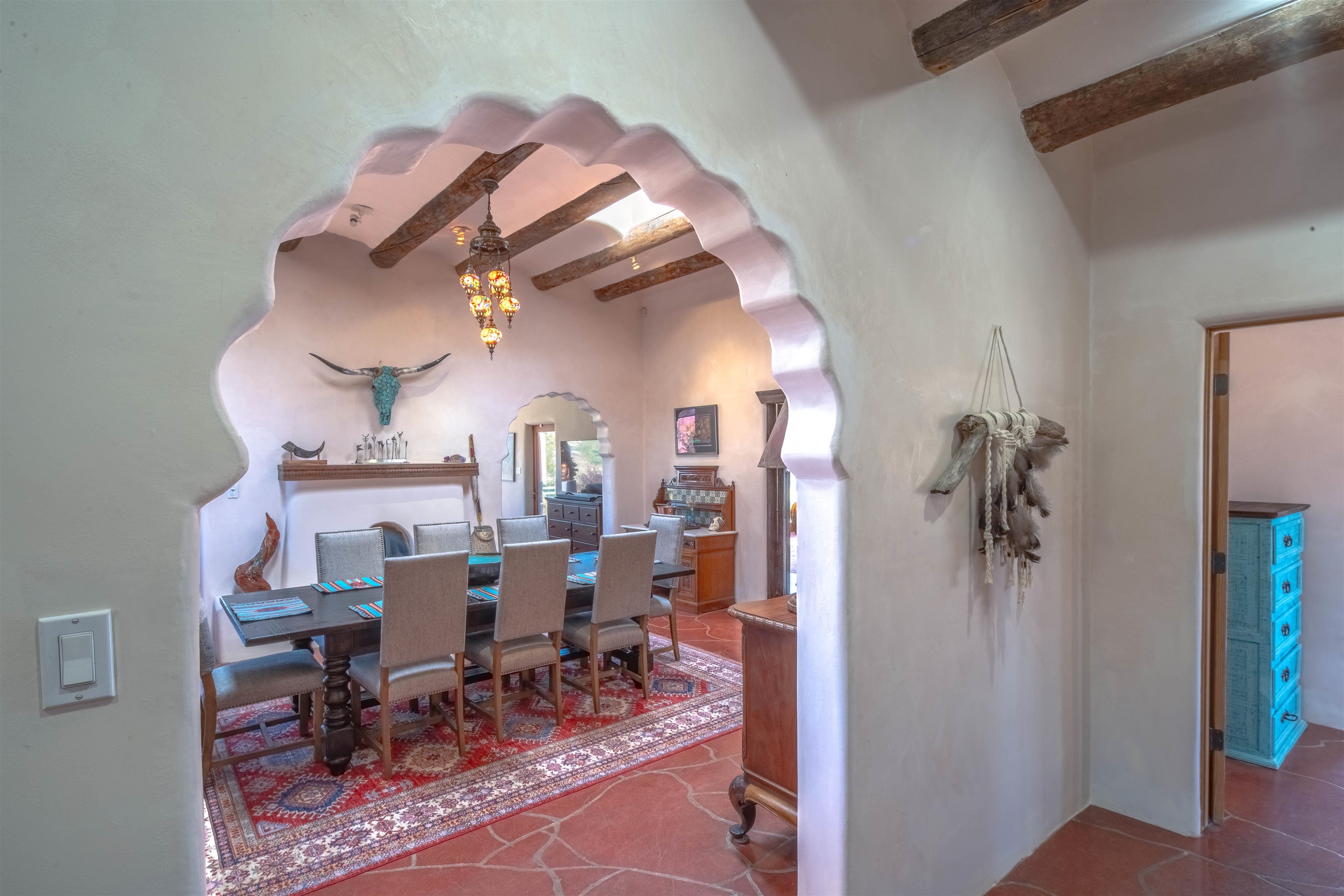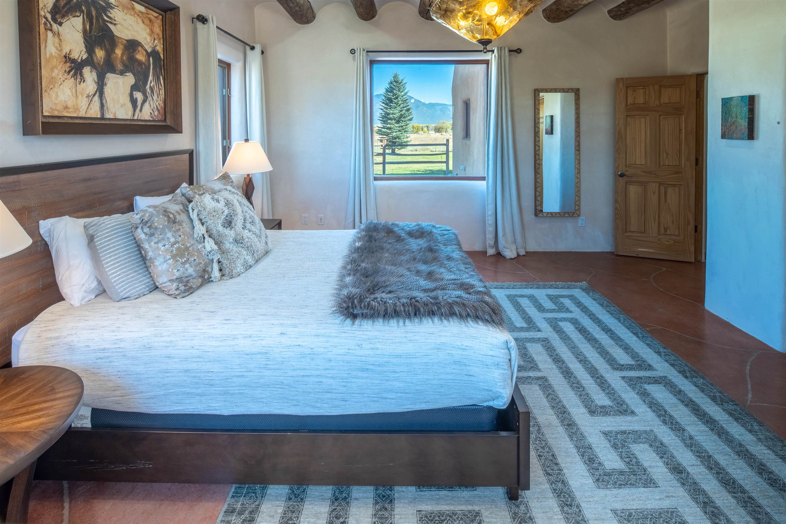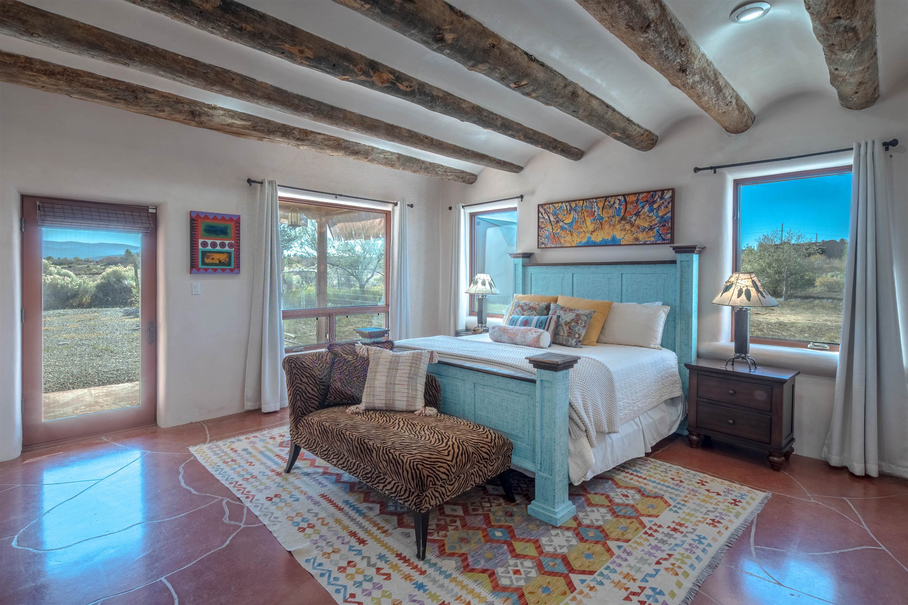 Welcome to Casa Vogue - timeless elegance and sophistication abound with this home designed by Nona Wesley, owner of Maya Designs Inc. of Taos, and built by Felipe Rodriguez, owner of 90 Degree Corners. This stunning three-bedroom, three-bathroom home with an additional office/study is being sold fully furnished with the absolute finest in elegance and comfort. You immediately enter through the hand carved double doors into an exquisite dining room with a stunning fireplace dividing the living room and dining room. There are very large picture windows with breathtaking views of Taos Mountain from the kitchen and living room areas, and admirable details in every room of the home. This home is perfect for entertaining with the open concept design, and with mountain views for starry nights, sunsets and ultimate privacy. This adobe constructed Pueblo-style home cannot be fabricated in today’s environment, and the artistic details throughout each of the rooms are unmatched. If that is not enough, there are also water rights from the acequia running along the property. Only ten minutes to the Town of Taos, one still feels like you are miles away from the hustle and bustle. This is a true treasure, and it is definitely one not to miss. Check out the exterior drone video, and the interior and exterior video tours on the listing and then schedule your private showing today. You definitely will not regret it.