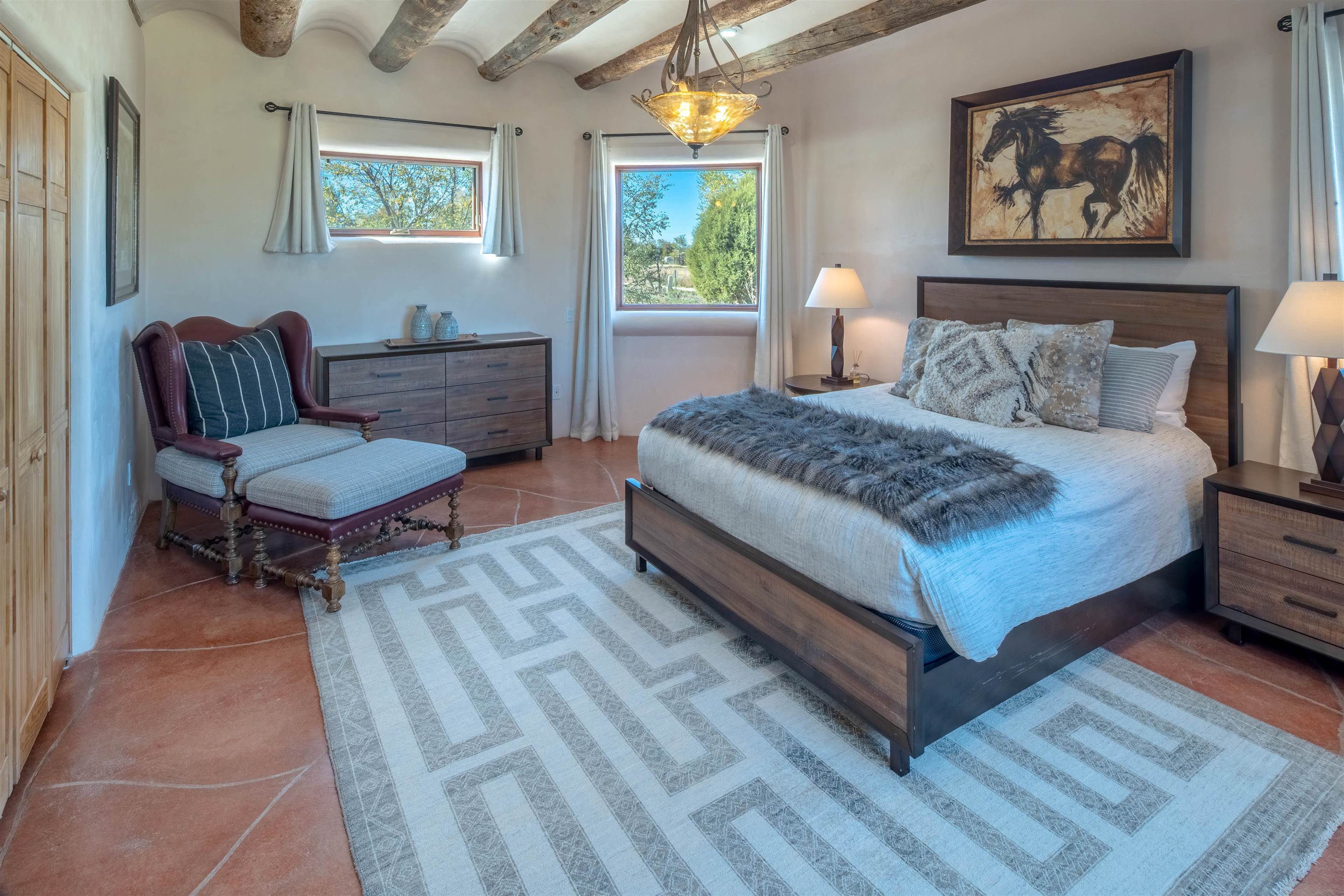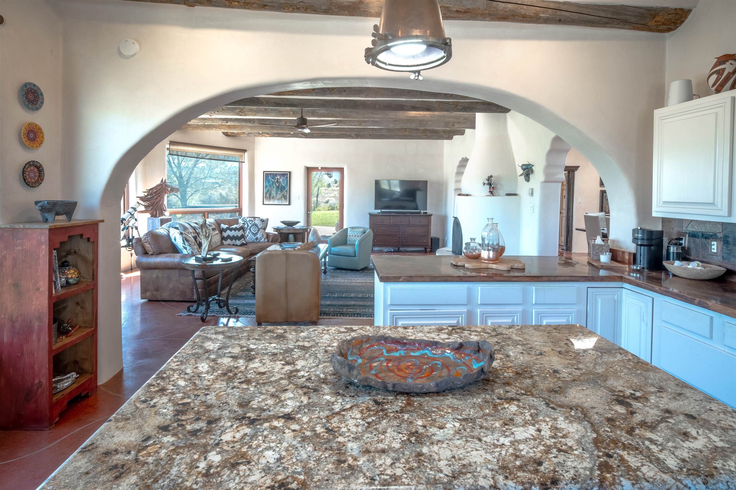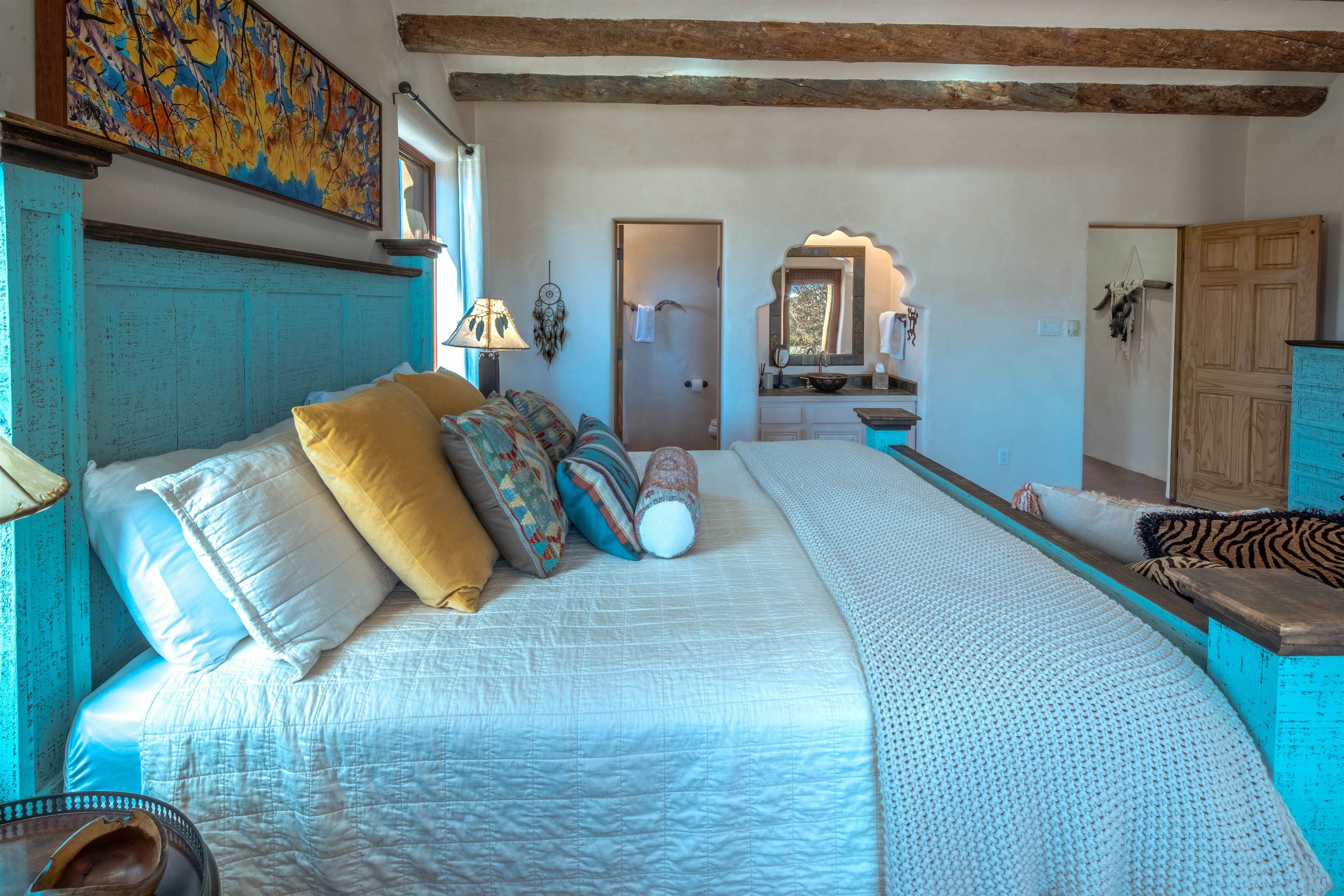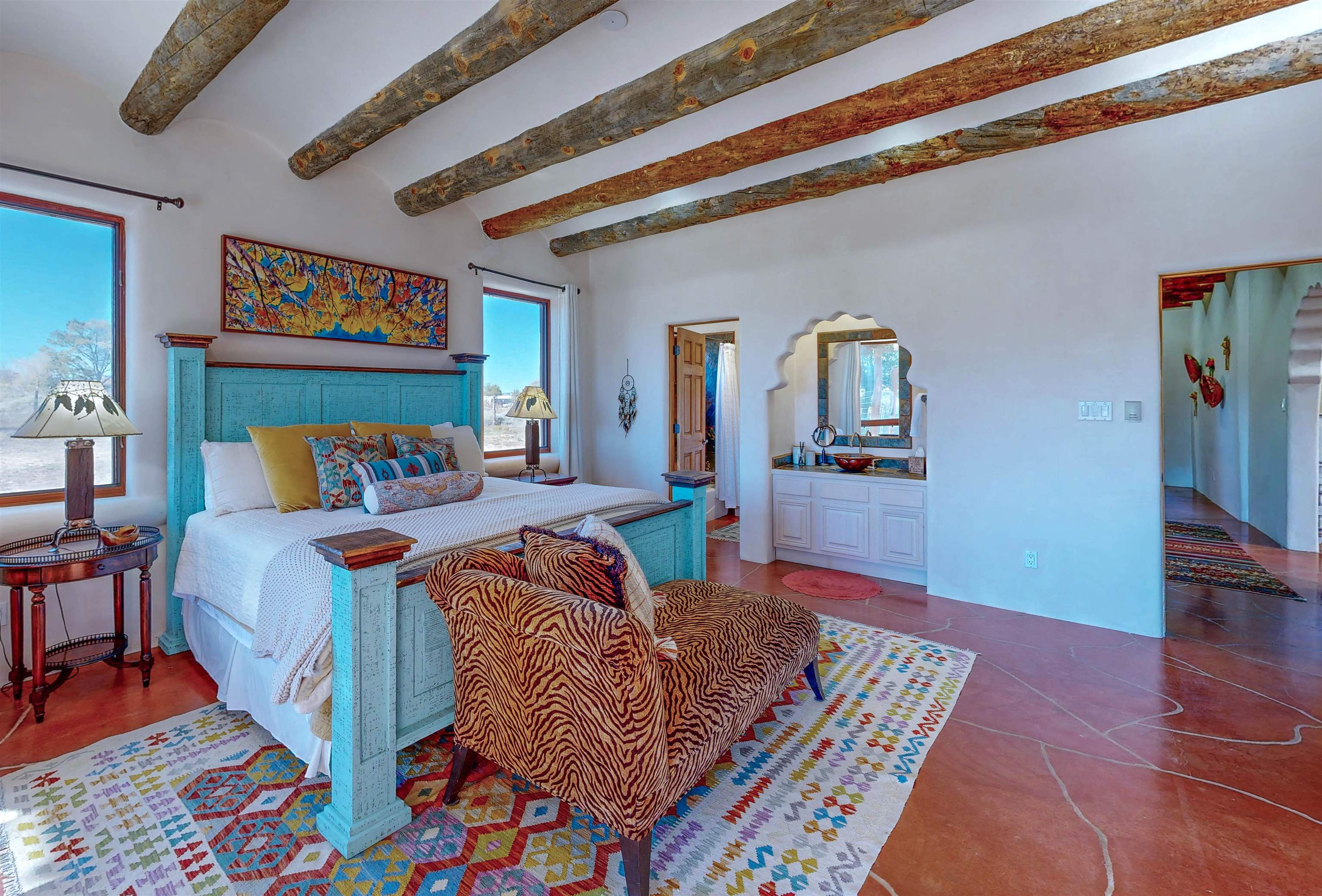 Welcome to Casa Vogue - timeless elegance and sophistication abound with this home designed by Nona Wesley, owner of Maya Designs Inc. of Taos, and built by Felipe Rodriguez, owner of 90 Degree Corners. This stunning three-bedroom, three-bathroom home with an additional office/study is being sold fully furnished with the absolute finest in elegance and comfort. You immediately enter through the hand carved double doors into an exquisite dining room with a stunning fireplace dividing the living room and dining room. There are very large picture windows with breathtaking views of Taos Mountain from the kitchen and living room areas, and admirable details in every room of the home. This home is perfect for entertaining with the open concept design, and with mountain views for starry nights, sunsets and ultimate privacy. This adobe constructed Pueblo-style home cannot be fabricated in today’s environment, and the artistic details throughout each of the rooms are unmatched. If that is not enough, there are also water rights from the acequia running along the property. Only ten minutes to the Town of Taos, one still feels like you are miles away from the hustle and bustle. This is a true treasure, and it is definitely one not to miss. Check out the exterior drone video, and the interior and exterior video tours on the listing and then schedule your private showing today. You definitely will not regret it.