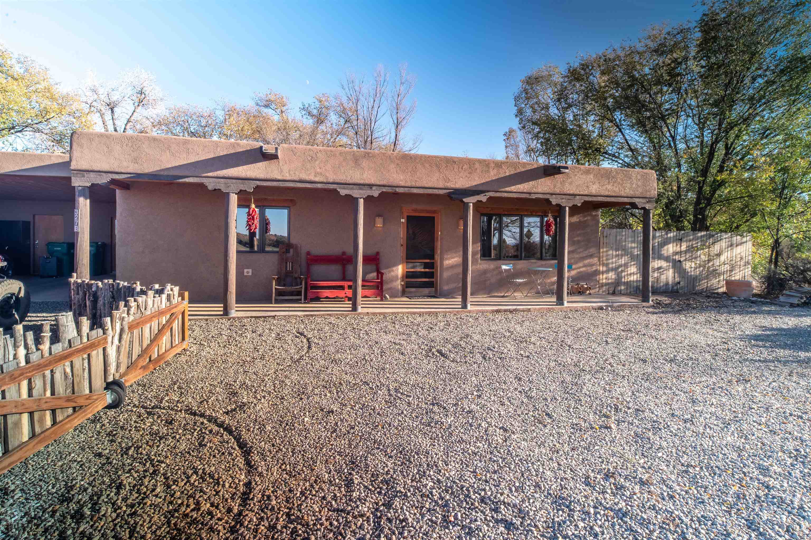 In-Town Living with Views, Privacy, and Southwestern Charm- this property is a cannot-miss kind of oppurtunity! Located in the heart of Taos yet tucked within the quiet feel of a small private community, Pond Village Subdivision offers the best of both worlds. This established neighborhood, within easy walking distance to the historic Taos Plaza, includes a blend of existing homes and newly developed lots. This beautifully maintained 2-bedroom, 2-bath home fronts Valverde Street and overlooks open western lands — where daily sunsets paint the sky in dazzling color. The front portal is sure to be a favorite spot to enjoy both watching nature awaken with morning coffee as well as end your days watching nature's artist paint the skies. Inside, the spacious living area centers around a traditional kiva fireplace, creating a warm and inviting gathering space. The open floor plan flows seamlessly into a well-appointed kitchen featuring abundant counter space, generous cabinetry, and a welcoming layout ideal for entertaining. Two comfortable bedrooms and two bathrooms feature thoughtful Southwestern details throughout — from the soft plaster walls and exposed vigas to radiant heated floors that add a touch of luxury. The second bedroom easily serves as a home office or guest space. Outdoors, a lovely, fenced yard to the east offers privacy, shade, and room for pets or relaxation under the charming pergola. An oversized storage room and separate laundry room adds extra practicality. As part of Pond Village, homeowners will also enjoy the rights and benefits of an established HOA. If you’ve been seeking the ease of in-town living with minimal maintenance, southwest character, and quick access to Taos’ renowned restaurants, galleries, schools, and shops — this is the perfect place to call home.