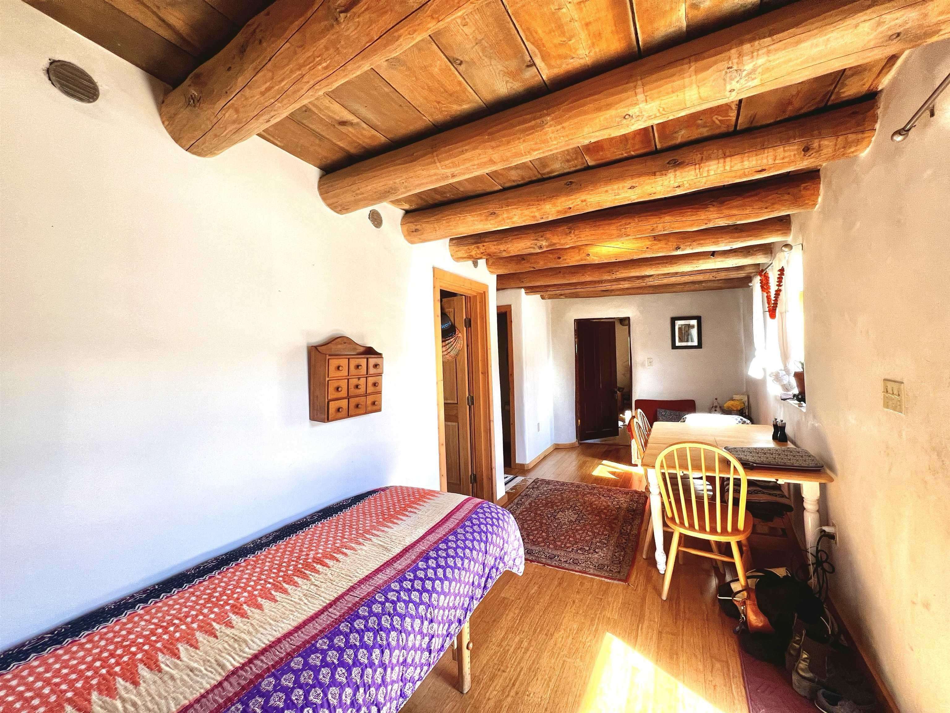 A rare opportunity to own two charming and recently remodeled adobe homes 1+miles from the Plaza, offering over 2,500 sq ft of combined living space, a basement and an attic. The 1950s bungalow style main house (1,400+ sq ft) features original hardwood floors throughout, colorful vintage accents, three bedrooms, one bath, two porches, and practical extras including a carport, basement, attic, and laundry. The eco friendly 1910s casita (1300 sq ft) offers two bedrooms, one bath, remodeled kitchen, bamboo floors, and a high-quality water catchment and filtration system. Cozy wood stoves warm both bedrooms. A deal scenario for a family with room to grow, long-term rental income, multi-generational living, or a flexible live-work space. Outdoors, you’ll find fruit trees, planting beds, storage sheds, and a spacious, secluded yard in a quiet setting that remains conveniently near town. Come see this truly exceptional mix of ease, practicality, and potential.