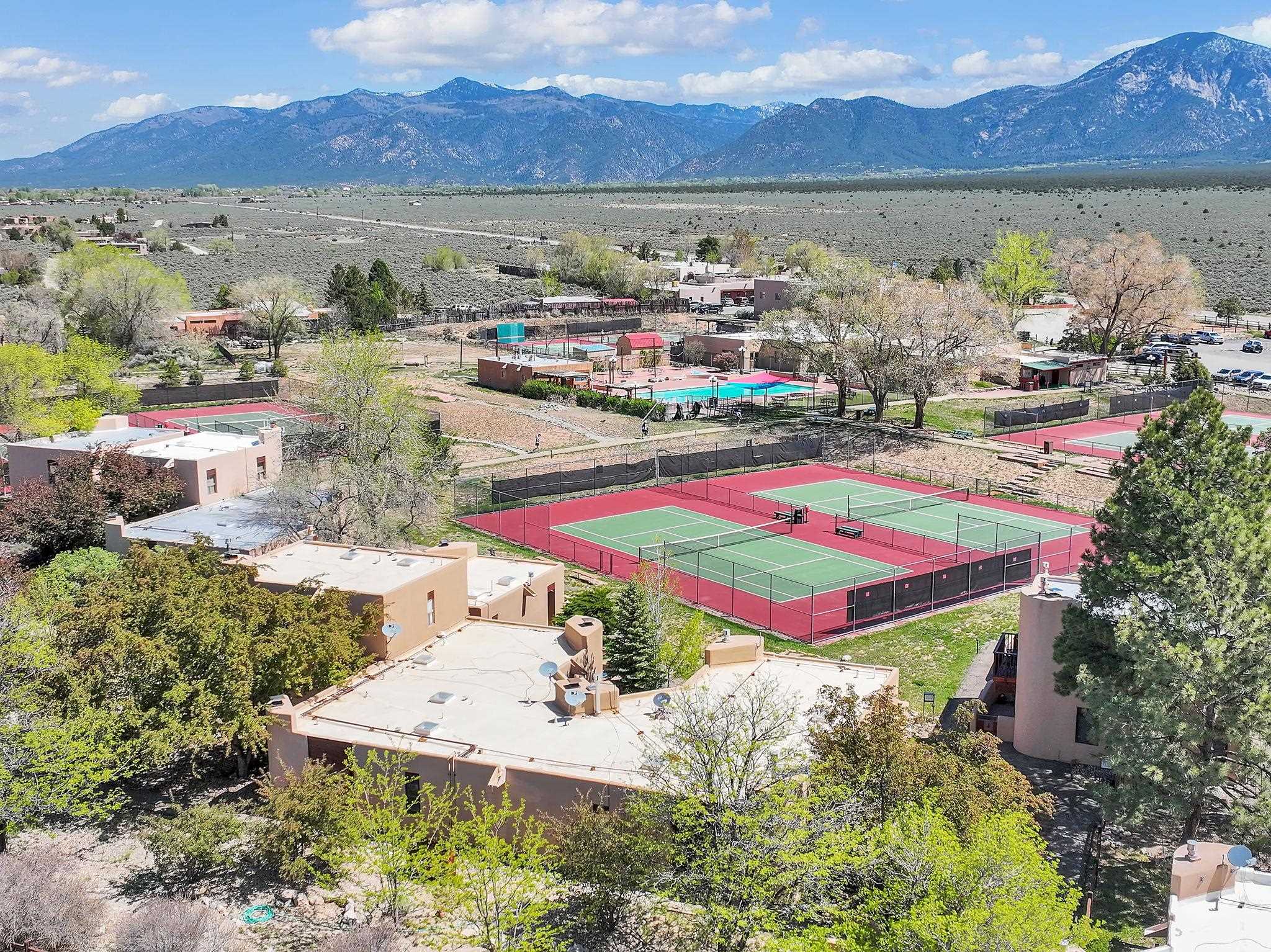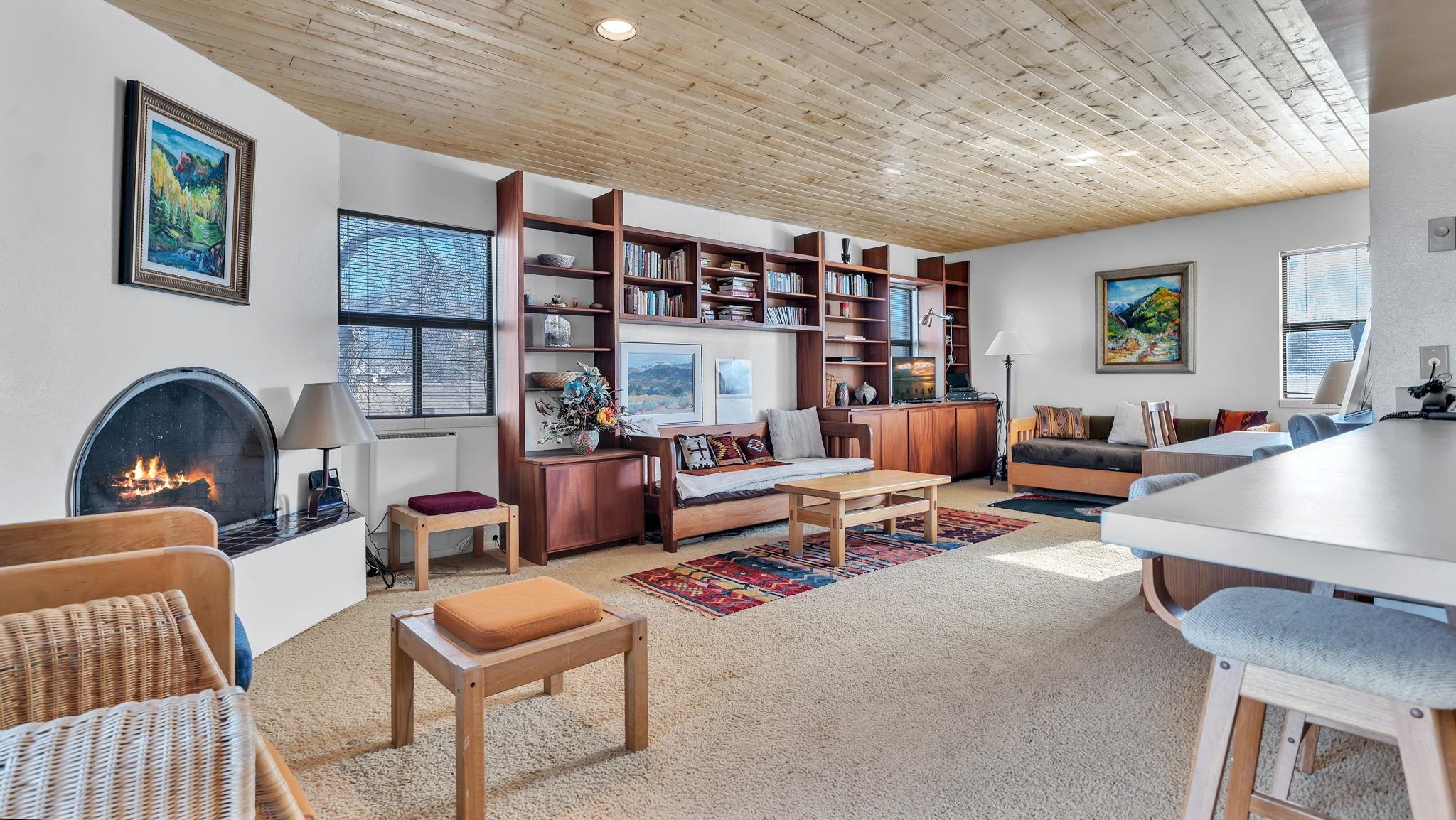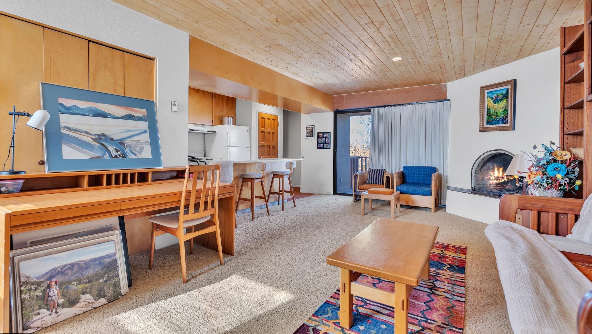 SPECIAL things come in small packages ~ This impeccably cared for 526 square foot studio condo is a unique find in the Taos Condo market. A full time residence or your private retreat with investment potential on the North side of town, there are a few different ways you could enjoy this property. The wide open floor plan is filled with very rare and incredibly special hand-carved [built-in] cabinetry by renowned local artist Max Killinger, which is complimented by the newly installed vibrant tongue and groove ceiling. The unit is equipped with a kitchen, a comfortable living space that possesses a traditional burning fireplace, and a spectacular balcony ideal for small gatherings or your personal rituals any time of day. From sunrise to sunset, this is a natural light filled retreat you won't want to leave. The Taos Tennis Ranch is a sweet spot for swimming, hot tubbing, tennis and pickleball which are all included in the HOA fees. Additionally, there are shuttles for Taos Ski Valley that leave from the parking lot of the Quail Ridge Inn, and a wonderful restaurant that serves beyond the lunch hour daily. Conveniently located a short drive to Taos Plaza, the ski hill, the Rio Grande river for all your water activities, Don't let this SPECIAL package get away, come have a view and make this your Taos escape.