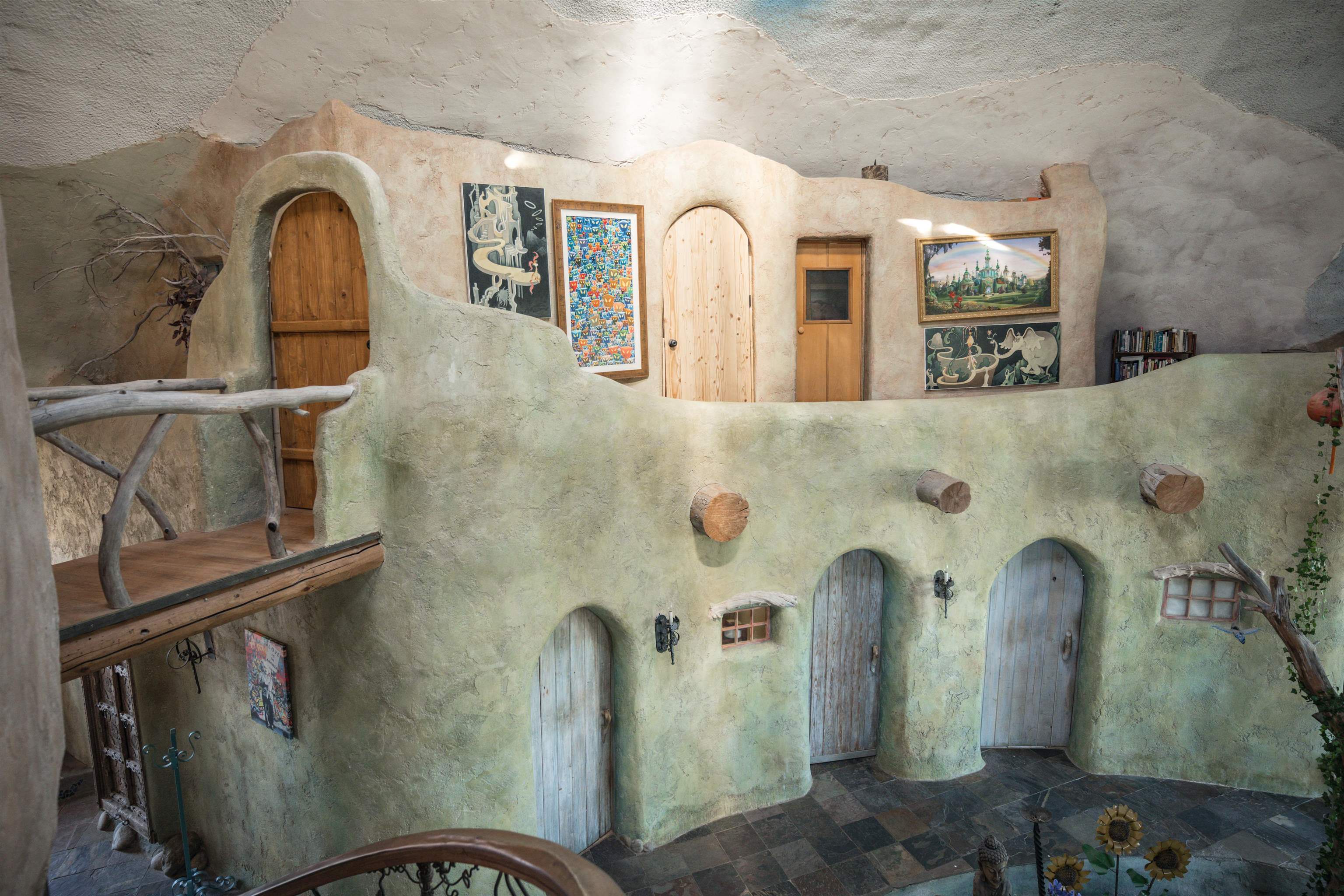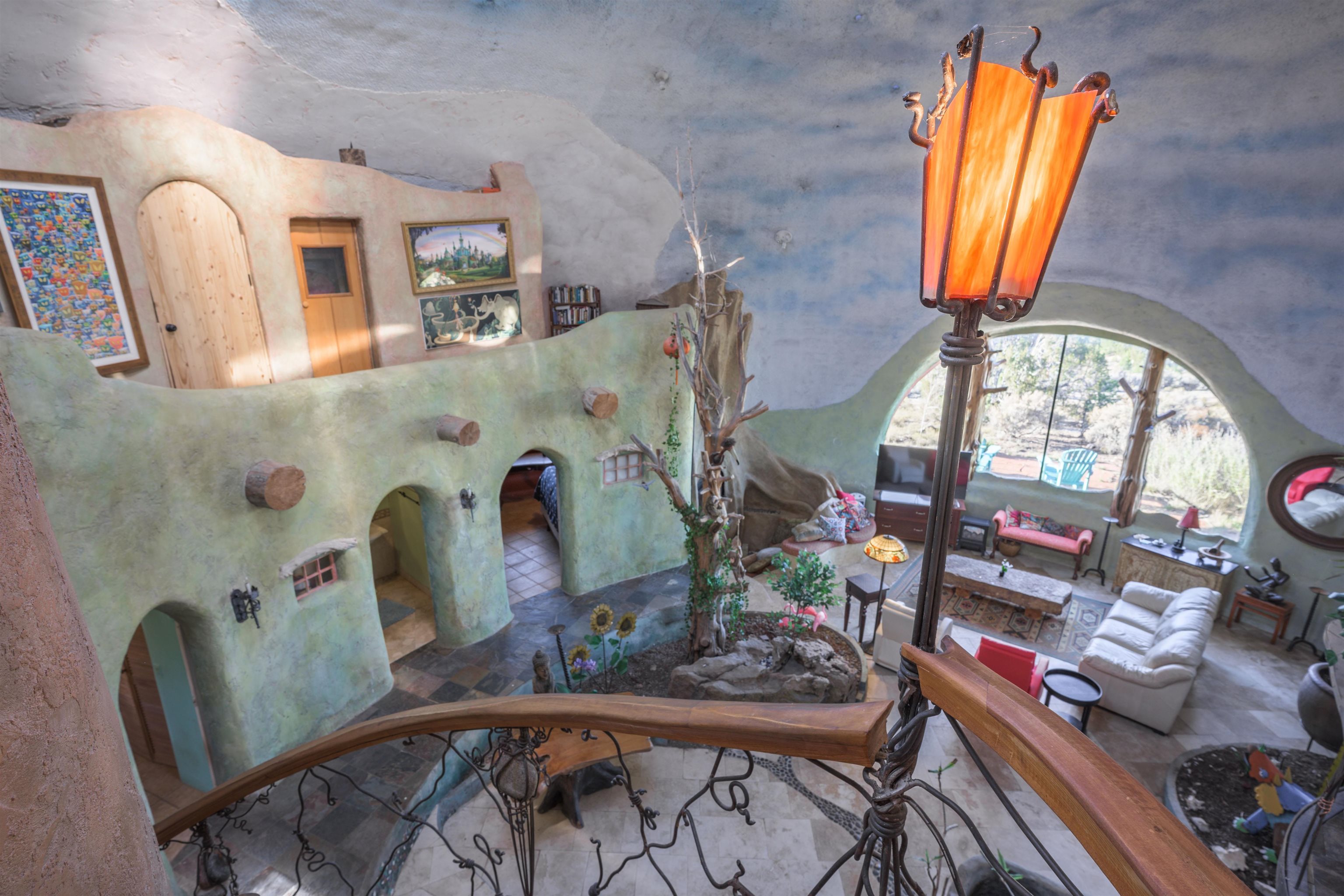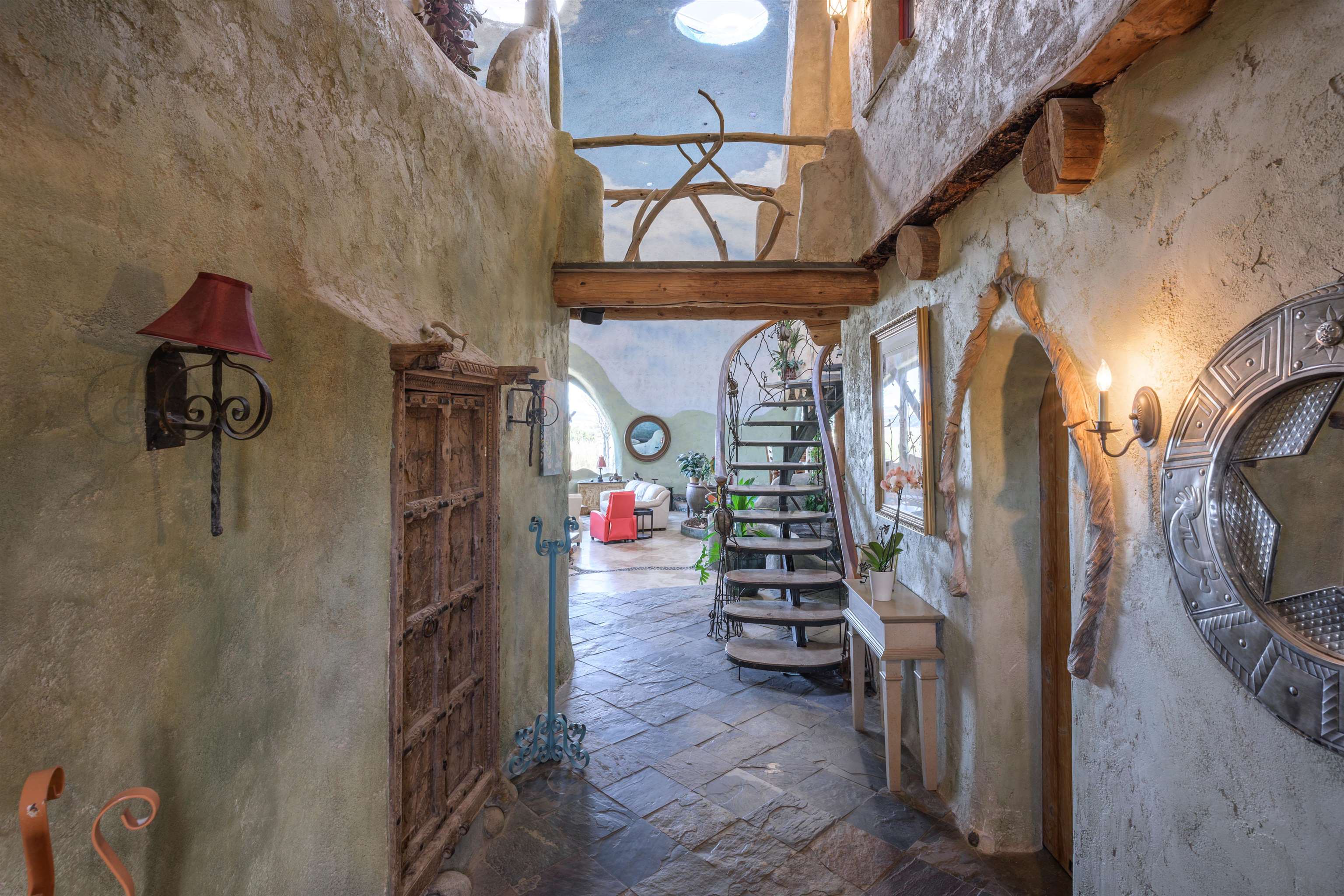 A Dreamy & Wondrous Masterpiece in Taos, New Mexico ~ Perched on five-plus pristine and private high-desert acres at the end of Tune Drive, you will discover "The Dreaming Dome," a dreamy and wondrous architectural masterpiece. Truly whimsical and delightfully outlandish in all the best ways, this structure—as featured on HGTV and in Parade Magazine as "The Most Beautiful House in America"—is more of a sculpture than your standard residence. Inspired by the rainforests of Costa Rica and the New Mexico alpine high-desert, this sustainable, monolithic designed dome includes a yoga hut in the backyard, engulfed by the most stunning views the region has to offer. Upon stepping inside this architectural wonder, you are greeted by a visual dreamland defined by 35-foot ceilings, hand-finished adobe-style walls in rich earth tones, hand-carved doors, travertine tile, luxurious stained-glass chandeliers, and high-end CUSTOM finish-work throughout. The spacious interior features vibrant mosaic paths, hand-painted murals, cedar trunk columns with hanging monkeys, toucans, and sloths, beside a romantic mystic tree wood-burning fireplace in the den with a black river rock bancito, and a dramatic painted sky ceiling flooded with circular skylights. The extra-large, half-moon juniper-framed window is as special as can be, offering equally incredible views and providing natural warmth and light from Mother Sun to compliment the radiant heated floors. The functional and stylish kitchen, just beyond the pond (now an atrium), includes Taos turquoise floors, soft green cabinets with marble countertops embedded with stainless steel appliances, a central island bar, beneath the traditional vigas beam ceiling. The adjacent dining room comfortably fits the family and offers another charming gathering area. The home provides ample and elegant space, possessing three distinctive bedrooms with three and a half eclectic bathrooms, including a private second-story primary ensuite straight out of a Disney movie, complete with a fireplace, and accessed by a dazzling sculpted vine staircase that leads up through your bedroom to a walk-in shower and access to a private hot tub deck—perfect for stargazing under the big NM sky. Outside, you will enjoy all of your time taking in the Land of Enchantment, tending to the garden under the cottonwood trees, and entertaining and bewildering your guests en su casa. Some of life's sweetest memories will be created here, while kids and furry friends roam freely in one of the fenced yards, accessible through a convenient double-doggie-door. Fresh H2O from your own 900-foot private well from the aquifer below is a major plus for day-to-day living, providing some of the best-tasting water you will find. As for the location, it is simply unbeatable for adventure and relaxation, situated close to the Rio Grande River, near natural hot springs, a jaunt from Taos Airport, and not far from the Historic Taos Plaza, world-class skiing and snowboarding at Taos Ski Valley, and endless hiking, biking, fishing, and bird watching trails. Even the wildlife will find their way to this magical wonderland while you lead a yoga class or mold pottery in the Yoga Dome, make bread in the blue horno, drink your morning coffee or evening wine, and experience the sweetest sunsets on our planet; and don't be surprised if an occasional hot air balloon emerges from the Gorge during a dreamy sunrise. This is custom luxury, eco-friendly, and fantasy, while submerged in nature, right here in Taos, New Mexico. Does it get any better? The answer very well might be no, so don't waste any time making this wonder of Taos, New Mexico your very own Reality.