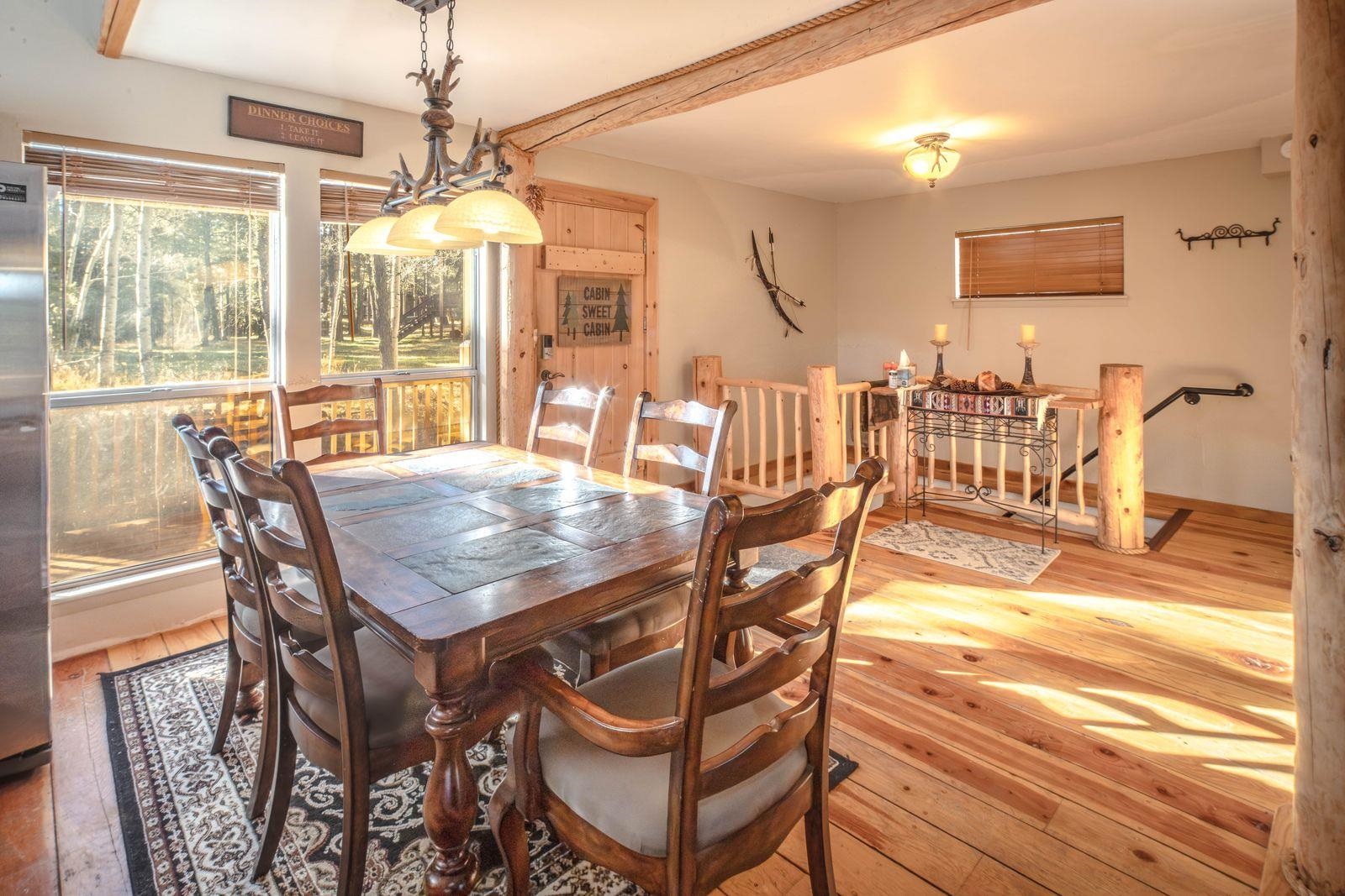 Mountain Retreat With Rustic Charm and Modern Comfort. Escape to your own private retreat in the forest—this beautifully finished mountain home offers the perfect balance of cozy rustic character and contemporary convenience. The kitchen flows seamlessly into the dining area and spacious living room. A rock-wall fireplace with a heavy timber mantel serves as the centerpiece of the home, creating a perfect gathering place for chilly mountain evenings. Natural wood accents, built-ins, and a spiral staircase contribute to the cozy cabin feel. An elevated walkway overlooks the living area, giving the home a sense of openness and connection between levels. Warm wood tones and rustic railings amplify the lodge-style design. Step outside onto the expansive wraparound deck and immerse yourself in nature. With abundant tree cover and views in every direction, the space is ideal for outdoor dining, relaxing, or stargazing on clear mountain nights. Surrounded by towering pines and situated on a spacious wooded lot, this property provides tranquility, privacy, and true mountain-living ambiance.