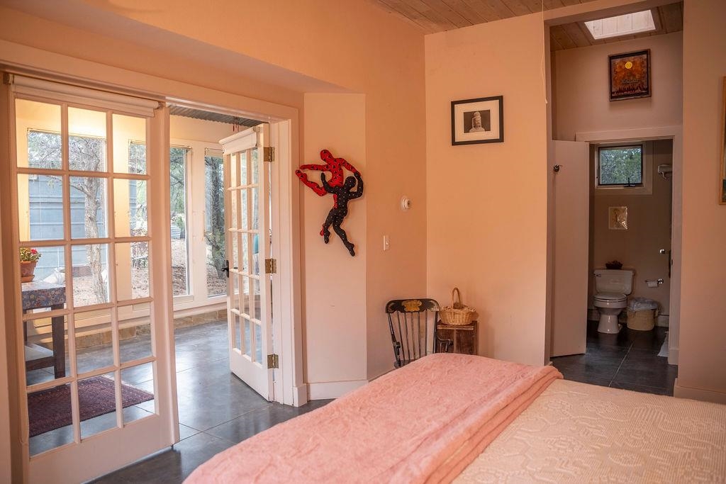 A Work of Art You Can Call Home! Tucked away and nestled amongst mature trees this tranquil and private oasis is truly a hidden treasure! Beautiful two story contemporary Northern NM style main home, guest house and studio at the end of a private road in the foothills. This exquisite home boasts of tasteful architectural details, quality finishes and appointments throughout providing functionality, efficiency, sustainability and pleasing aesthetics. Every corner reveals thoughtful design and craftsmanship, from the interplay of light across tin and latilla ceilings to the sculptural banister crafted by a local metal artist. The result is a home that feels alive with creativity and warmth. Birds eye view decks open to stunning Northern NM vistas, perfect for morning coffee or evening sunsets. Built with pumice-crete insulation, the one bedroom, one bath home stays naturally cool through the summer. The wood burning fireplace provides warmth and comfort during those cold winter months. The kitchen overlooking the living area with high ceilings and abundant natural light creates a welcoming ambience. French doors on the west lead to a patio for dining al fresco or relaxing to the sound of cascading water from the fountain. The guest house with sunroom is light and bright providing two spaces that could be bedrooms and a full bath. Perfect space for family and friends to relax in their own space. Plus, a working studio offers room to create or work remotely. Meandering pathways on 2.16 wooded acres, this sanctuary is a hidden gem waiting to be discovered! Though just minutes from town, the setting feels like a private retreat. Whether you’re looking for a home with room for guests, space for art and work from home, or simply a peaceful sanctuary, this property offers a rare blend of artistry, function, and serenity…the possibilities are endless!