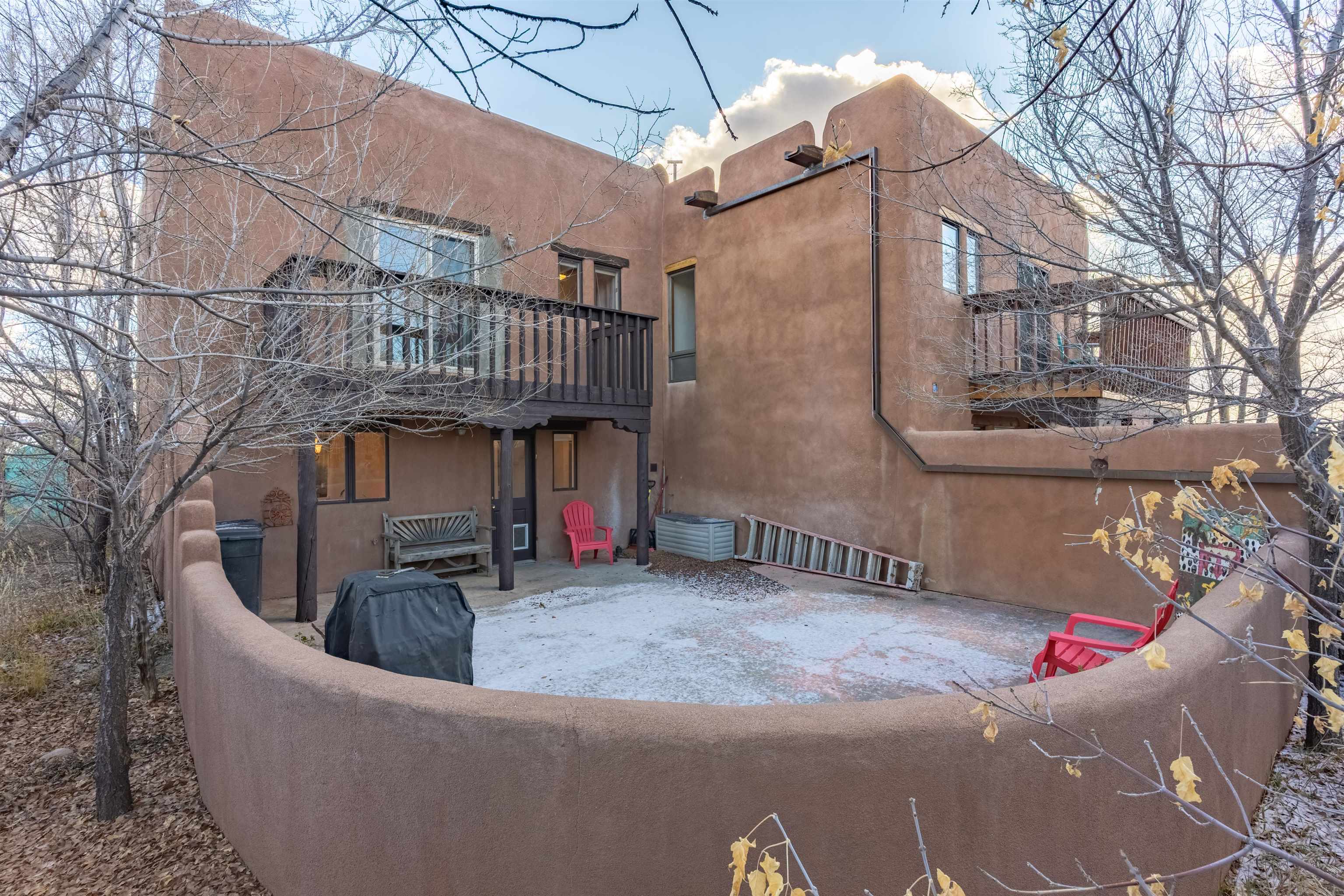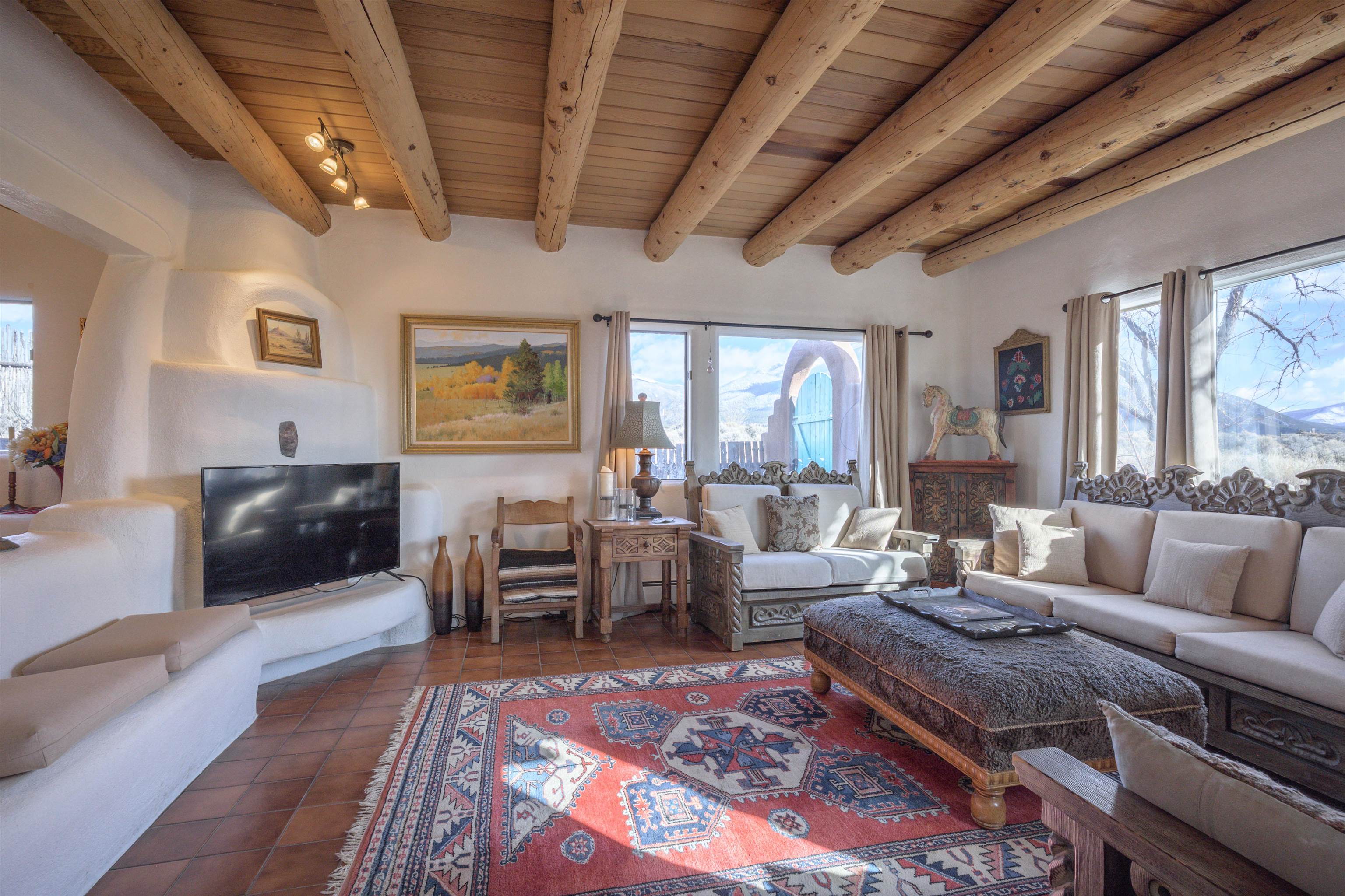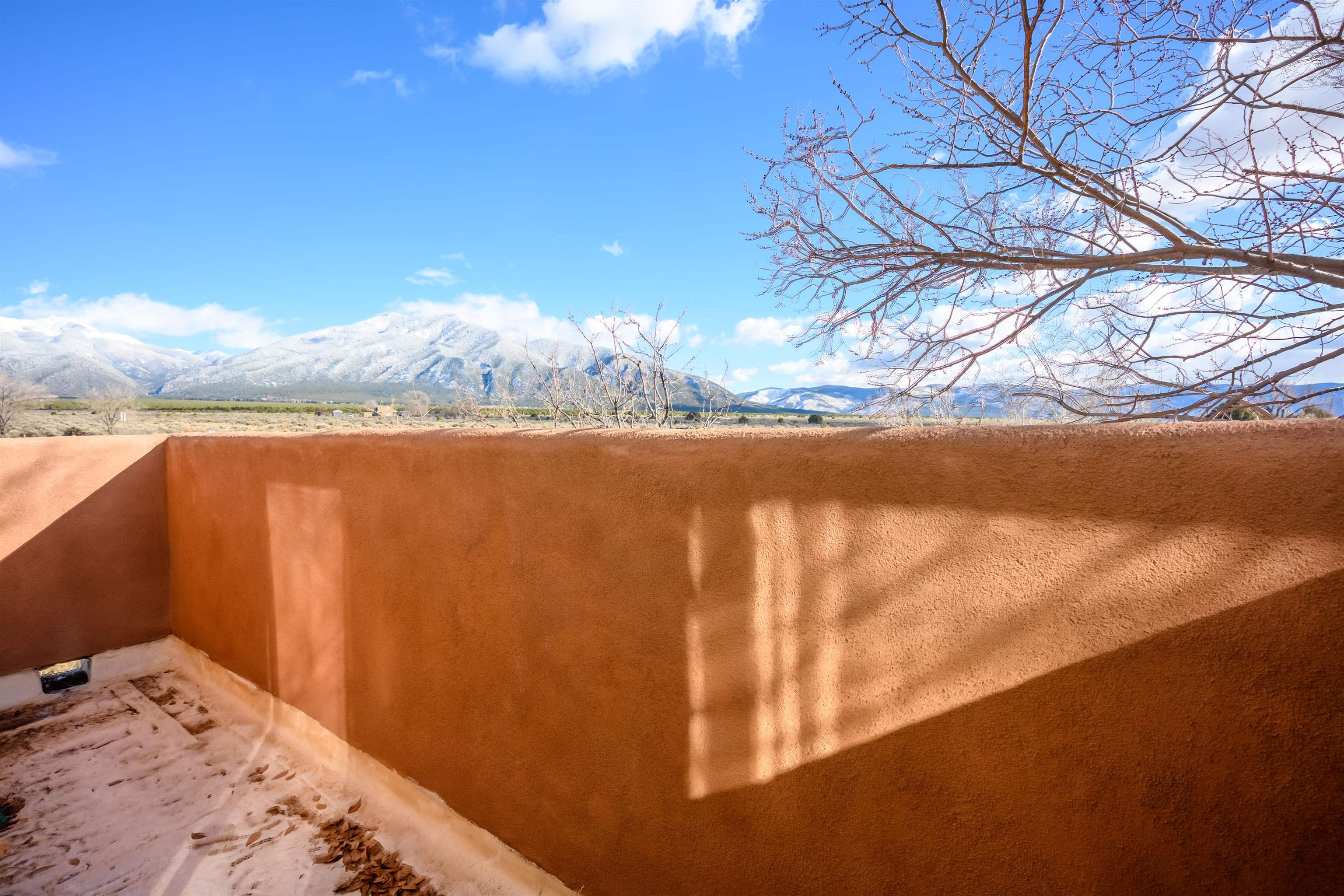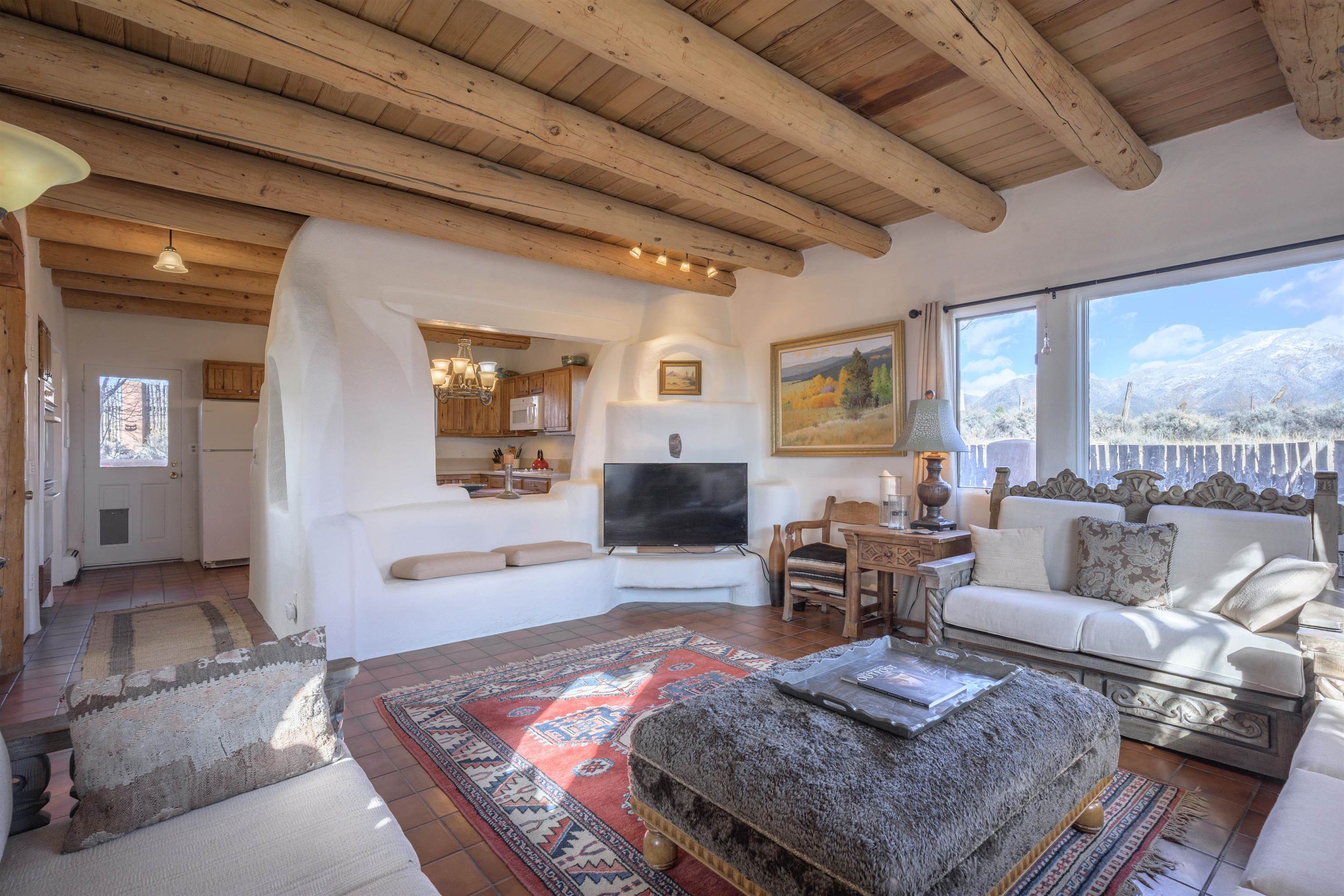 Discover classic Northern New Mexico charm in this beautifully maintained end-unit townhouse perfectly positioned between Arroyo Seco, the Town of Taos, and Taos Ski Valley. Warm architectural details—including vigas, Saltillo-style tile, carved wood accents, and hand-troweled plaster walls—give the home an inviting Southwestern character from the moment you step inside. The main level features a bright, open living area with large windows framing stunning mountain views, plus a cozy kiva-style fireplace that anchors the space. The adjacent kitchen offers generous counter space, natural wood cabinetry, and a built-in banco dining nook with sculpted adobe forms that echo traditional Taos design. A full bath with laundry adds convenient functionality on the first floor. Upstairs, both bedrooms are filled with natural light and offer access to outdoor spaces with views of the Sangre de Cristo range. The primary bedroom includes a spacious sunroom-style nook—ideal for a home office, reading area, or meditation retreat. A large second full bath with dual Talavera sinks completes the upper level. Outdoor living areas include a private walled courtyard off the kitchen and additional fenced space suitable for pets or gardening. A detached one-car carport adds covered parking and storage options. With only four units and no HOA or condo dues, this property offers rare tranquility with unbeatable proximity to skiing, hiking, dining, and the vibrant culture of Taos and Arroyo Seco. A wonderful opportunity to enjoy the best of Northern New Mexico living.