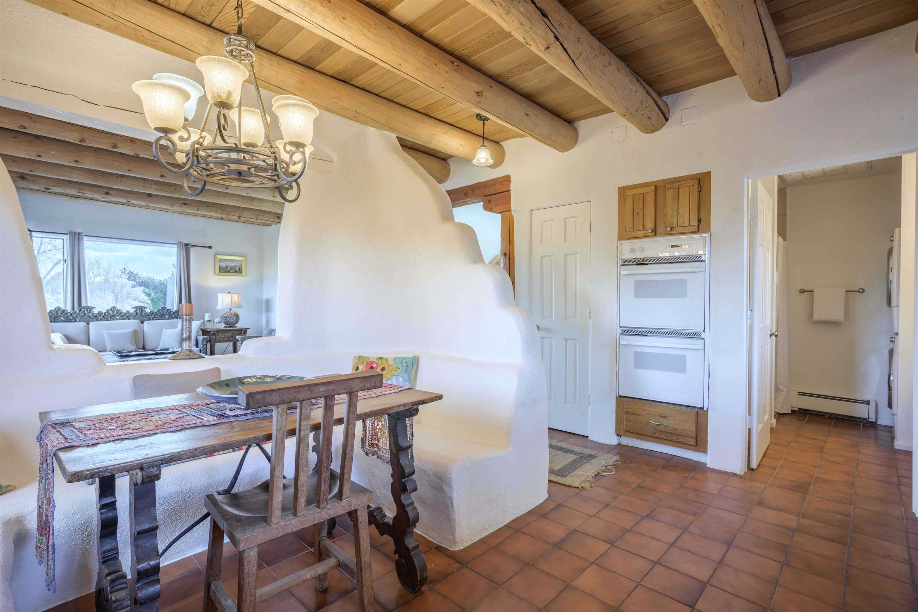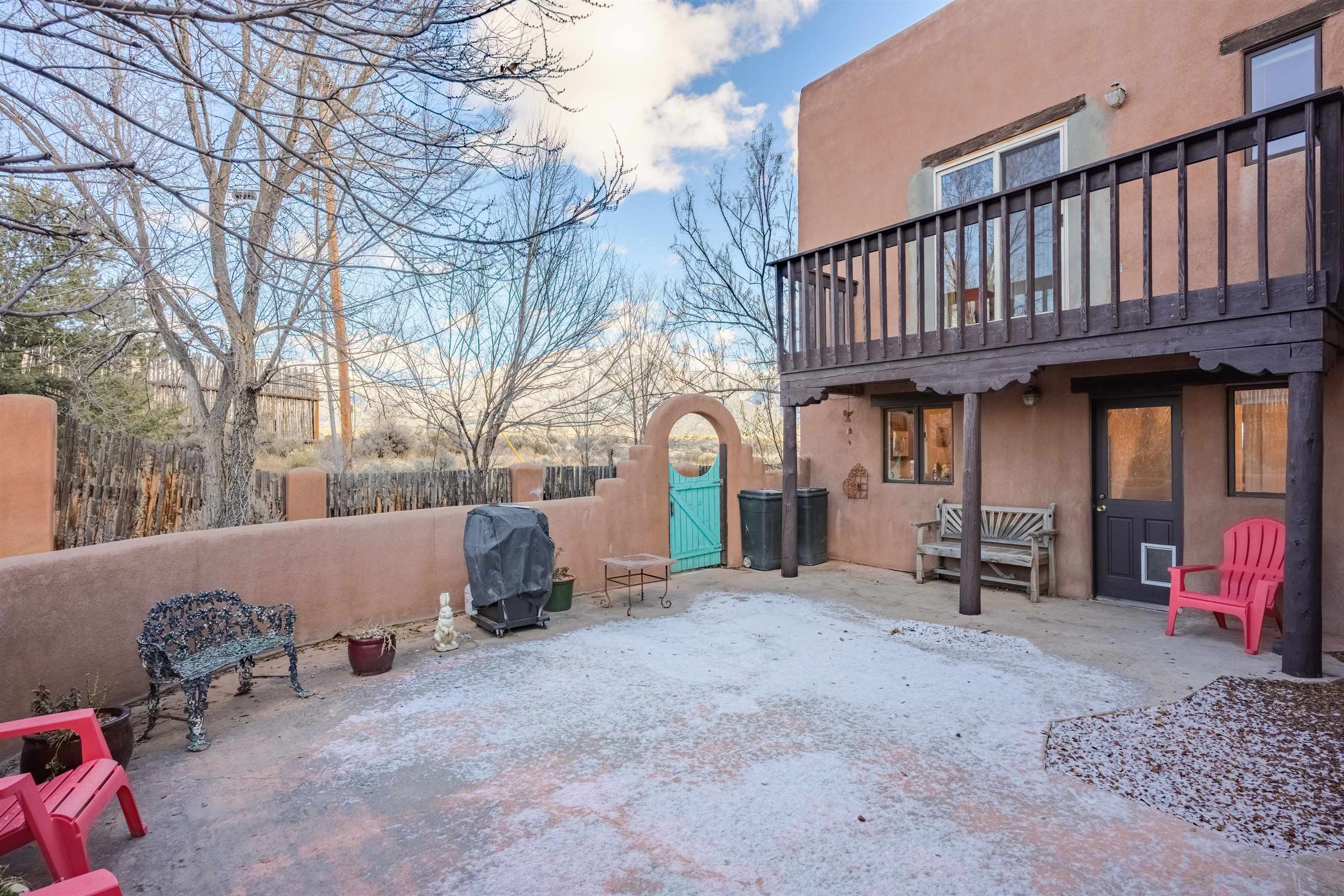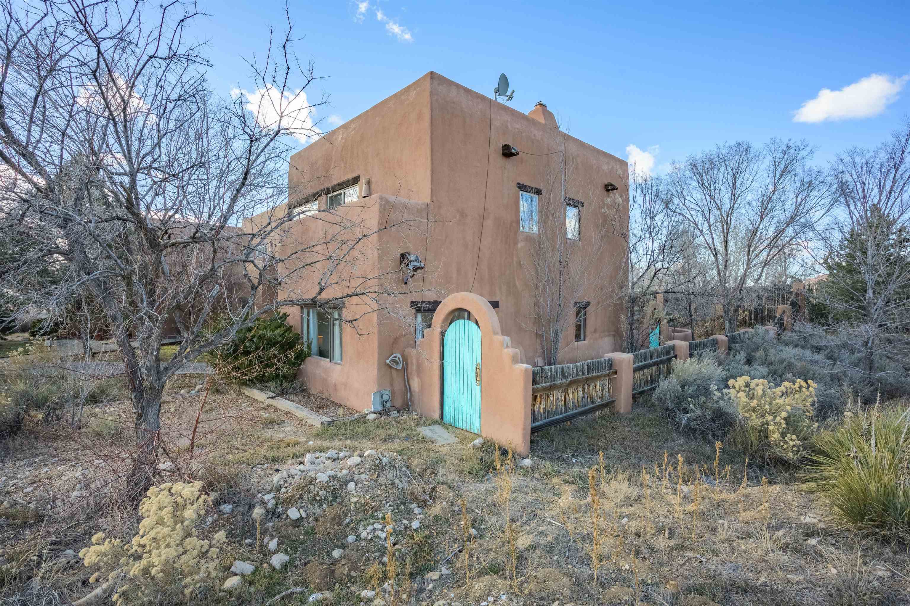 Discover classic Northern New Mexico charm in this beautifully maintained end-unit townhouse perfectly positioned between Arroyo Seco, the Town of Taos, and Taos Ski Valley. Warm architectural details—including vigas, Saltillo-style tile, carved wood accents, and hand-troweled plaster walls—give the home an inviting Southwestern character from the moment you step inside. The main level features a bright, open living area with large windows framing stunning mountain views, plus a cozy kiva-style fireplace that anchors the space. The adjacent kitchen offers generous counter space, natural wood cabinetry, and a built-in banco dining nook with sculpted adobe forms that echo traditional Taos design. A full bath with laundry adds convenient functionality on the first floor. Upstairs, both bedrooms are filled with natural light and offer access to outdoor spaces with views of the Sangre de Cristo range. The primary bedroom includes a spacious sunroom-style nook—ideal for a home office, reading area, or meditation retreat. A large second full bath with dual Talavera sinks completes the upper level. Outdoor living areas include a private walled courtyard off the kitchen and additional fenced space suitable for pets or gardening. A detached one-car carport adds covered parking and storage options. With only four units and no HOA or condo dues, this property offers rare tranquility with unbeatable proximity to skiing, hiking, dining, and the vibrant culture of Taos and Arroyo Seco. A wonderful opportunity to enjoy the best of Northern New Mexico living.