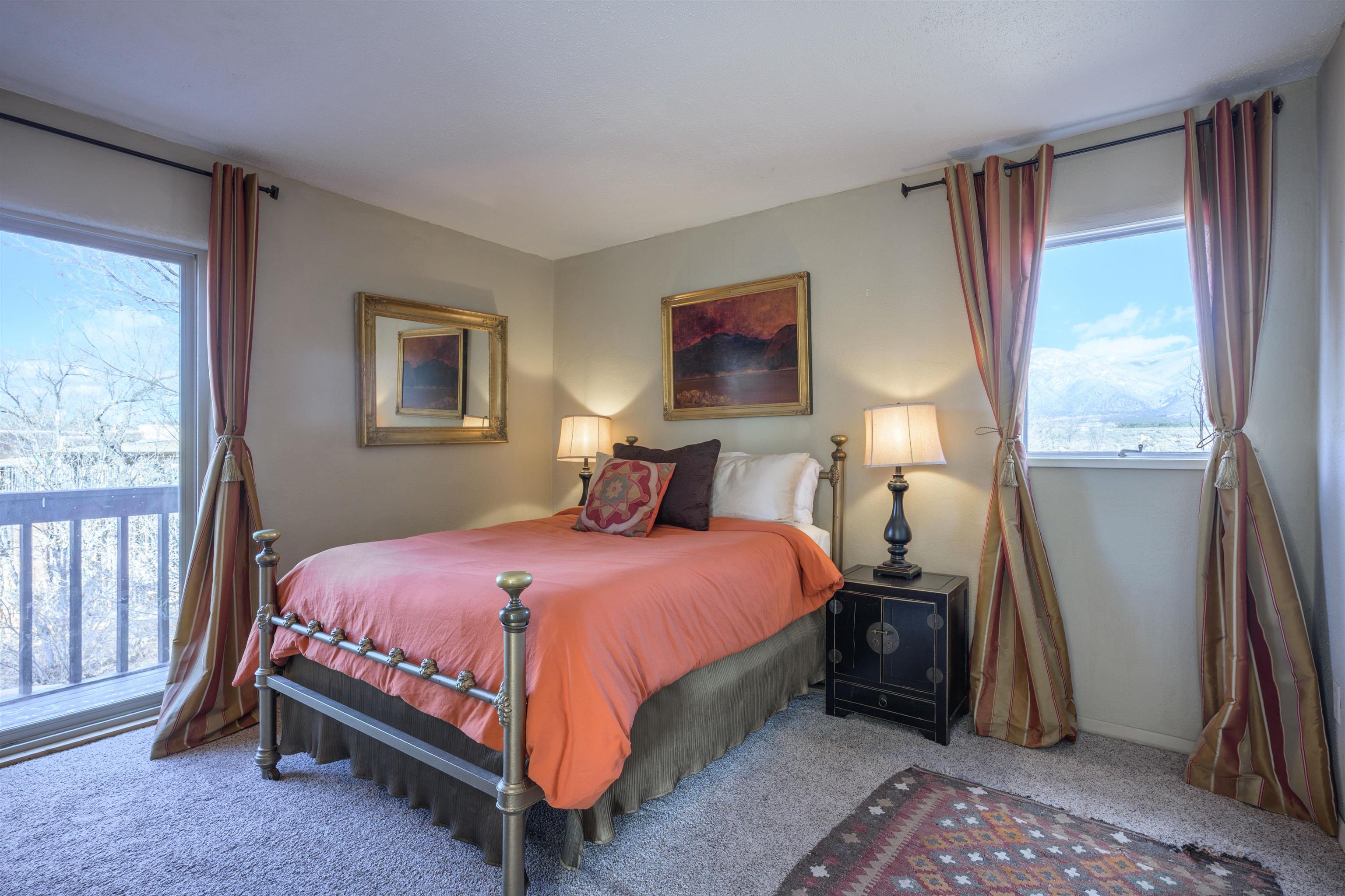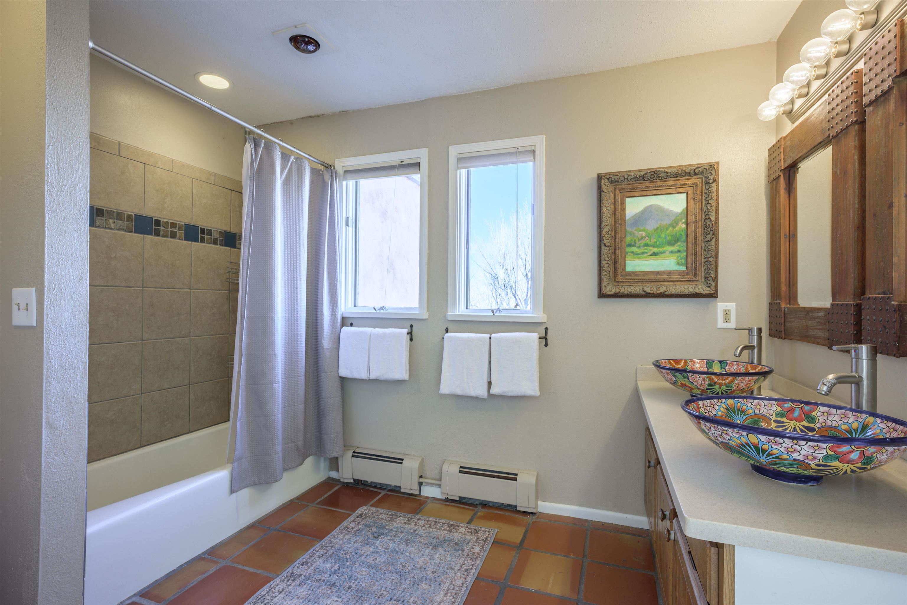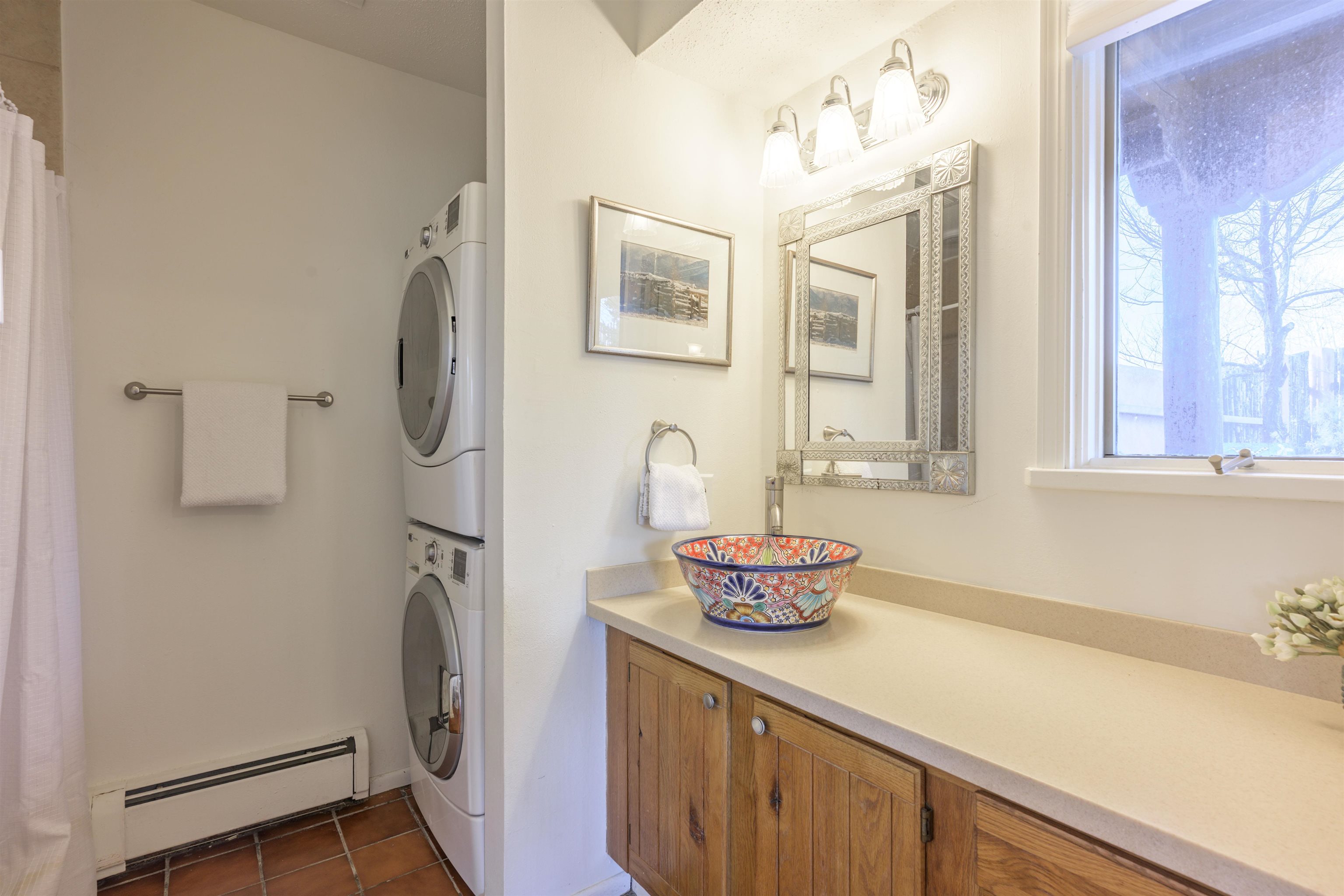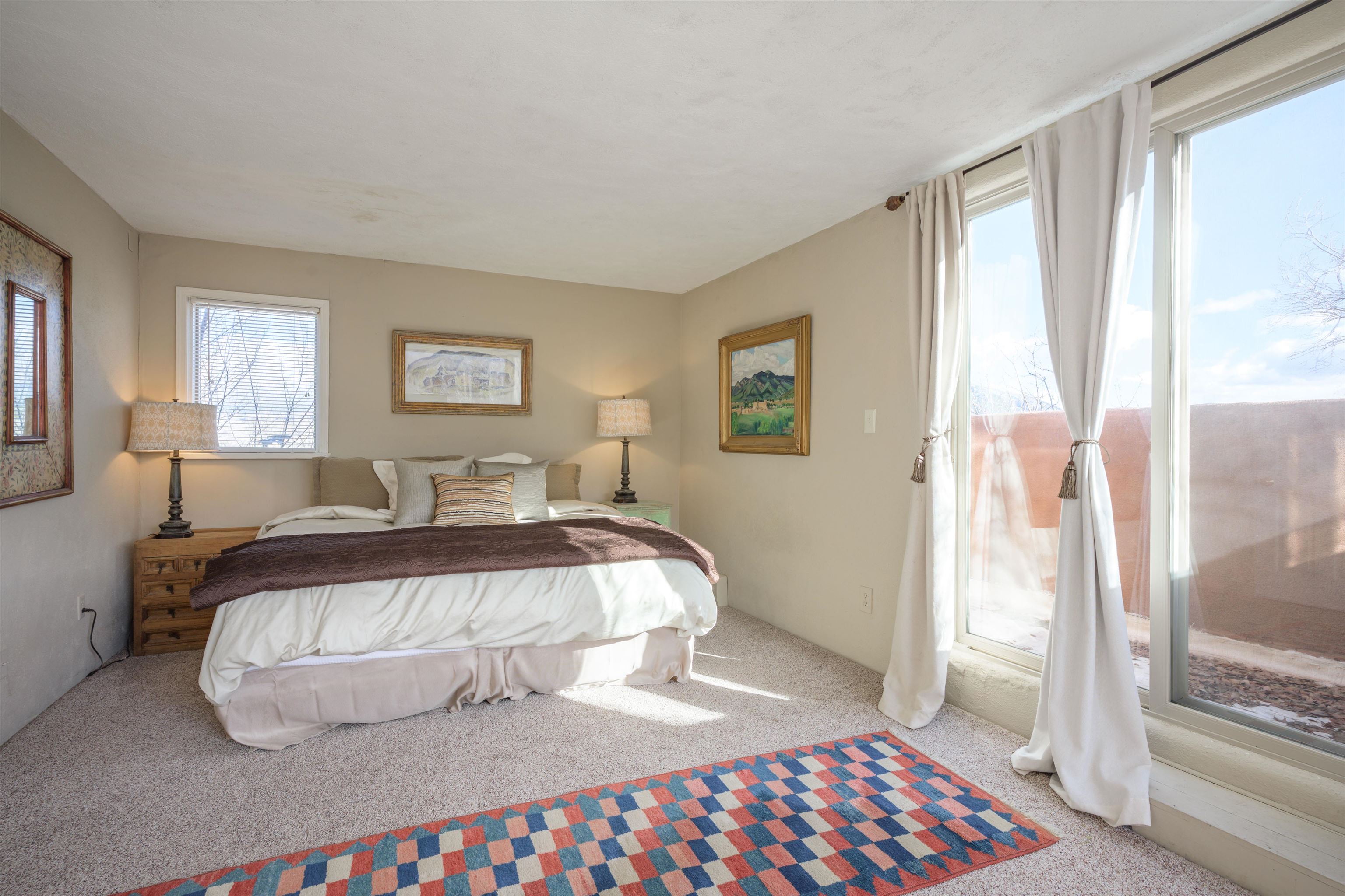 Discover classic Northern New Mexico charm in this beautifully maintained end-unit townhouse perfectly positioned between Arroyo Seco, the Town of Taos, and Taos Ski Valley. Warm architectural details—including vigas, Saltillo-style tile, carved wood accents, and hand-troweled plaster walls—give the home an inviting Southwestern character from the moment you step inside. The main level features a bright, open living area with large windows framing stunning mountain views, plus a cozy kiva-style fireplace that anchors the space. The adjacent kitchen offers generous counter space, natural wood cabinetry, and a built-in banco dining nook with sculpted adobe forms that echo traditional Taos design. A full bath with laundry adds convenient functionality on the first floor. Upstairs, both bedrooms are filled with natural light and offer access to outdoor spaces with views of the Sangre de Cristo range. The primary bedroom includes a spacious sunroom-style nook—ideal for a home office, reading area, or meditation retreat. A large second full bath with dual Talavera sinks completes the upper level. Outdoor living areas include a private walled courtyard off the kitchen and additional fenced space suitable for pets or gardening. A detached one-car carport adds covered parking and storage options. With only four units and no HOA or condo dues, this property offers rare tranquility with unbeatable proximity to skiing, hiking, dining, and the vibrant culture of Taos and Arroyo Seco. A wonderful opportunity to enjoy the best of Northern New Mexico living.