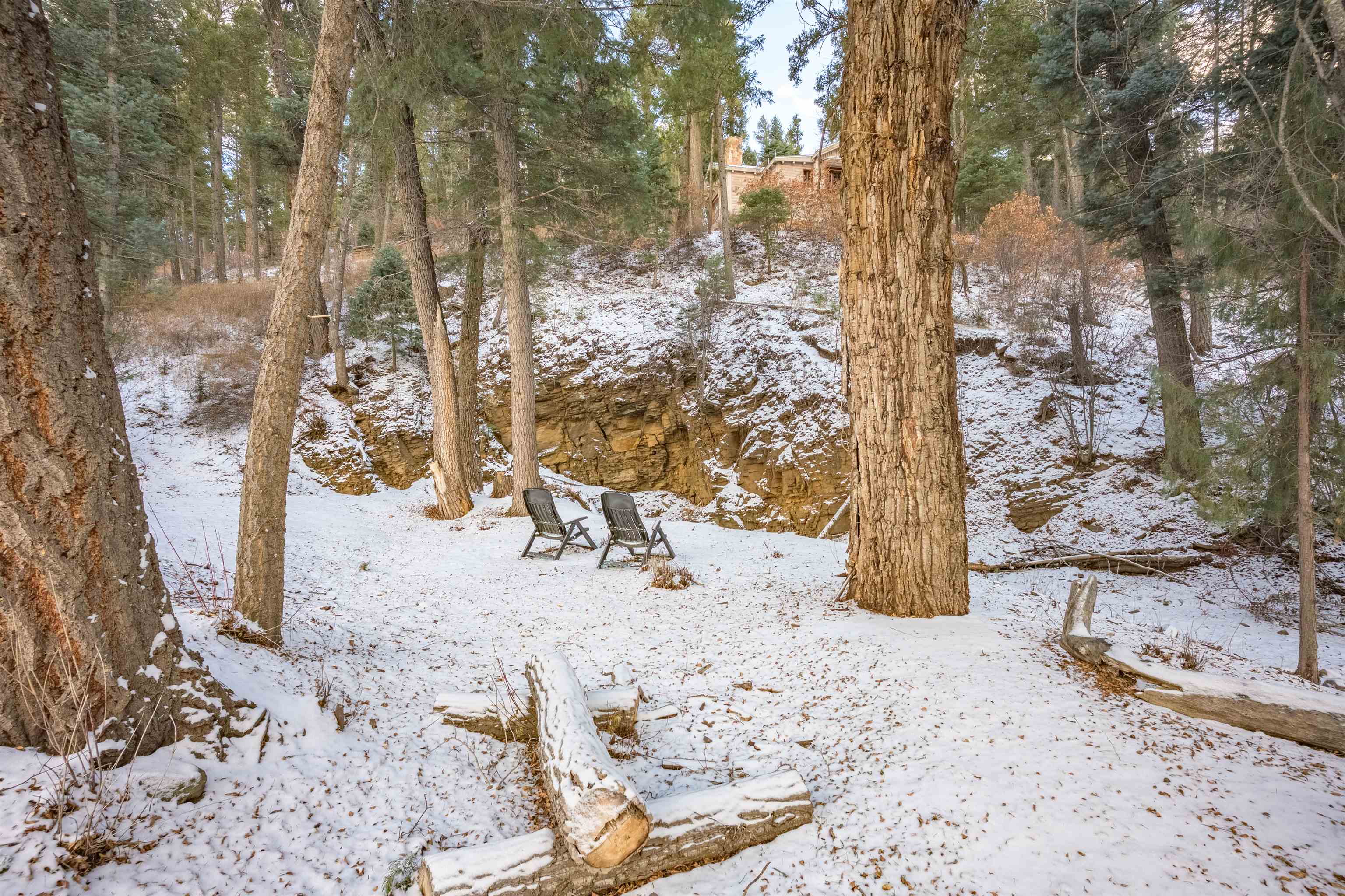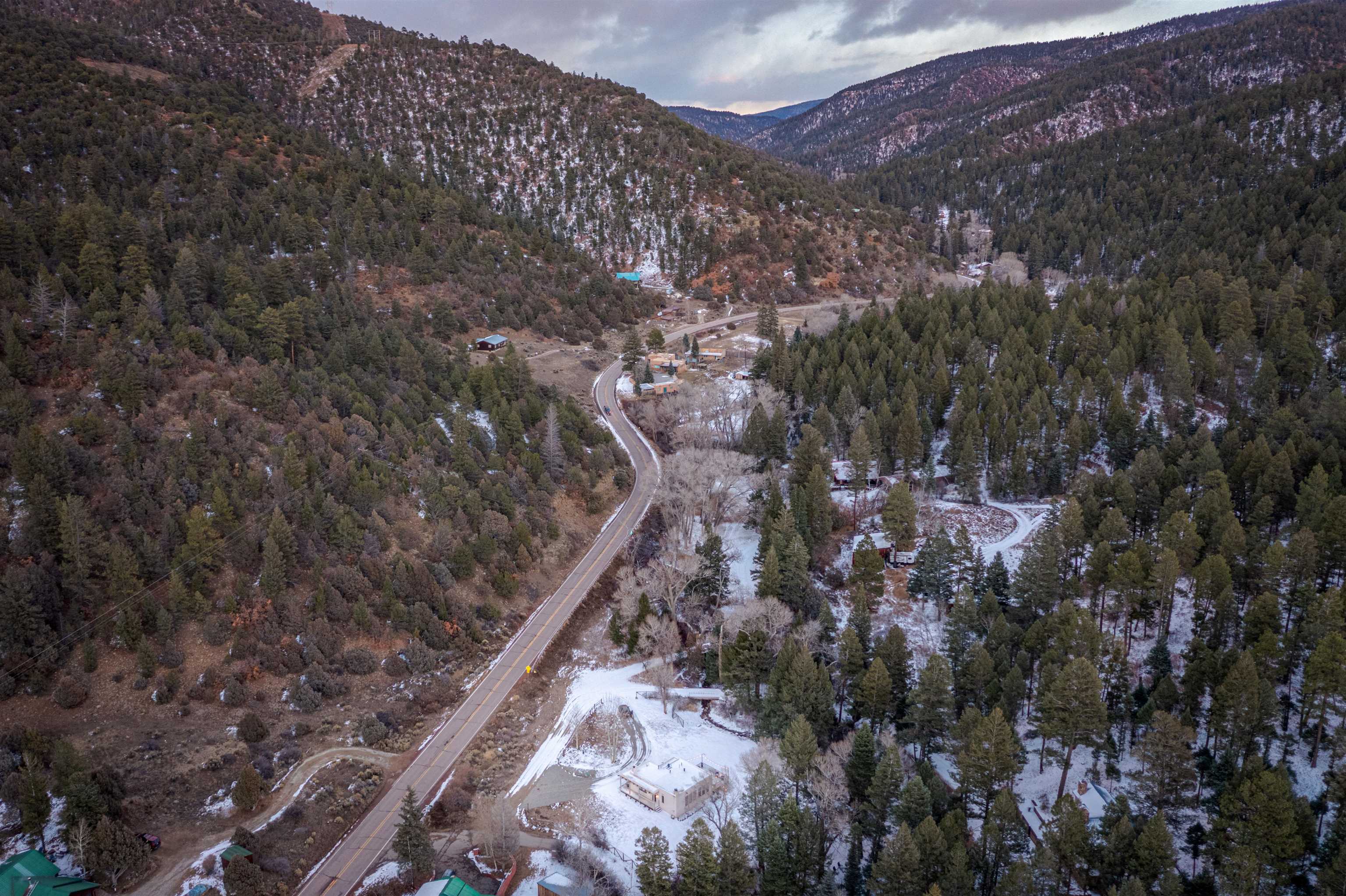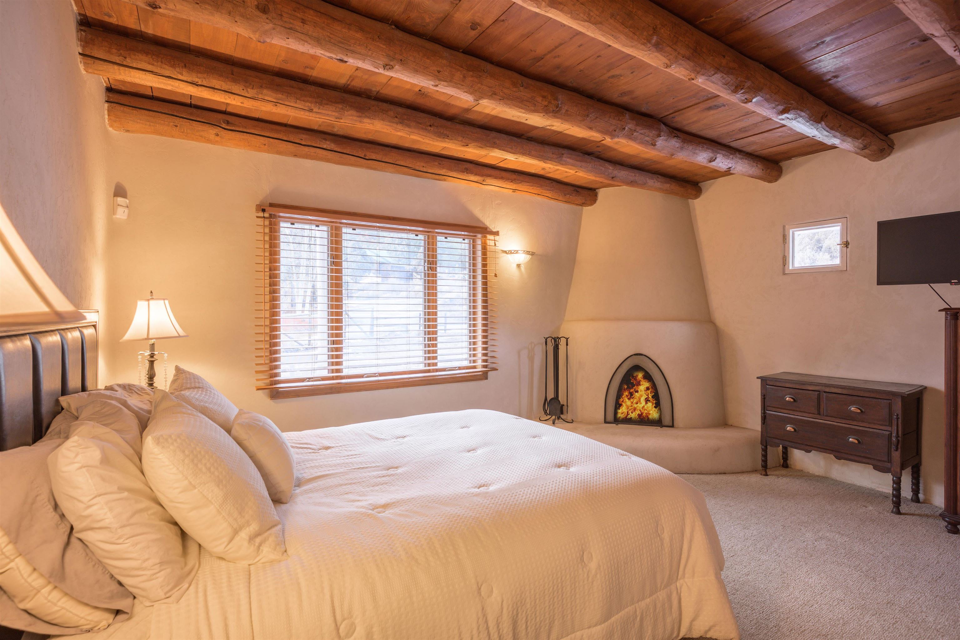 Your Winterwonderland Awaits! This turn key gem is being sold furnished as dipicted in the photos. Nestled in the heart of Taos Canyon along the Rio Fernando, this charming 1-bedroom adobe home offers a serene retreat on 0.91 acres of lush, wooded surroundings. Set back from the road and enveloped by mature trees, the property feels private and peaceful—an ideal escape just minutes from Taos and a short, scenic drive to Angel Fire or Taos. Inside, classic Southwestern craftsmanship shines through with vigas, tongue-and-groove ceilings, plaster walls, and a cozy kiva fireplace that warms the open living space. Large windows line the dining and living areas, bringing in natural light and uninterrupted views of the grassy yard and forest beyond. The updated kitchen features warm wood cabinetry, tile accents, stainless steel appliances, and a breakfast bar that blends seamlessly into the living space. The spacious bedroom includes its own kiva-style fireplace and looks out onto the surrounding greenery. A full bath and a conveniently located laundry closet complete the interior. Outdoor living is where this property truly stands out. Enjoy a morning coffee on the side patio, host gatherings on the large deck, or wander down to your own stretch of the Rio Fernando, where a shaded seating area offers a perfect spot to relax beside the running water. With nearly an acre of usable land, there’s ample room for gardening, pets, and outdoor recreation. Whether you're looking for a year-round residence or a tranquil mountain getaway, this Taos Canyon gem brings together privacy, natural beauty, and timeless Northern New Mexico character. This Gem Won’t Last Long! Reach Out Today to Schedule Your Exclusive Showing! NOTE: Fire in fireplaces are virtually staged.