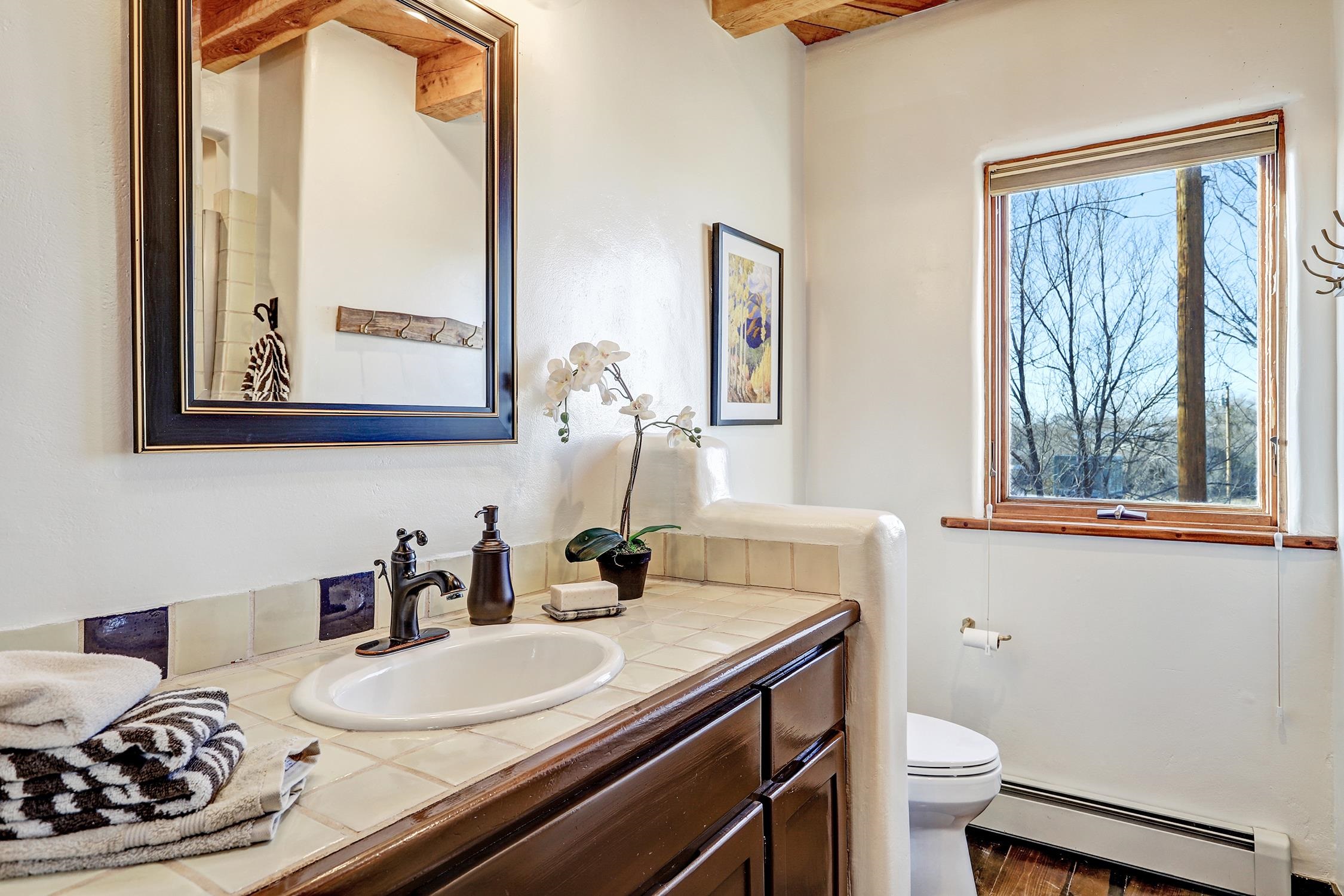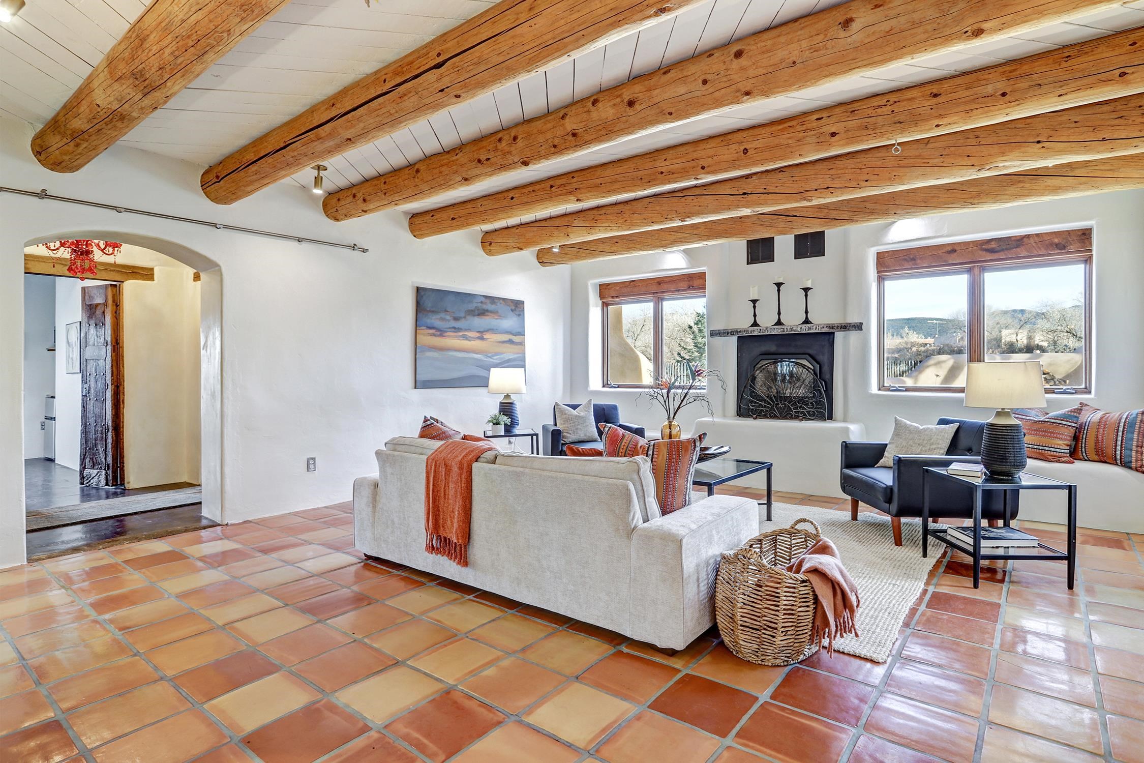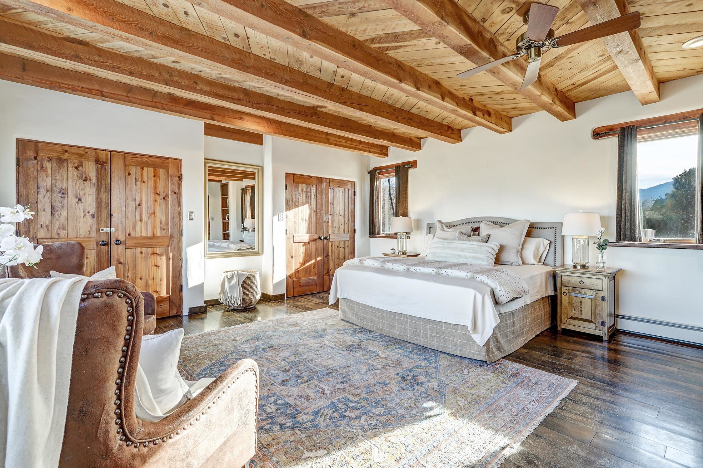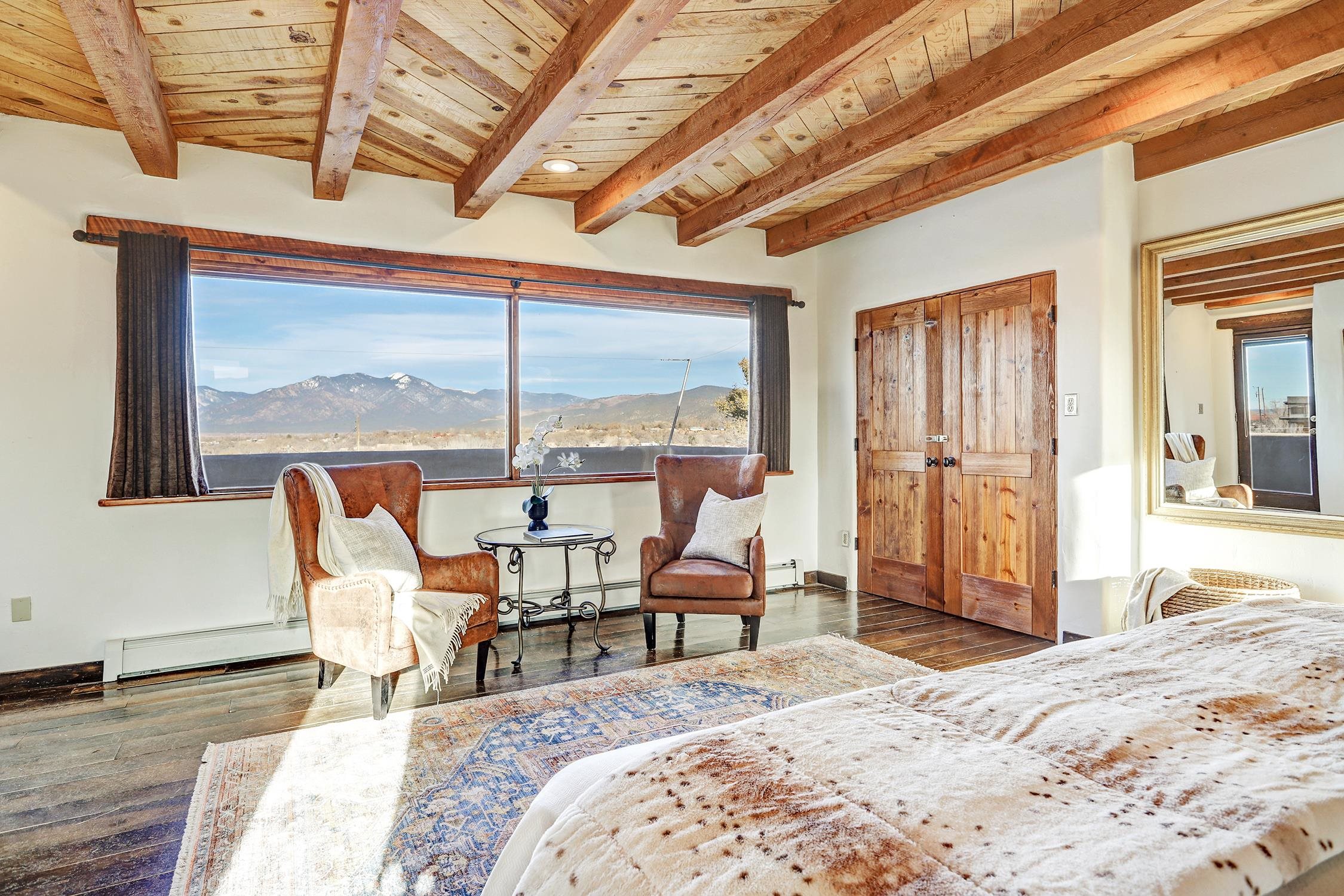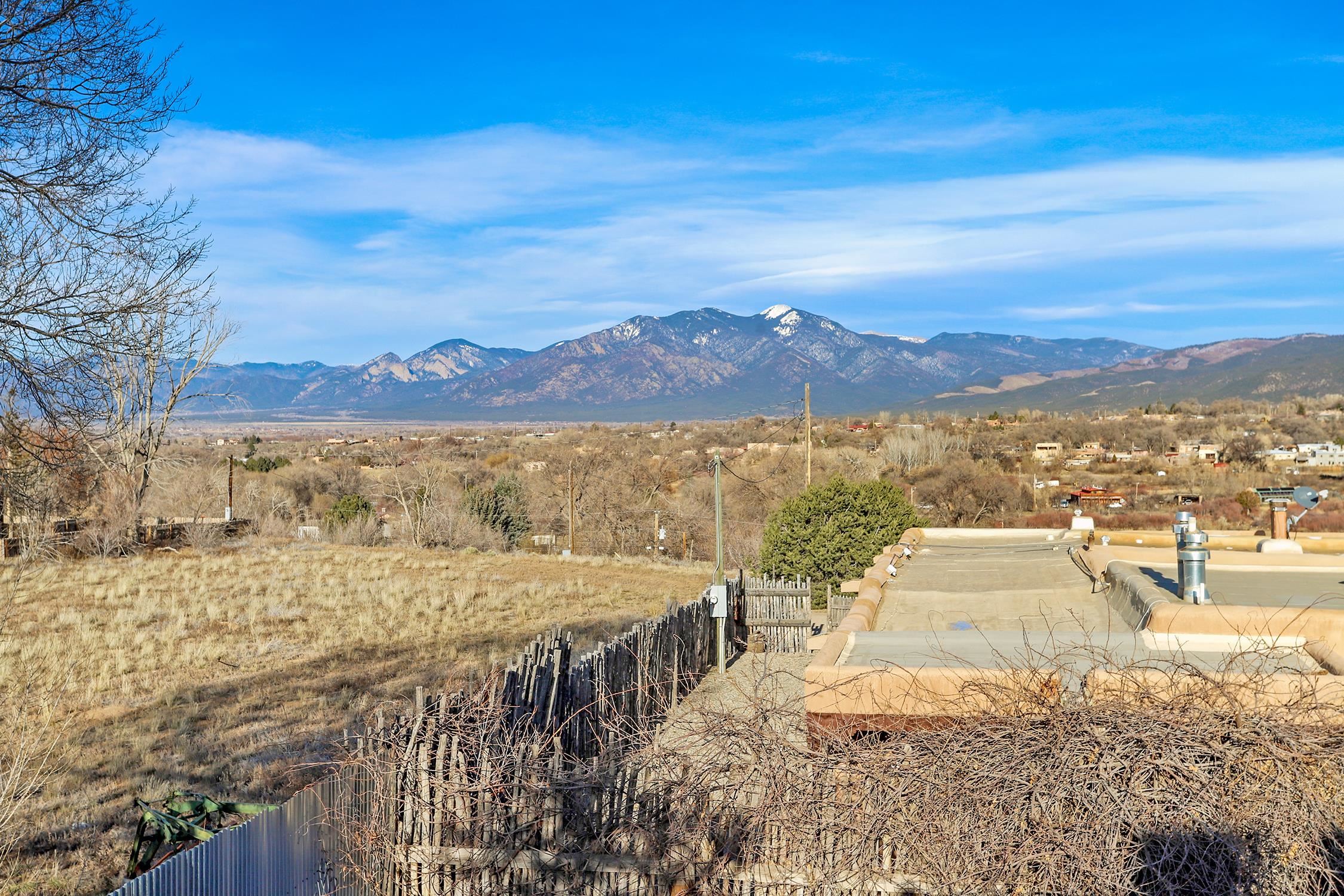 Nestled on over half an acre on the south end of Taos, this elegant 2,721 sq ft home perfectly captures the beauty, warmth, and spirit of Northern New Mexico. Step inside and feel the charm of classic Southwest design — graceful vigas and beams, Saltillo tile, stained concrete and wood floors, and abundant natural light streaming through skylights. The two-story layout offers 4 bedrooms, 3 baths, with the smaller bedroom being ideal to use as an office, studio, or nursery. Upstairs, a private suite features an ensuite bath, breathtaking Taos Mountain views, and access to a rooftop lounging area — the perfect spot to unwind beneath the New Mexico sky. Outside, you’ll find gardens, grassy spaces, and a patio with a fireplace, creating a tranquil setting for morning coffee or sunset gatherings. A flexible downstairs layout offers the potential for a glorious primary suite or even a lock off suite — ideal for guests, extended family, or rental income. Beautifully designed and filled with light, this home offers comfort, versatility, and a sense of place that is uniquely Taos.