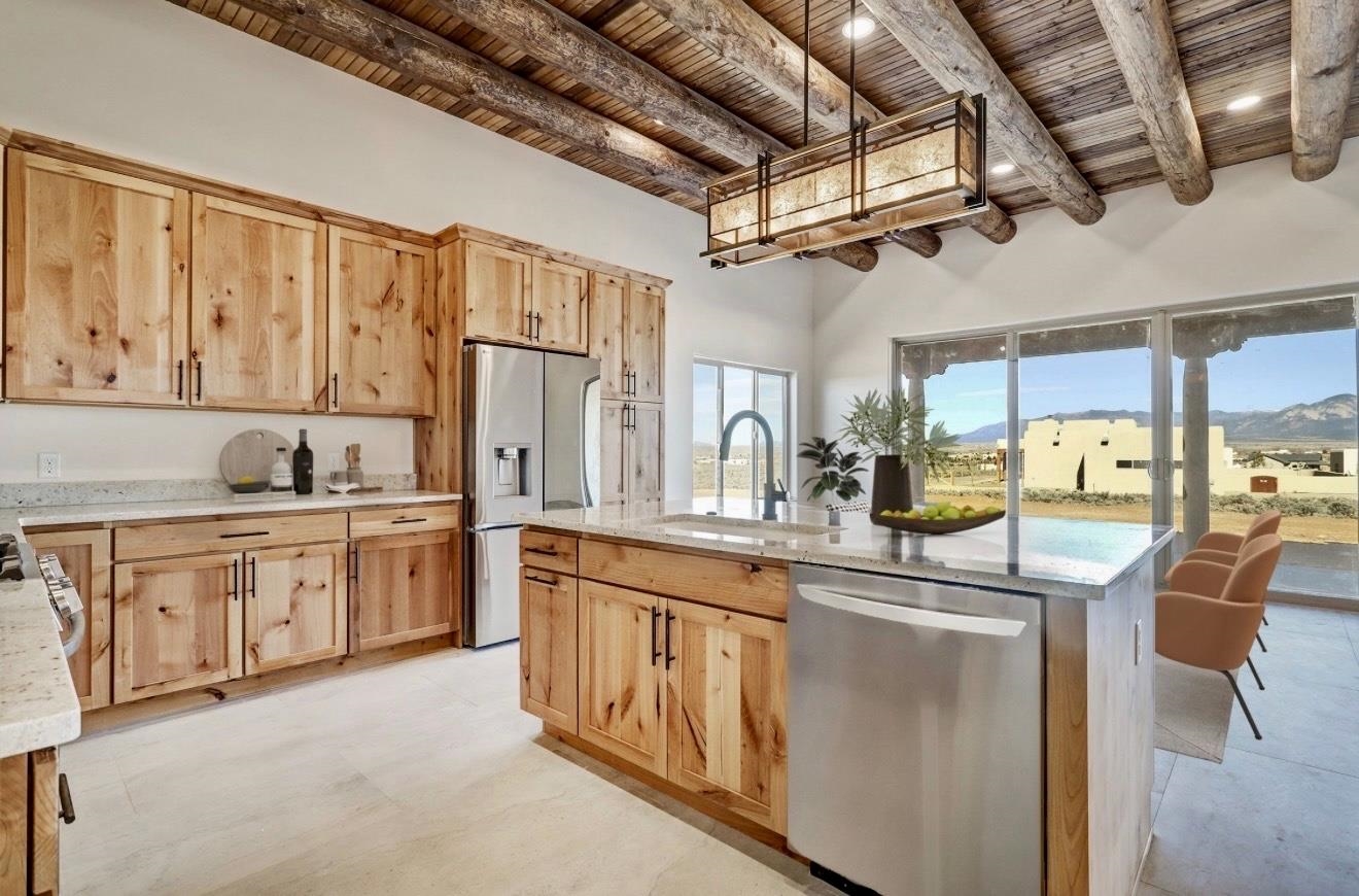 NEW CONSTRUCTION; 100% COMPLETE. Superb craftmanship by one of Taos' best builders, In and Out Plumbing and Construction. Three bedrooms and two bathrooms nicely spread out over 2034 square feet. Has granite tops, semi-custom cabinets, tile, vigas, and stainless steel appliances. The entire house has in slab, radiant heating, including the garage. Features the most amazing views of Taos Mountain.