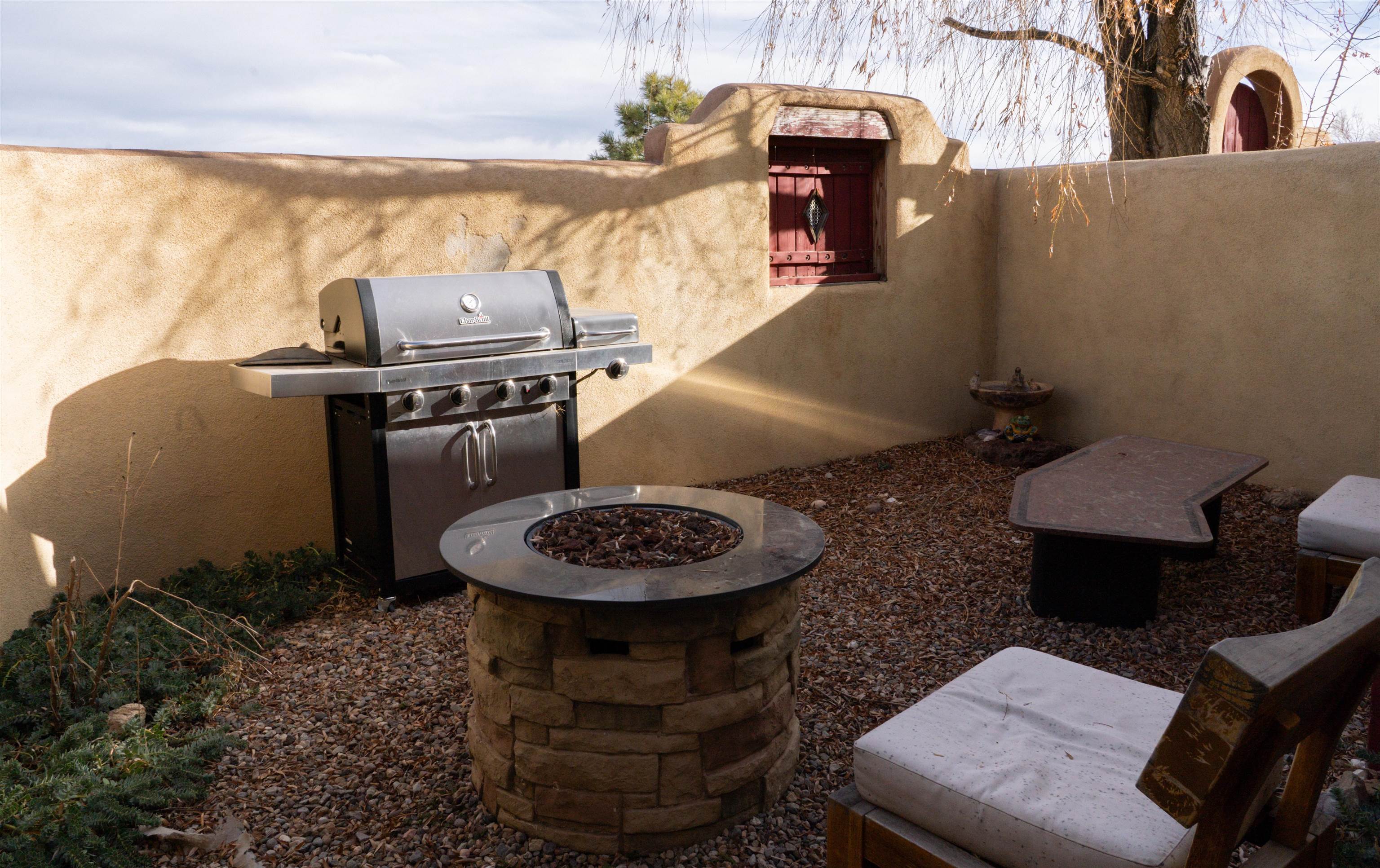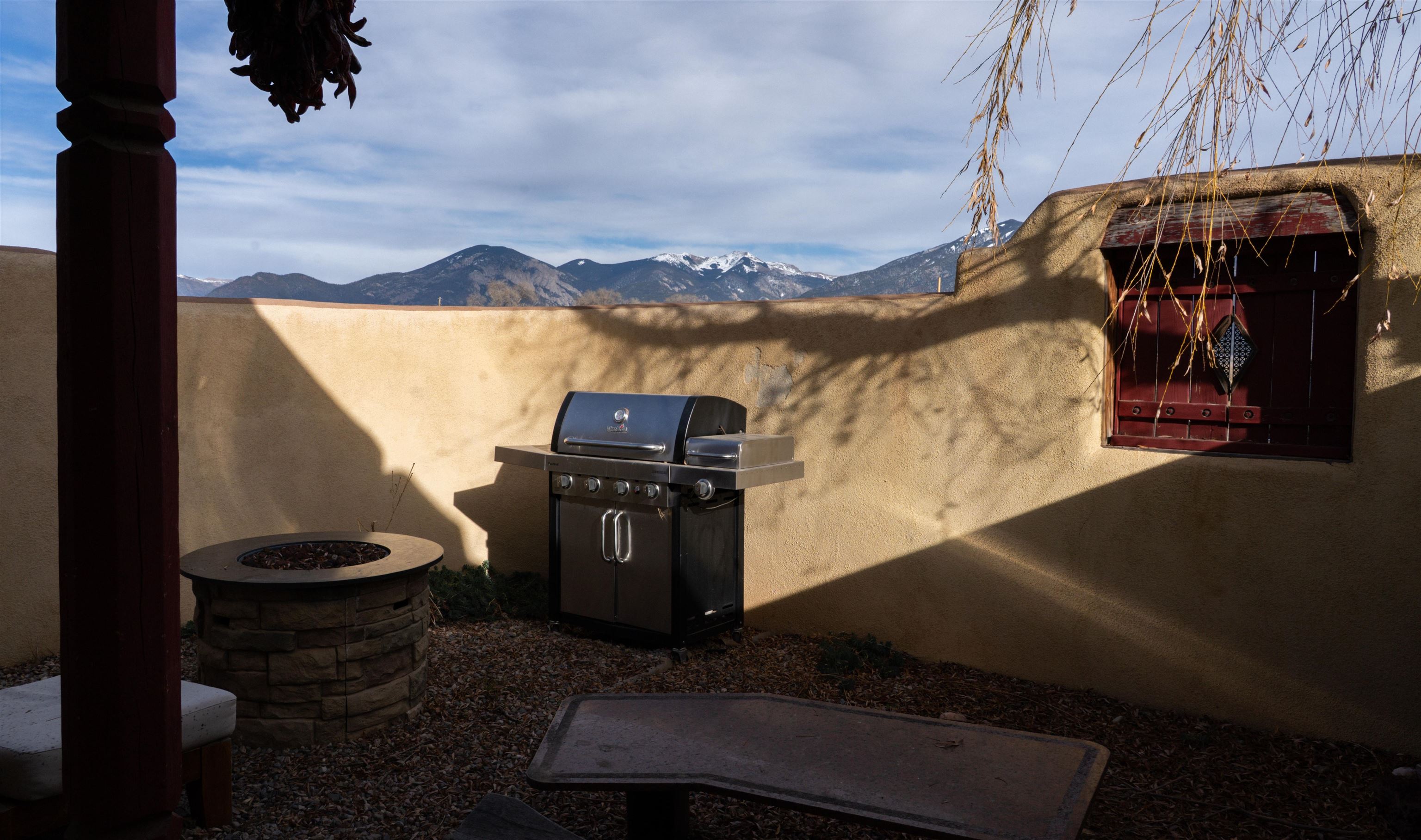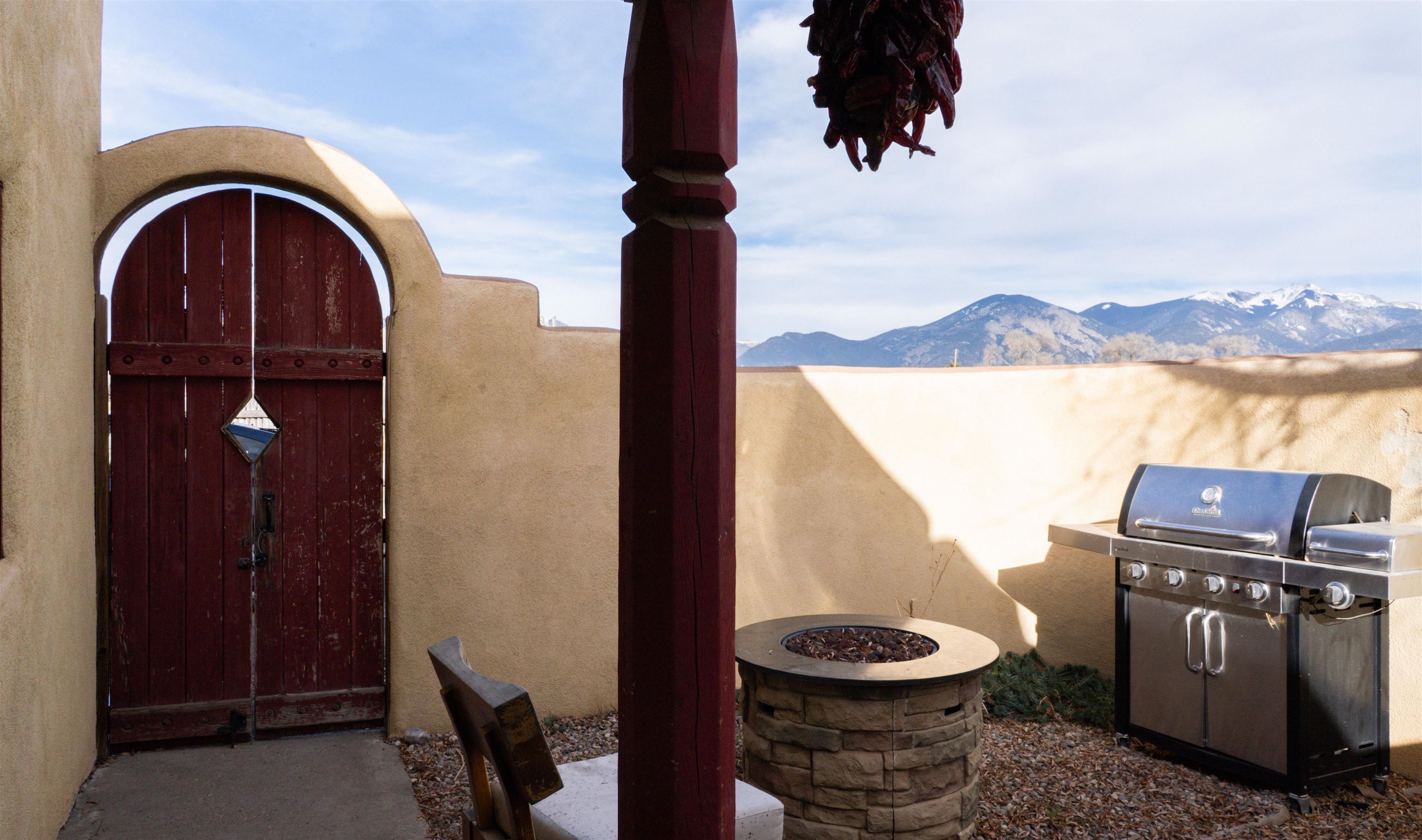 Conveniently located in El Prado, only 13 miles from Taos Ski Valley, and approximately 5 miles from Taos Plaza, this recently remodeled one-bedroom, one-bath end-unit condominium offers an ideal opportunity for a full-time residence, part-time Taos retreat, or income-producing property. The end-unit design features three exterior concrete block walls, creating excellent insulation and a strong noise barrier from the road and neighboring units. This particular unit has two of its own parking spaces next to the unit, separate from the remaining units parking spaces, along with a 10x20 garage with electric service, with an insulated ceiling, and a concrete block west wall. The garage is electrified and has previously been rented on a monthly basis, offering added flexibility and potential income. The interior includes plaster-finished walls, three ceiling fans with lights, and an efficient floor plan with abundant natural light throughout. Heating and cooling are well-supported with two heat-pump mini-splits, electric baseboard heat, and a Jøtul propane stove in the living area capable of heating the entire condo and operating without power during outages. The unit has its own individual propane tank, not shared with other units. A generator system powers the water supply during power outages, adding reliability and peace of mind. Recent 2025 updates include a complete bathroom remodel, installation of heat-pump mini-splits with separate compressor units for each room, replacement of the hot water tank with an instant propane Rinnai system designed for altitude, new appliances including washer/dryer, refrigerator, stove/oven, and water heater, upgraded electrical panel capacity, and replacement of both exterior doors with energy-efficient doors for improved heat and sound control. The condominium association has also recently updated the shared septic system. Enjoy immaculate western views of the mesa, San Antonio Mountain, and stunning Taos sunsets. The property is bordered on the west by undeveloped Taos Pueblo land, providing a rare sense of openness and privacy. Outdoor living includes a fully enclosed front patio and a partially walled rear deck. Personal Garden space along the front exterior wall, and shared garden space on the northern part of the condominium property. Easy access to all that the Taos area offers completes this well-maintained and thoughtfully updated property.