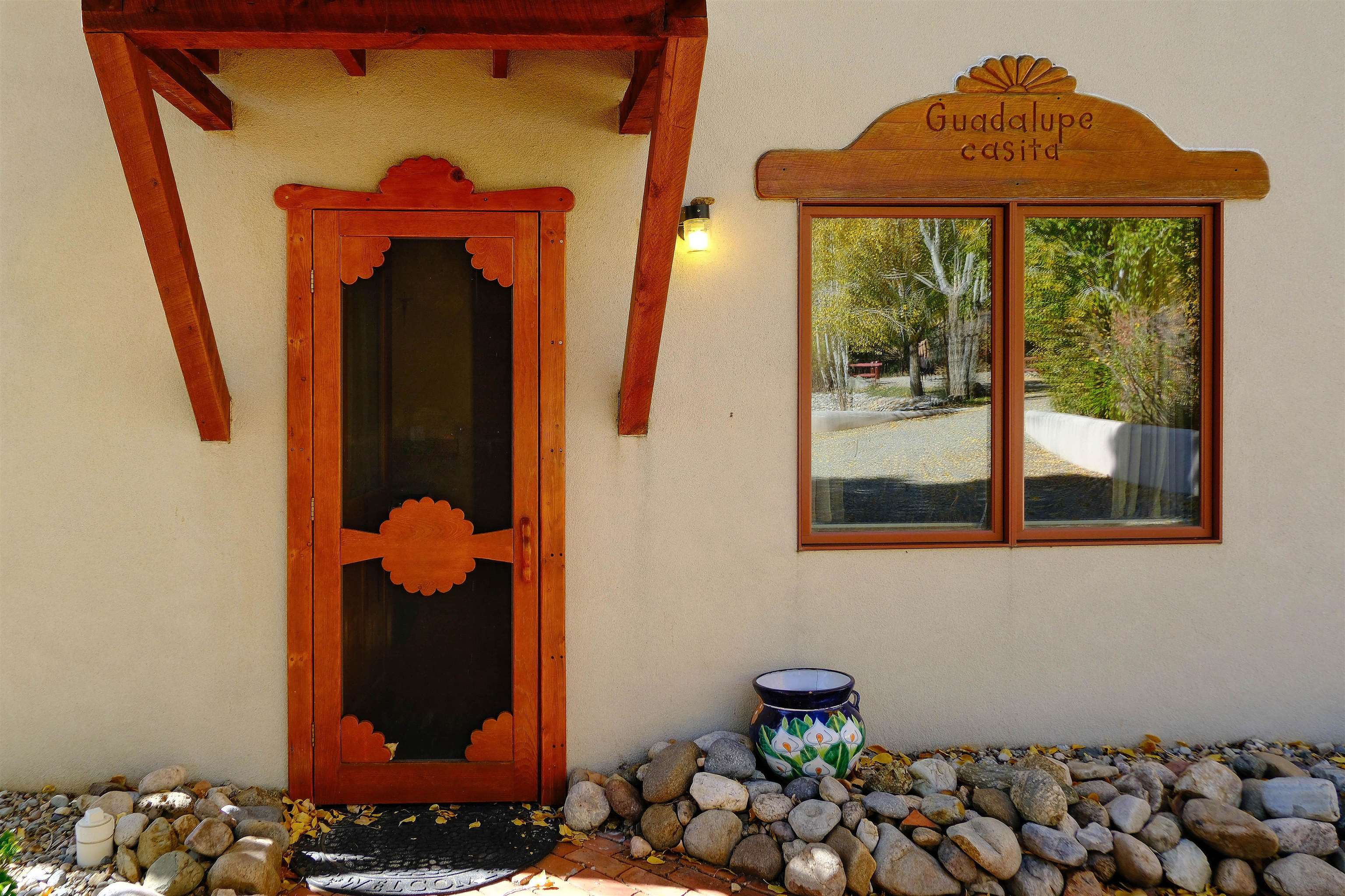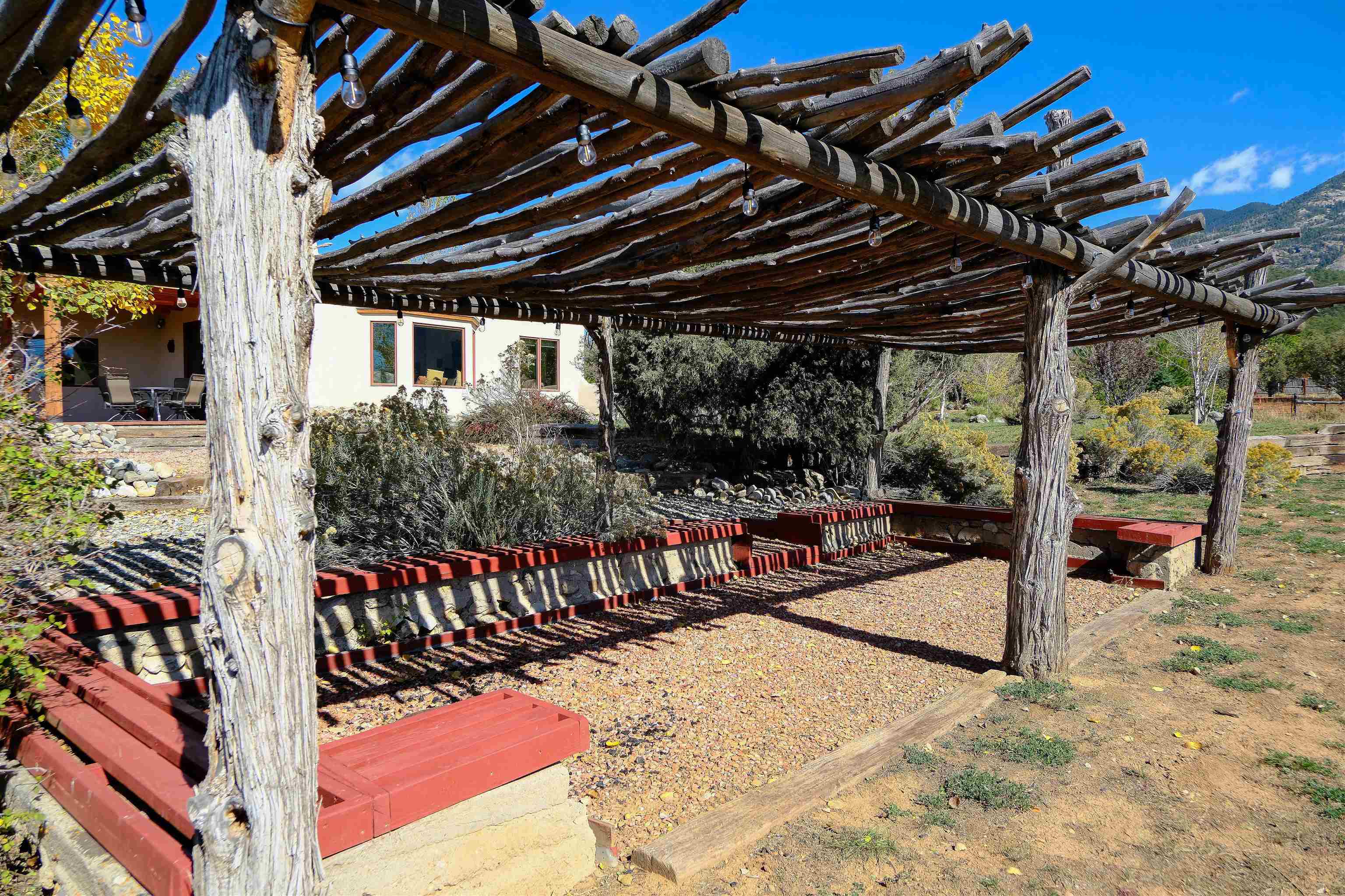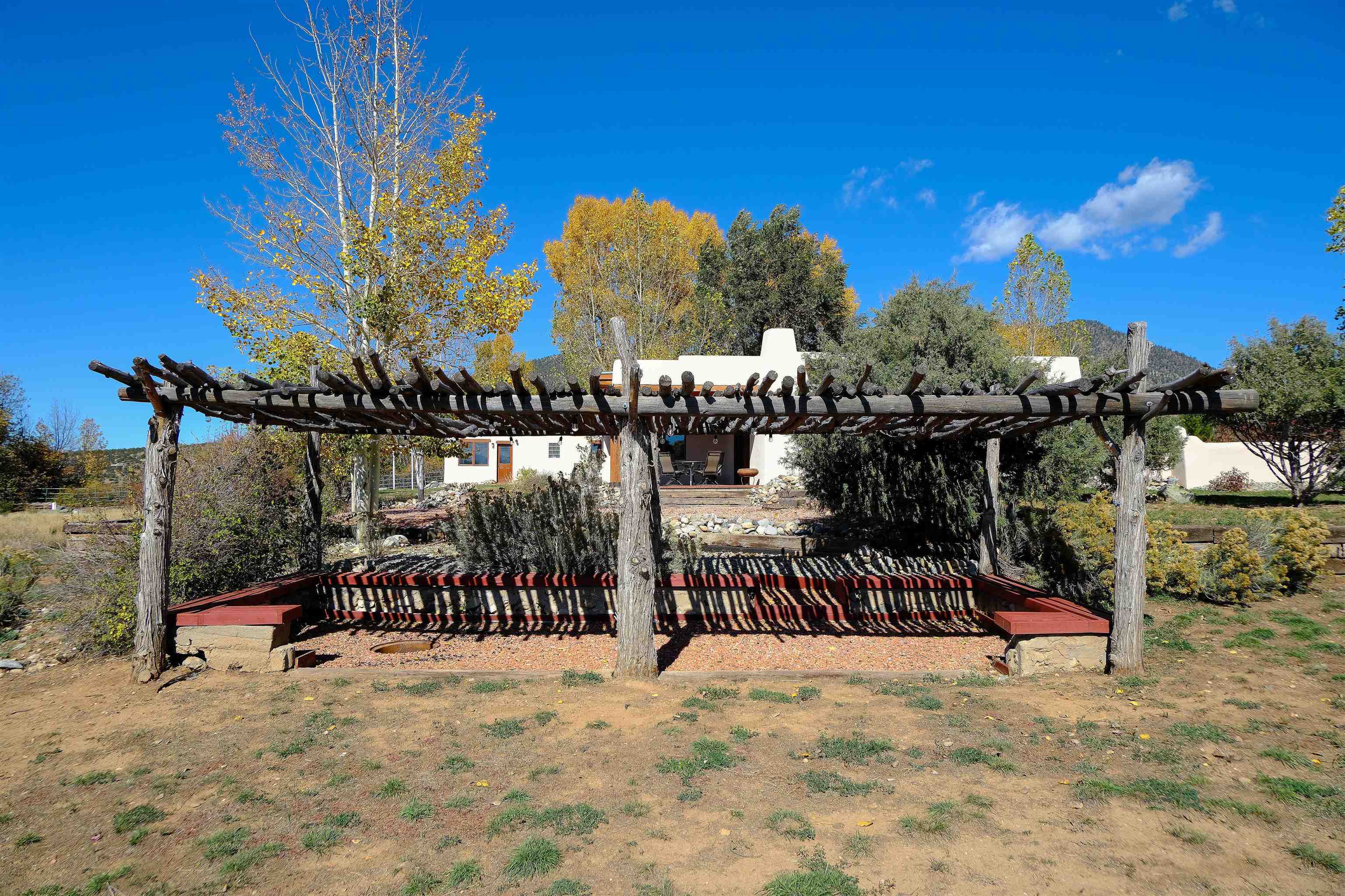 Tucked into the coveted El Salto enclave along the scenic road to Taos Ski Valley, this soulful adobe estate captures the timeless spirit of Northern New Mexico living. Set against big skies and high-desert light, the home enjoys classic Southwestern touches and stunning views in every direction. Authentic adobe construction grounds the main residence in warmth and character, with thick earthen walls, viga ceilings, diamond finish plaster, custom carved built-ins and handcrafted traditional details throughout. The main house has two beds, two baths, a fantastic chef's kitchen, an office nook with stunning, direct views of El Salto Mountain, front and back portals designed for slow mornings and golden-hour evenings, and a heated attached garage with a built-in work bench. To the side of the primary residence is a wonderful, large shady Ramada with a sunken-firepit-a perfect place to gather with friends and family under the large, expansive starry sky. The property unfolds as a true compound: the charming guest house with a full kitchen is wonderful for visitors or rental potential. The guesthouse also has a dedicated workshop for creative or practical pursuits, and an additional attached garage. There is a 3-bay pole barn on the Western edge of the property, ideal for storing equipment, and all the gear you will want to support the outdoor recreating opportunities that are literally right outside your door. 8 Juan Martinez is located at the mouth of the canyon that connects to Taos Ski Valley- 15 minutes and you're at the base of one of the best Ski and snowboard resorts in the Rockies! This custom home has been lovingly maintained by the original Owner who has created many of the custom finishes that grace this property on-site. Valuable water rights enhance both lifestyle and long-term value, supporting gardens, land stewardship, or future vision. Private, grounded, and rich with character, this El Salto offering is perfectly positioned for those who want serene mountain living with quick access to skiing, hiking, and the cultural heartbeat of Taos. A rare blend of authenticity, versatility, and location—this is Northern New Mexico living at its most genuine.
