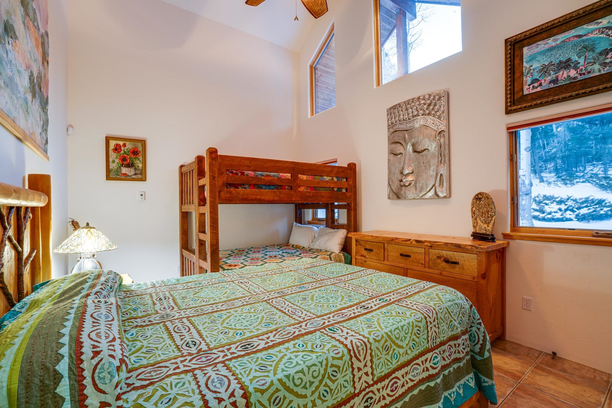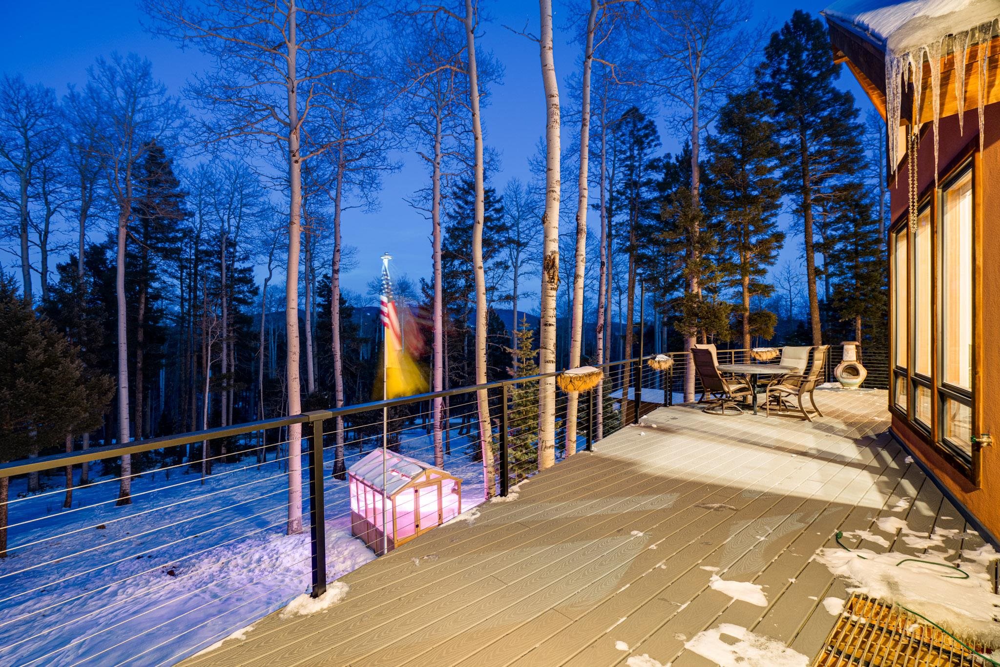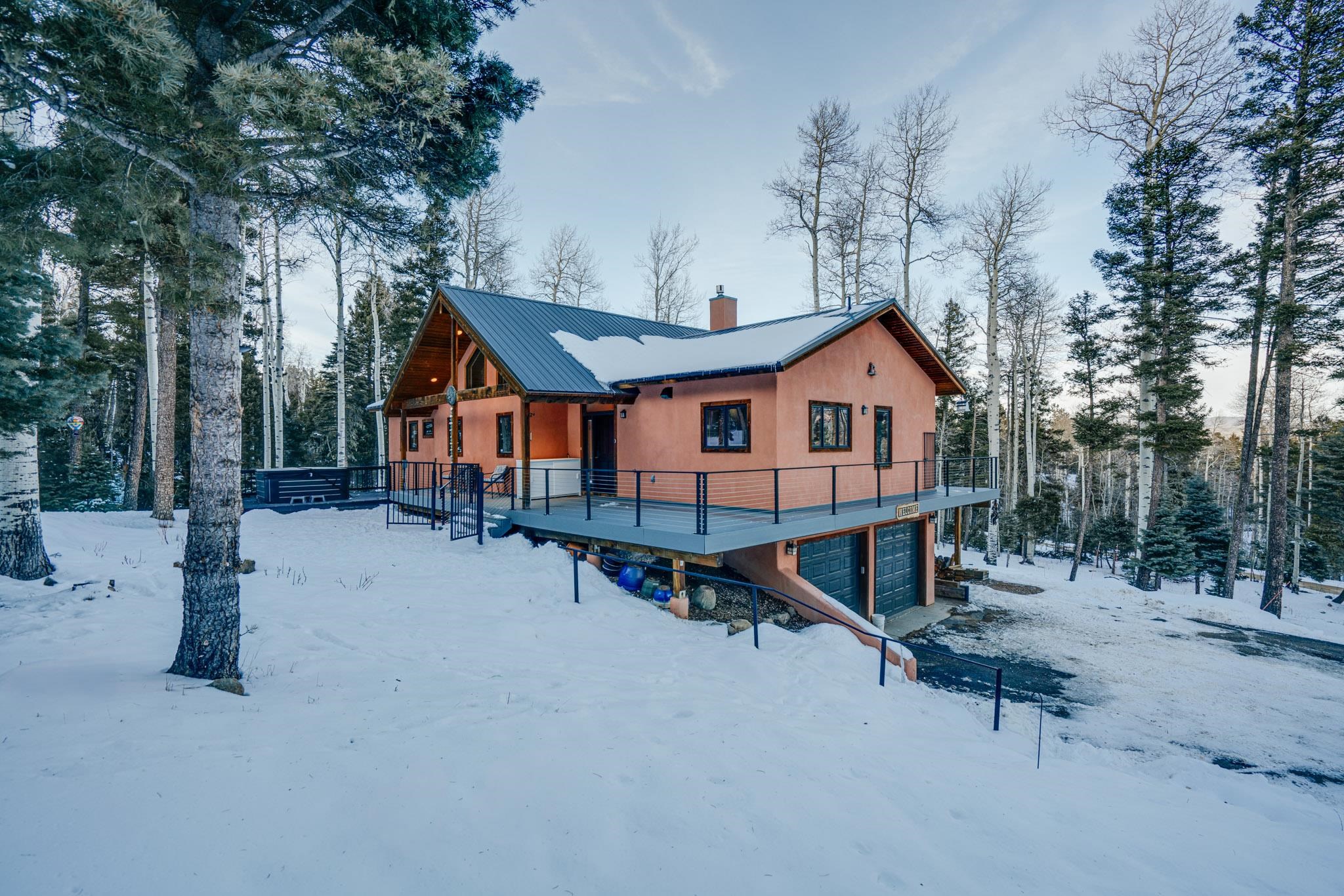 Through a stylish gate and tucked away at the top of Angel Fire is 20 Zia Road. Set on 5.05 acres amongst towering aspens and pines, you will discover the alpine home of your dreams along with privacy, beauty and effortless mountain living. Surrounded by sweeping views that allow you take in nature's perfection, sauntering elk and deer and no mosquitos, the property has everything you need. The thoughtful flow and layout of this beautiful home design features 4 bedrooms and 3 baths, thoughtfully placed on two levels while maximizing natural light, comfort and connection to the outdoors. Huge windows (so many windows!) frame the surrounding peaks and forest, flooding the interior with natural light year-round. At the heart of the home is a remodeled kitchen-a cook's fantasy come true! High-end appliances, stone counters, tasteful, richly colored cabinetry and bells and whistles galore! All bathrooms have been remodeled, as well. Two fireplaces (one in the Living Room and one in the Primary Bedroom) give you the warm glow and coziness you expect from a mountain property. Bonus points that they are connected to the thermometer and go on with the touch of a switch. Downstairs, in the family room, is a wood stove- because sometimes you just want to burn wood-ahh that smell and crackle! There are two bedrooms and two bathrooms upstairs, and two bedrooms and one bath downstairs, so there is loads of space for togetherness or quiet spots to go hide and read a good book. Outdoor living truly shines here, with 3/4 of the house surrounded by TREX decking and modern peer- through railings. The deck is spacious and wide, allowing for large or small gatherings when you fire up the grill. There is generous space for outdoor meals, cloud-watching, cocktails or enjoying the quiet of listening to leaves dancing in the breeze.The property conveys with a family size hot tub, greenhouse, back-up generator and large storage shed. This home is being sold turn-key so you can easily begin enjoying everything Angel Fire has to offer immediately and begin making memories: the Country Club, lake, skiing and golf! Whether you're seeking a full-time residence, vacation home or investment, this property will charm you!