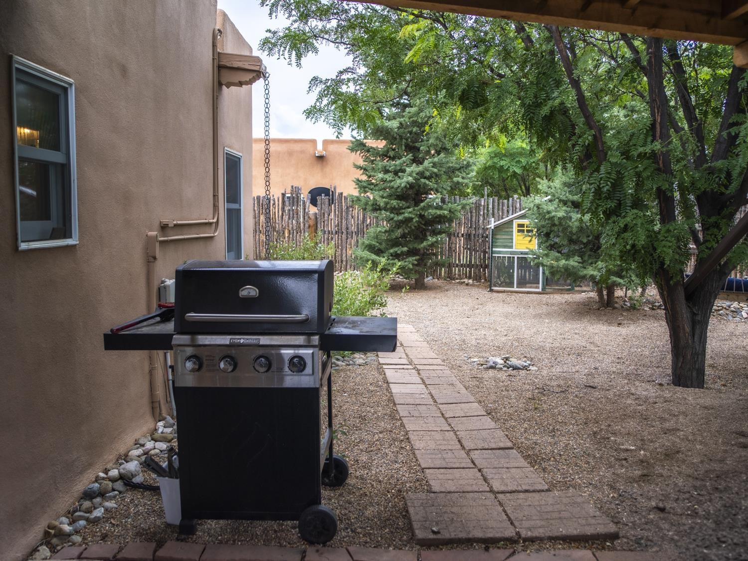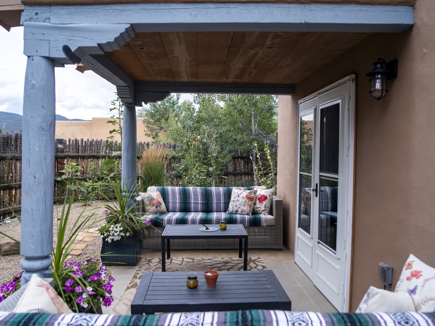 YOUR PICTURE-PERFECT TAOS DREAM HOME delivers the ultimate combination of village walkability and private sanctuary living. Perfectly positioned just steps from the historic Taos Plaza, galleries, vibrant restaurants, and the beautifully renovated Fred Baca Park this move-in-ready 3-bedroom, 2-bathroom Pueblo-style residence offers an unbeatable location without sacrificing serenity. The experience begins at the front gate, where a fully fenced perimeter leads to a beautifully manicured entry courtyard. The gentle sound of a trickling fountain sets a tranquil tone before you even step through the front door. Inside, the 1,462-square-foot open floor plan is a masterclass in Southwestern craftsmanship, featuring authentic viga and tongue-and-groove ceilings, tiled floors throughout, and a charming traditional fireplace that serves as the heart of the living space. The chef’s kitchen has been thoughtfully reimagined with new upscale appliances, ample counter space for preparation, a casual dining breakfast bar, and plentiful storage. Designed for effortless year-round comfort, the residence features the constant warmth of radiant floor heat and the modern efficiency of mini-split air conditioning—a rare luxury for in-town living. The expansive primary suite serves as a true retreat, offering an attached bath and direct access to a stunning landscaped patio where a secluded hot tub awaits under the stars. Two additional bedrooms provide versatile space for a creative studio, home office, or guest quarters. The outdoor living spaces are a hidden oasis of sustainability and peace. Beyond the flagstone patio, the meticulously landscaped backyard reveals a lush environment with prolific pear trees, a "magical" quartz fountain, and numerous vignettes designed for lounging, dining, or meditation. Additional features include an attached one-car garage with custom shelving and an "adorable green shed" for extra storage. Connected to town water, sewer, and natural gas, this home provides the ultimate in convenience. Live in a community where local treasures are at your doorstep, all while enjoying the quiet, turn-key seclusion of this meticulously maintained Taos jewel.