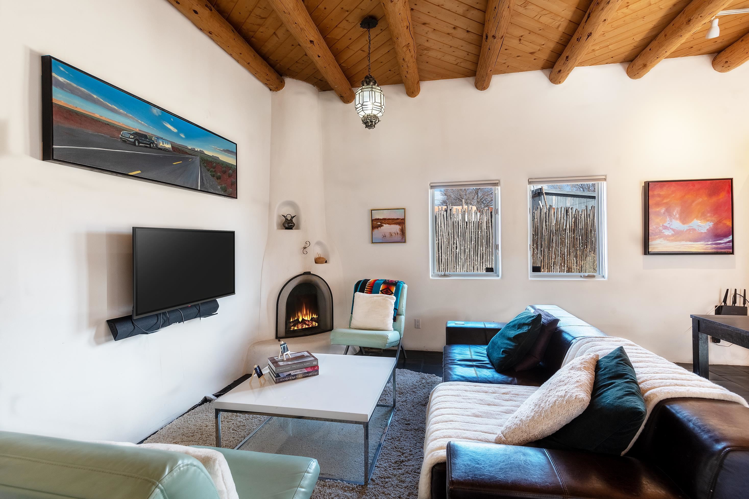 This home is a dream come true if you're looking for an iconic Ranchos adobe! Behind the Blue Door is a walled flagstone patio creating a grand entryway. This 2319 sq ft adobe home has been tastefully renovated and modernized, preserving the original 1930's feel with vigas and tongue and groove ceilings throughout. Saltillo tile floors are warmed by in-floor radiant heat. This home features two distinct living areas. The large, primary living area with wood floors southwestern style fireplace and bancos is currently used as a working artist's studio and gallery with a reception area and private entrance. The other side of the soaring foyer leads to an open living room, warmed by a second fireplace, with dining room and newly renovated kitchen beyond. Double glass doors lead to an enclosed back courtyard ideal for entertaining. The downstairs includes a full bathroom and separate laundry room. Curving wooden stairs adorned with nichos lead to the two bedrooms. The primary bedroom has an attached bathroom and a private deck. A bedroom built-in and a large closet in the hall serve for ample wardrobe space. The third southwestern style fireplace is tucked in the corner of the comfortable guest bedroom. A gated drive-way along the north side of the home takes you to a detached two-car carport and workshop ideal for a second "maker space." all on 0.184 acres