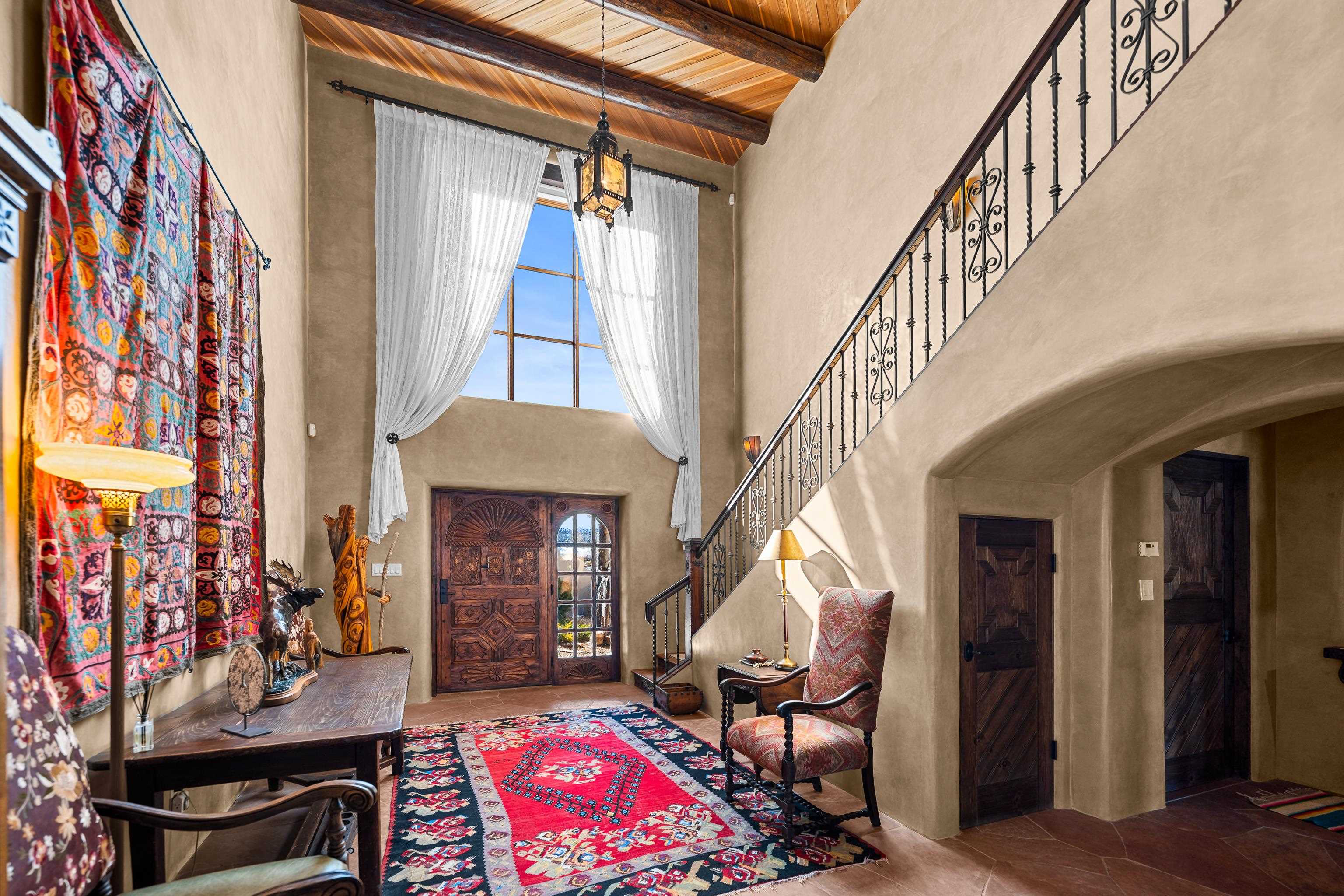 Hacienda de Suenos is a luxury Taos estate and custom adobe-style residence showcasing classic Southwestern architecture, 5 bedrooms, 3 full baths, and 2 half baths, offering approximately 5,995 square feet of living space on 2.05 fully fenced acres in Ranchos de Taos overlooking the Talpa Valley. The property captures expansive views of Taos Mountain, El Salto, and the lush Talpa Valley while maintaining privacy, security, and convenient access to town amenities. A hand-carved front door opens to a grand entry with soaring ceilings, vigas, abundant natural light, and interiors designed to honor traditional New Mexican craftsmanship. The home includes five well positioned bedrooms, including two primary suites with private outdoor seating areas and mountain views. A spacious private office provides a refined and quiet setting for work, study, or creative pursuits. Bathrooms feature hand-painted cabinetry and colorful tile reflecting artisan detail and regional character. The kitchen and pantry are designed for both daily living and entertaining, featuring premium appliances, generous workspace, and easy flow to adjacent living areas. An elegant dining room with banco seating and hand-carved wood details provides a distinctive setting for intimate dinners and larger gatherings. Three fireplaces, two wood-burning and one gas, provide warmth, architectural interest, and year-round comfort. Designed for the Taos lifestyle, the property emphasizes seamless indoor-outdoor living. Exterior features include an outdoor kitchen, multiple covered and open seating areas, and a hot tub positioned to enjoy open skies, valley views, and evening sunsets. Established perennial and vegetable gardens, mature fruit trees, and thoughtfully landscaped grounds enhance the sense of a private valley retreat. Infrastructure reflects long-term planning and energy efficiency. The home incorporates passive and active solar design, radiant floor heating for consistent comfort throughout the colder months, and an extensive solar hot water heating system that maximizes efficiency and energy savings. A natural gas–powered generator provides dependable electrical backup during outages. Two garages, along with a heated tack room and storage shed, provide practical comfort and year-round functionality. A comprehensive security system with integrated cameras and private gated entrances further supports privacy and peace of mind. The 2.05-acre parcel provides open space, panoramic views, and access to the road below for quiet walks. Water rights to the Acequia del Finado Francisco Martinez convey with the property, an increasingly valuable asset in Northern New Mexico. Additional acreage is available separately and includes approximately 4.35 acres of pasture, a round pen, and barns with water and electricity, along with water rights to two additional acequias. This offering supports equestrian use and provides expanded flexibility for buyers seeking a Taos equestrian property or extended estate configuration. Hacienda de Suenos combines authentic Southwestern architectural detail, custom craftsmanship, solar infrastructure, water rights, privacy, security, and optional equestrian expansion in a desirable Ranchos de Taos setting overlooking the lush Talpa Valley, minutes from Taos Plaza, the Taos Country Club Golf Course, and Taos Ski Valley.
