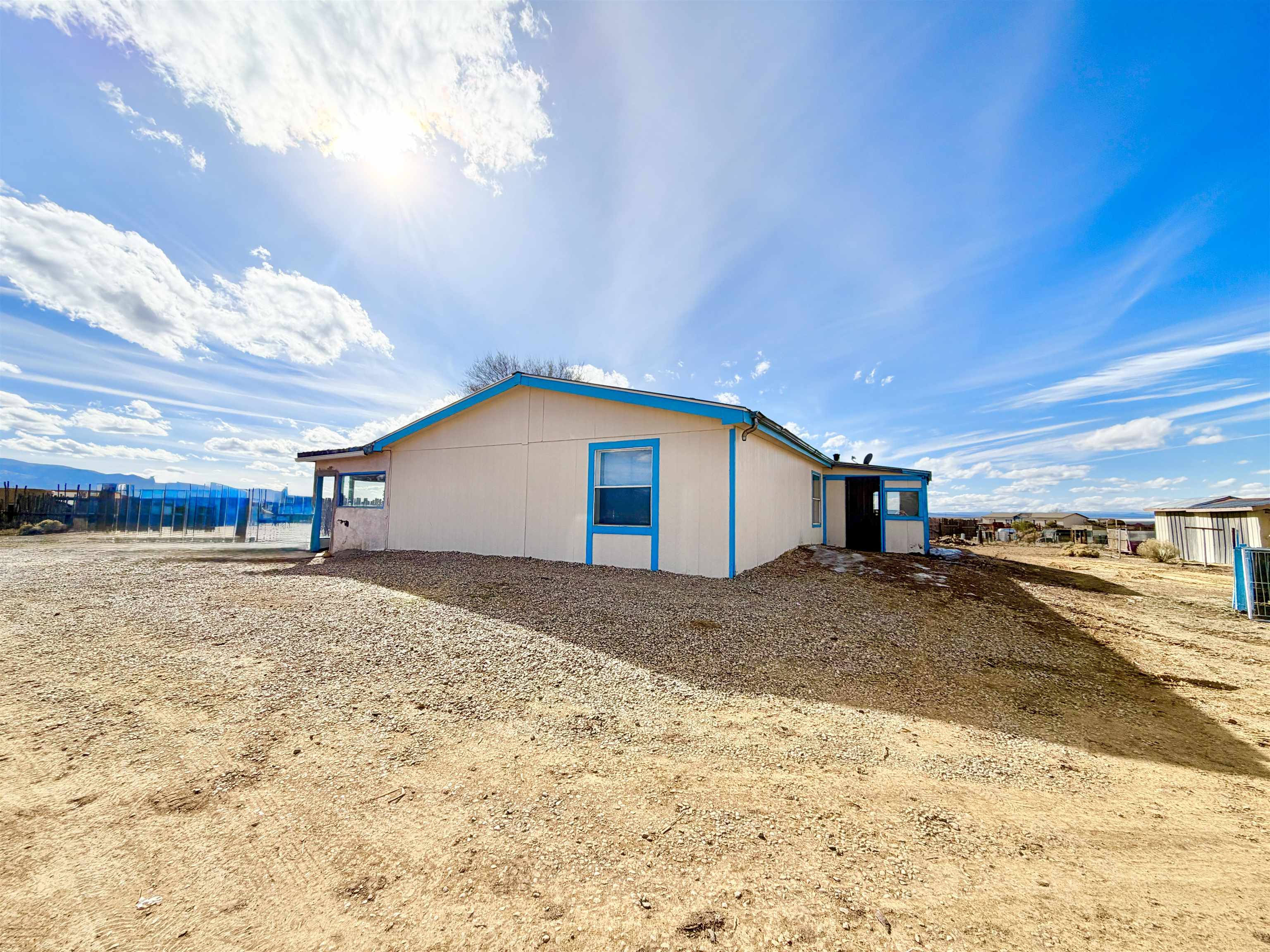 This spacious 76'x28' manufactured home, spanning approximately 2,326 square feet, offers very nice views and an expansive open sky. With four bedrooms and three bathrooms, it provides ample room for your family and any future endeavors. The property features a second area on the north side, equipped with water and septic hookups, ideal for constructing or placing another manufactured home. Additionally, a detached, hand-built garage and a shed are conveniently located adjacent to the main residence. Upon entering, you are greeted by a generous sunroom that seamlessly transitions into the main living room through the front door. The expansive common areas, characterized by high ceilings, create a welcoming and airy atmosphere throughout the home. Three spacious bedrooms and a bathroom are situated on the east side, while the primary bedroom and ensuite bathroom are located on the west side. A third bathroom adjacent to the washroom ensures easy access for entertaining guests and accommodating visitors. This home offers generous accommodations, providing ample opportunities for imagination and creativity. Contact us today to schedule a viewing and discover how this property can best meet your needs.