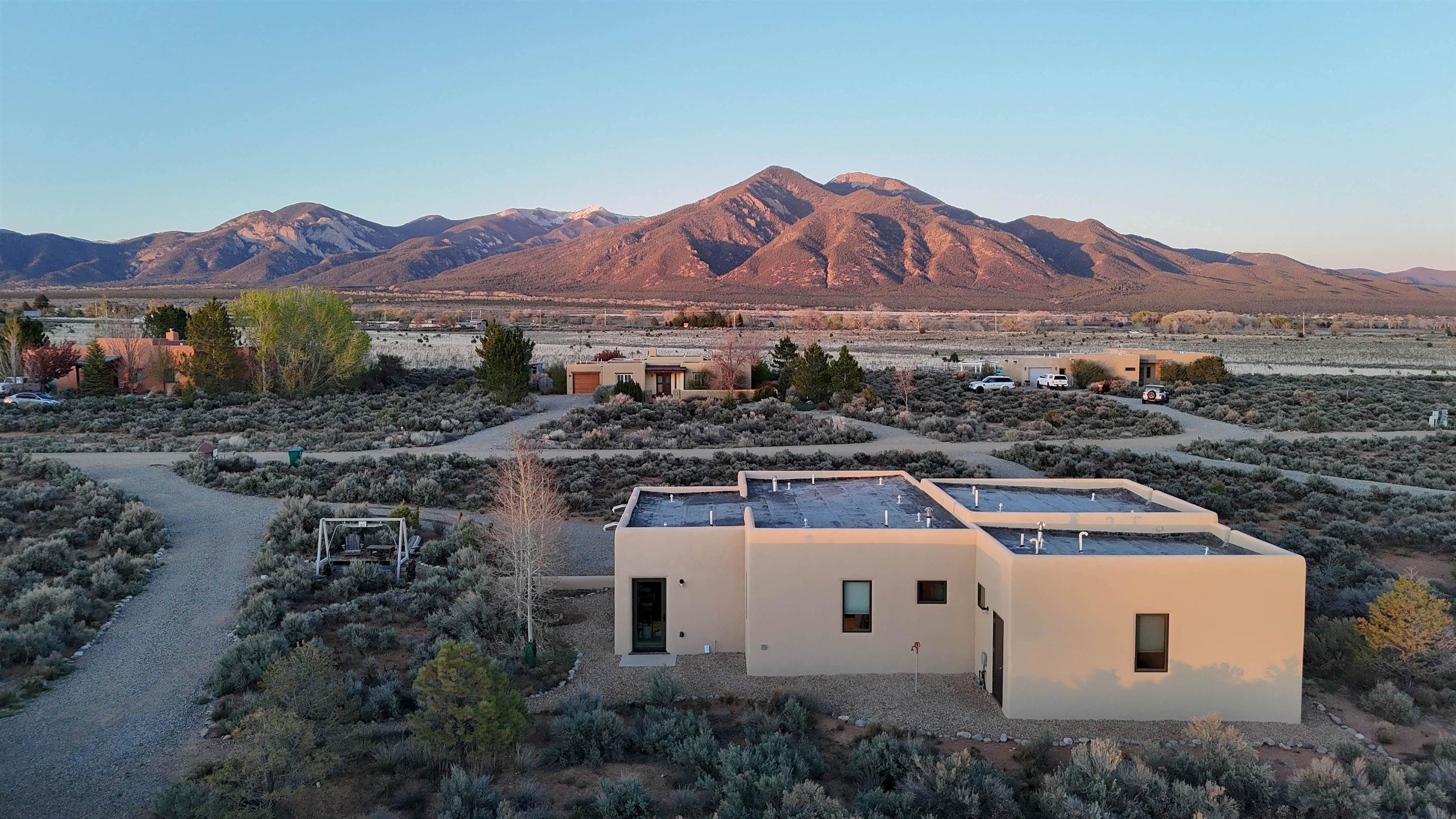 Framed by unobstructed views of Taos Mountain and set in one of El Prado’s most desirable locations, this 2018-built residence reflects a thoughtful, modern approach to high-desert living. The architecture is clean and restrained, allowing light, proportion, and landscape to take the lead. Just 10 minutes from the Plaza in Taos and 20 minutes from Taos Ski Valley, the setting offers both quiet and connection, perfect for supporting a range of living and income possibilities. The 1,748 sq ft main home features 2 bedrooms and 2 baths beneath soaring ceilings, with radiant-heated concrete floors grounding the interiors in warmth and subtle texture. Open living spaces are intentionally oriented toward the mountain, creating a seamless dialogue with the indoors. Finishes are contemporary and refined, with an emphasis on clean lines, natural light, and livable simplicity. An attached heated garage integrates convenience without interrupting the home’s aesthetic clarity. A completely separate 740 sq ft guest house — 1 bedroom, 1 bath — mirrors the same design sensibility. Bright, efficient, and beautifully proportioned, perfect for a private retreat, studio, or income-producing space with a strong short-term rental history available for review. Well-sited on its acre, modern in execution, and quietly architectural in presence, this is a home where design and landscape are in balance.
