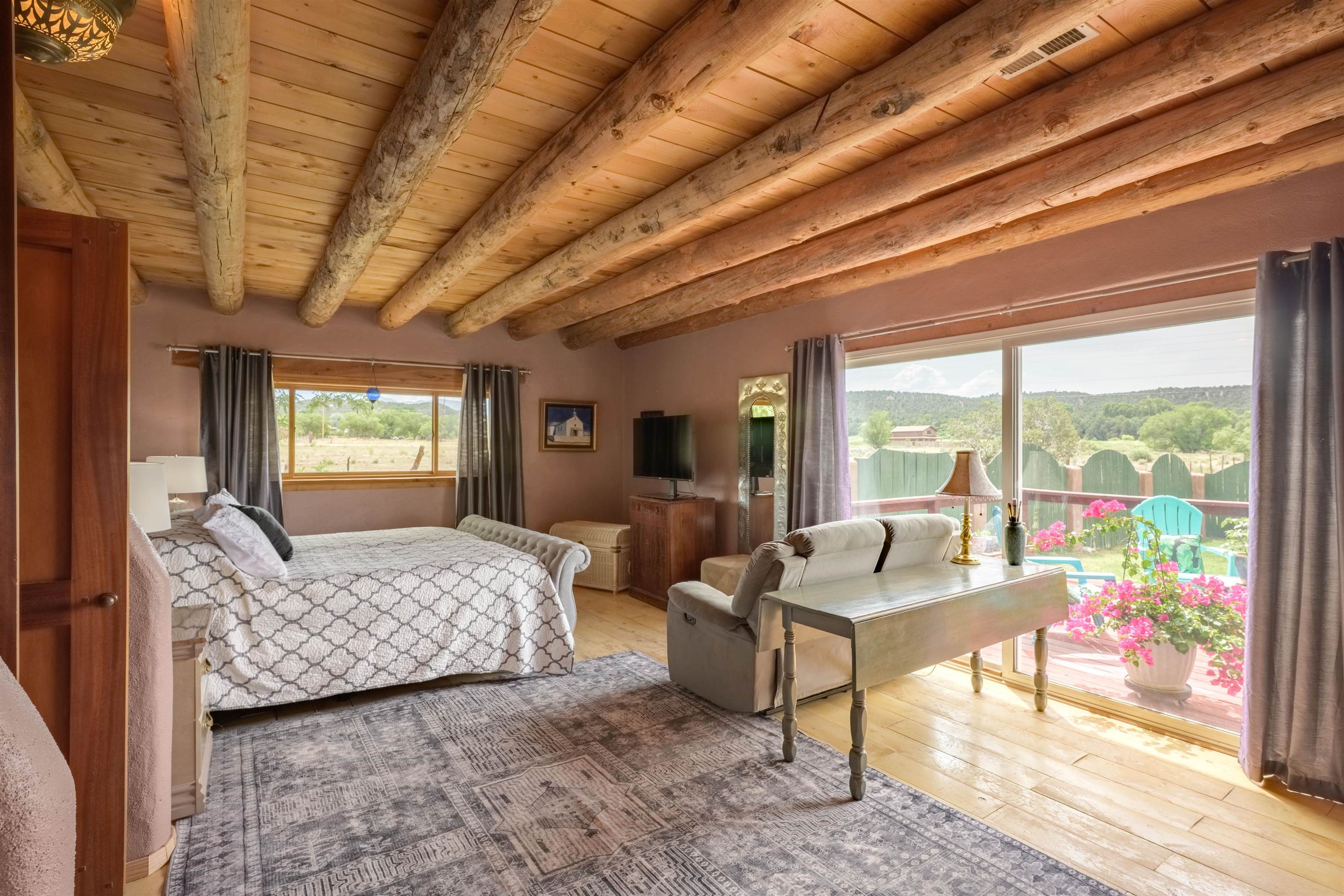 Rare Ranchette with an Adobe Residence & Water Rights in Magical Arroyo Hondo ~ Everything you've ever dreamed of exists right here. This rare property features a flowing acequia alongside an elegant and tastefully updated Adobe residence. Perfectly positioned for the outdoor enthusiast, you can play in the waters of the Rio Grande just minutes to the west, or head east through charming Arroyo Seco to experience the world-class slopes of Taos Ski Valley. Spanning just under three lush acres off a well-maintained, paved Hondo Seco Road, this private oasis offers supreme tranquility and some of the absolute best views in the Southwest. An unforgettable first impression awaits as you step through the enclosed flagstone patio and a breathtaking masterpiece sea glass door. Inside, an immediate sense of vibrant warmth fills the space, where abundant natural light highlights classy fixtures and endless Southwestern character. Stunning architectural details are everywhere, from the viga and beam ceilings down to the hardwood and Saltillo tile floors, beautifully complemented by a traditional fireplace, bancitos, corbels, and step-down walls perfect for displaying your art collection. The sunken den offers a welcoming gathering spot to cozy up by the fire, while a versatile back bonus room serves perfectly as a home office, studio, theater, or extra sleeping space. The home provides three spacious bedrooms and two comfortable bathrooms, highlighted by a large primary ensuite tucked quietly at the back of the home with beautiful light, a highly functional bathroom, and private access to the yard. At the heart of the home, the open-concept dining room and kitchen—complete with a second egress to the back deck—provide the ideal setting for morning routines and entertaining dinner guests. Step outside to the enclosed, beautifully landscaped backyard to find a tranquil pond and fountain, creating a magical setting where you will love tending the garden, relaxing, and unwinding under a starry New Mexico sky.