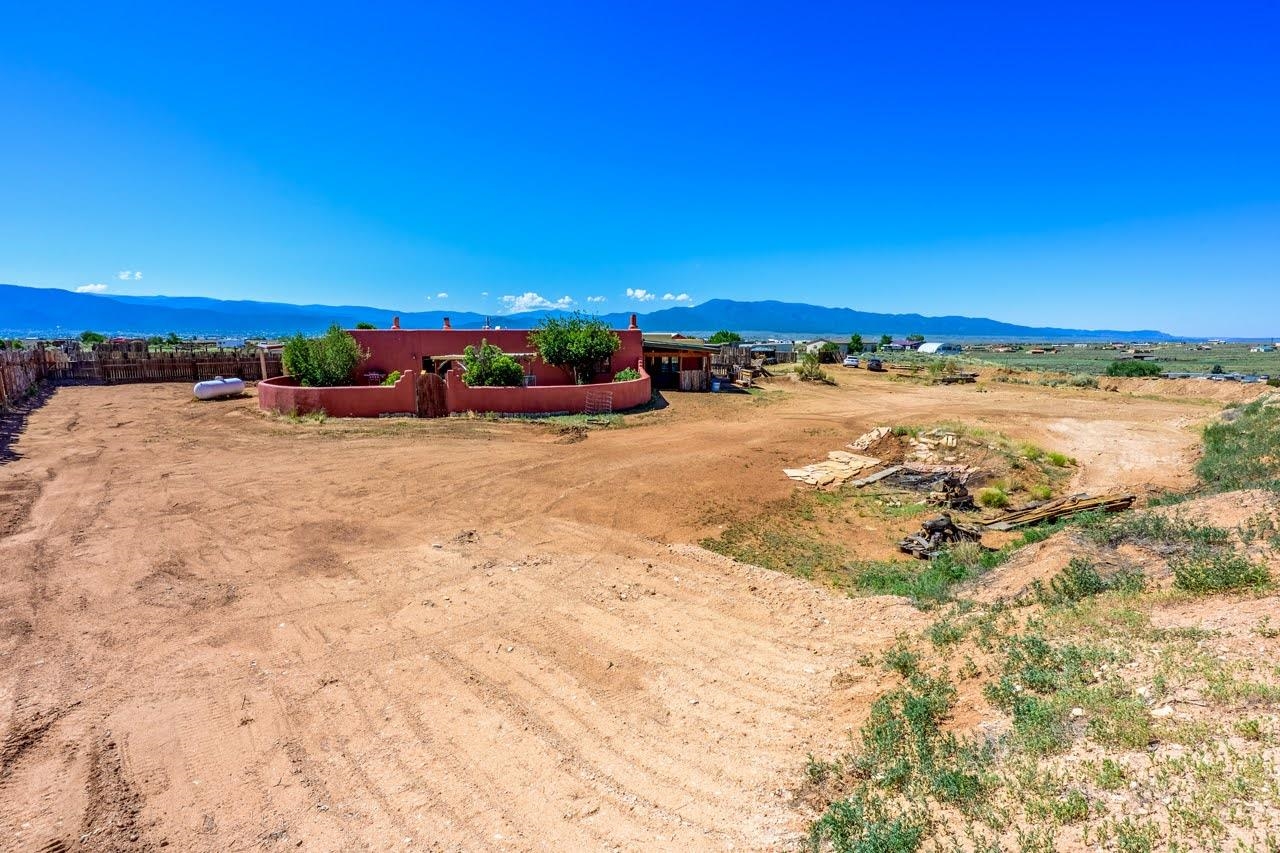 Gorgeous sunsets and sweeping views! Just 5.4 miles from Taos Plaza, hidden away down a dirt road and looking out over the edge of the world, you will find a remarkable sense of privacy . This lovingly renovated, 3 bedroom, 3 bath home has beautiful high ceilings with vigas throughout, two kiva fireplaces, two ensuite bathrooms, open living/dining area, and bonus room with it's own entrance. Outside off of the kitchen you'll find a walled courtyard with fruit trees, and lilacs where you can entertain, garden, or just enjoy a cozy cup of tea under the stars. In the front, another walled courtyard that can be planted with tomatoes, flowers, etc. to the side, there are two covered areas, one with wood decking and a freestanding Hot Tub perfectly positioned to savor the expansive western views. The surrounding land is a blank slate to add landscaping and gardening to your heart's delight! There is a large Barn/Shed, dog house, and children’s play area. Combined 1.5 acres situated on two .75 acre lots.