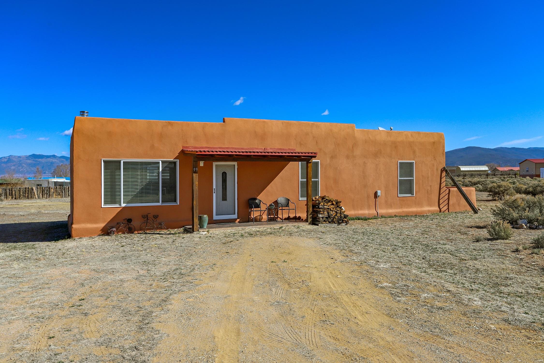 Enjoy the beauty and lifestyle of Ranchos de Taos from this charming 1,309 sq ft home set on 1.21 acres with beautiful views of Taos Mountain. The home offers a warm and inviting feel with a cozy living area and wood stove, perfect for crisp mountain evenings, along with hot water radiant floor heat that keeps the home comfortable year-round and even extends onto the front patio. Step outside to a lovely back deck where you can relax and take in the big skies and stunning Taos Mountain views. The primary bedroom features a walk-in shower and a private exterior door that leads to a sweet walled patio, creating a peaceful spot for morning coffee or quiet evenings. Additional features include tile floors throughout, natural gas, and a practical layout designed for comfortable living. The property is served by a shared well and septic system and offers the space and tranquility that make Ranchos de Taos so desirable. Located just minutes from the Rift Trail, the Taos Country Club golf course, and the shops, dining, and galleries of town, this home offers easy access to both outdoor adventure and Taos culture.
