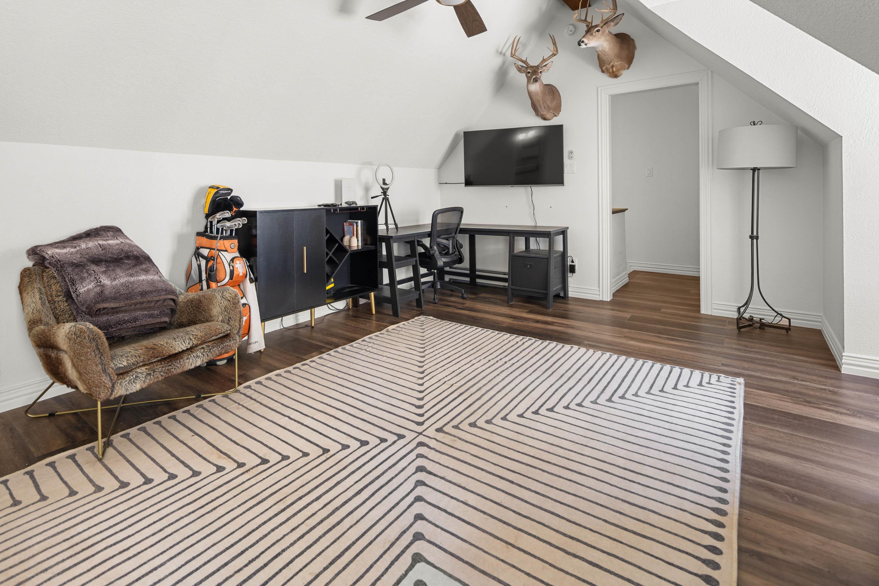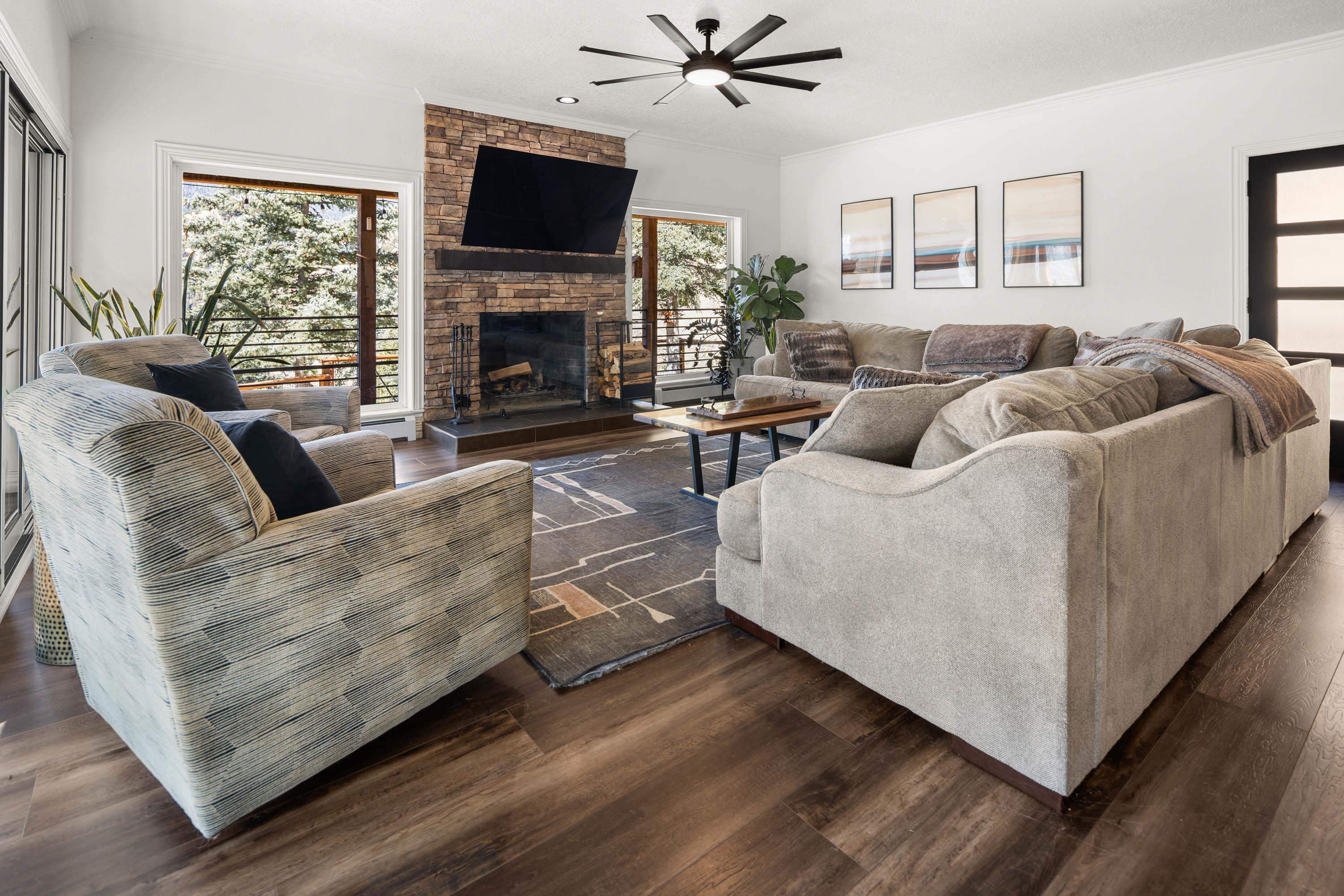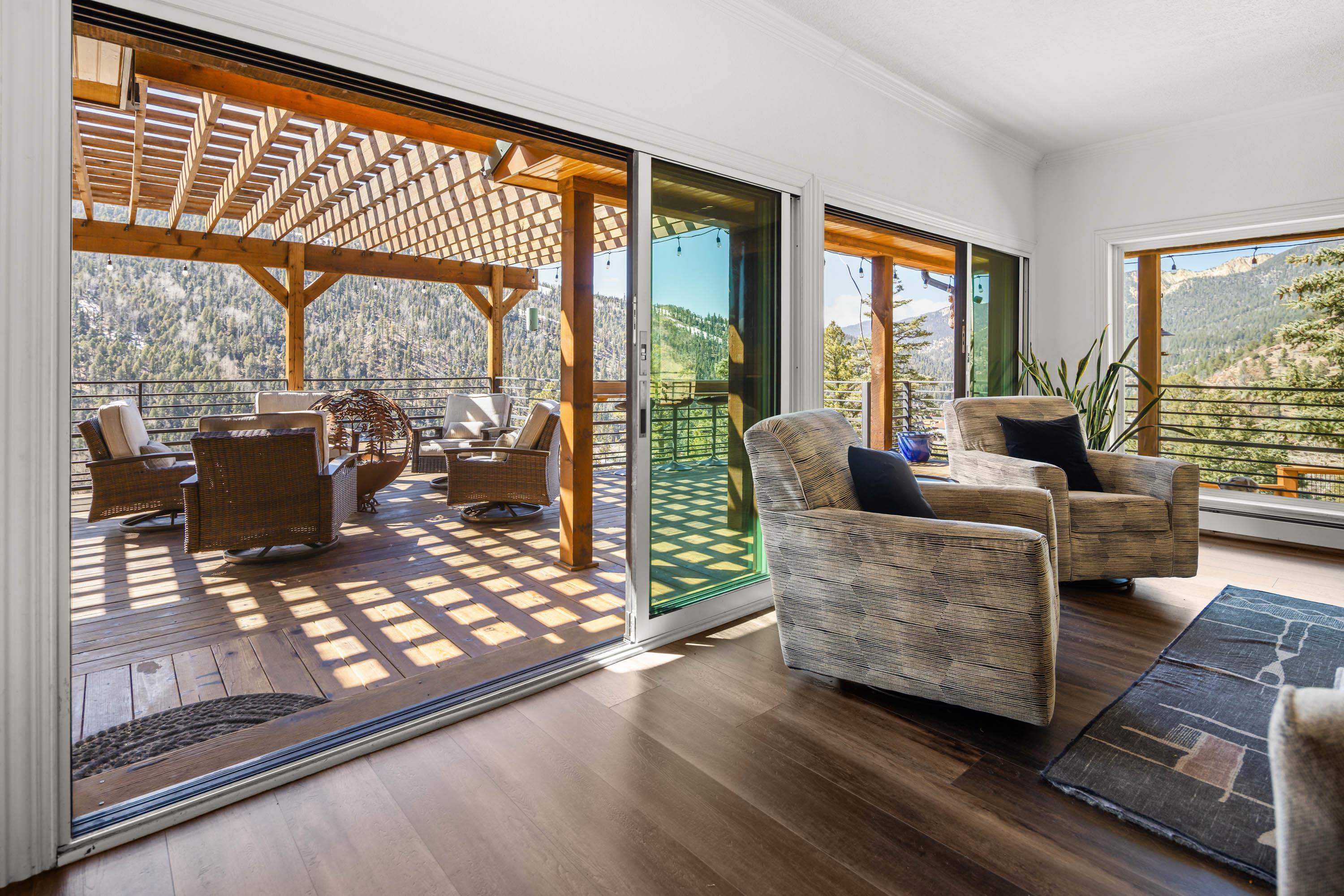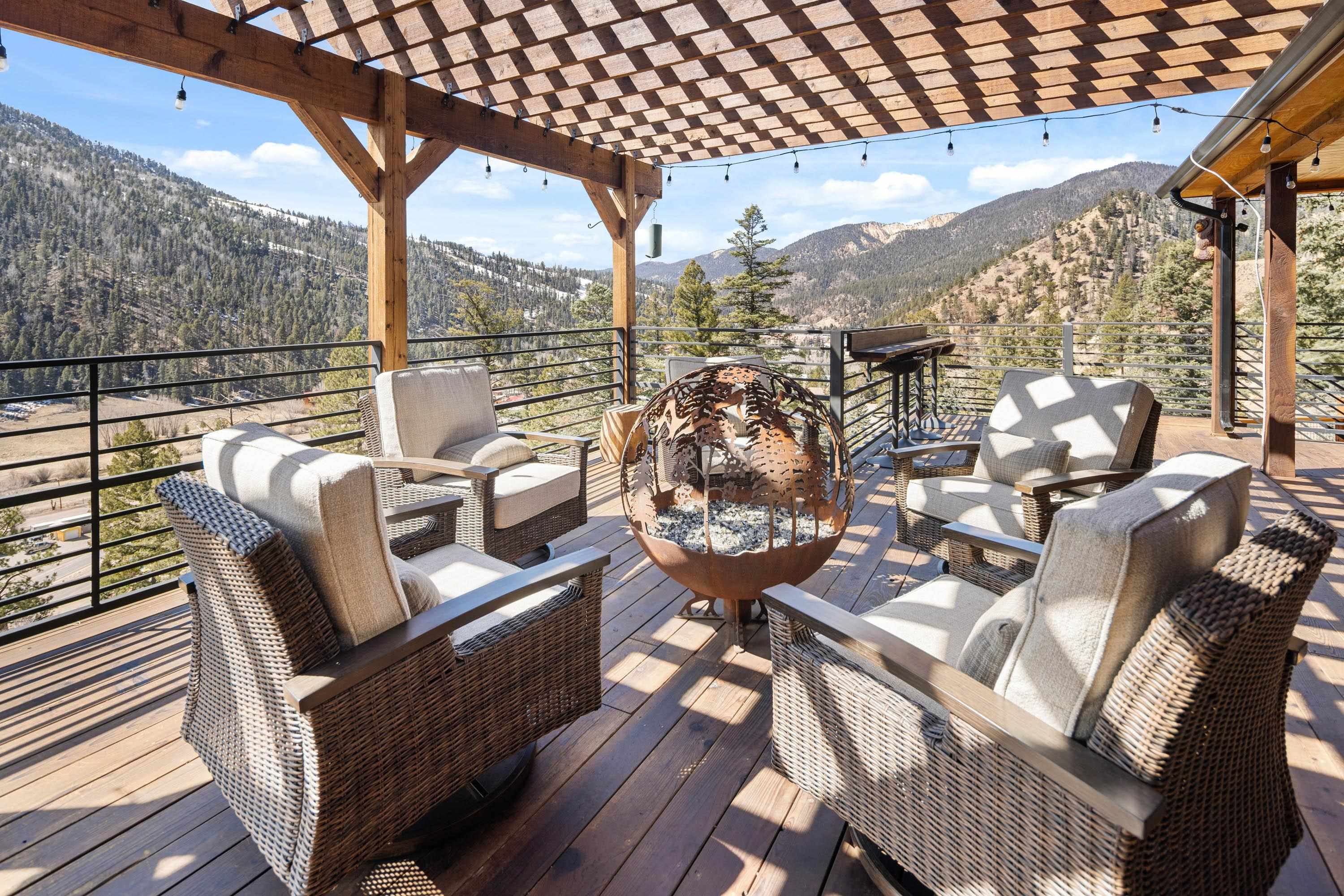 The Biggest and Best View in Red River Awaits! Welcome to 400 Spruce Trail, your fully remodeled and updated mountain retreat perched high above town. This property boasts what is arguably the biggest and best view in all of Red River, offering unparalleled panoramas of the town, mountains, and spectacular sunsets. The home welcomes you into an open living and dining area, surrounded by glass to maximize the stunning vistas. Adjacent to the wood-burning fireplace, two oversized sliders seamlessly extend the living space onto the scenic deck. Here, you can soak in the unbelievable view, gather around the custom globe fire pit, or post up at the outdoor bar overlooking the entire valley. Inside, the main floor features a wet bar complete with a built-in ice maker and beverage cooler, leading into an updated, modern kitchen - a true chef’s dream. The main floor spacious primary suite, also wrapped in windows, provides a private, bedside view over the entire valley. Up the custom floating staircase, you’ll find a second living space and two additional spacious bedrooms, each with their own ensuite bathrooms. A window-wrapped flex space on this level offers potential for an office or a fifth bedroom conversion. For added privacy, a separate fourth bedroom with an ensuite bathroom is located above the oversized two-car garage. The property comes complete with a sodded and fenced side yard and is serviced by town utilities and plowing. Call today to schedule your chance to see this one-of-a-kind property and experience the high-altitude view for yourself!