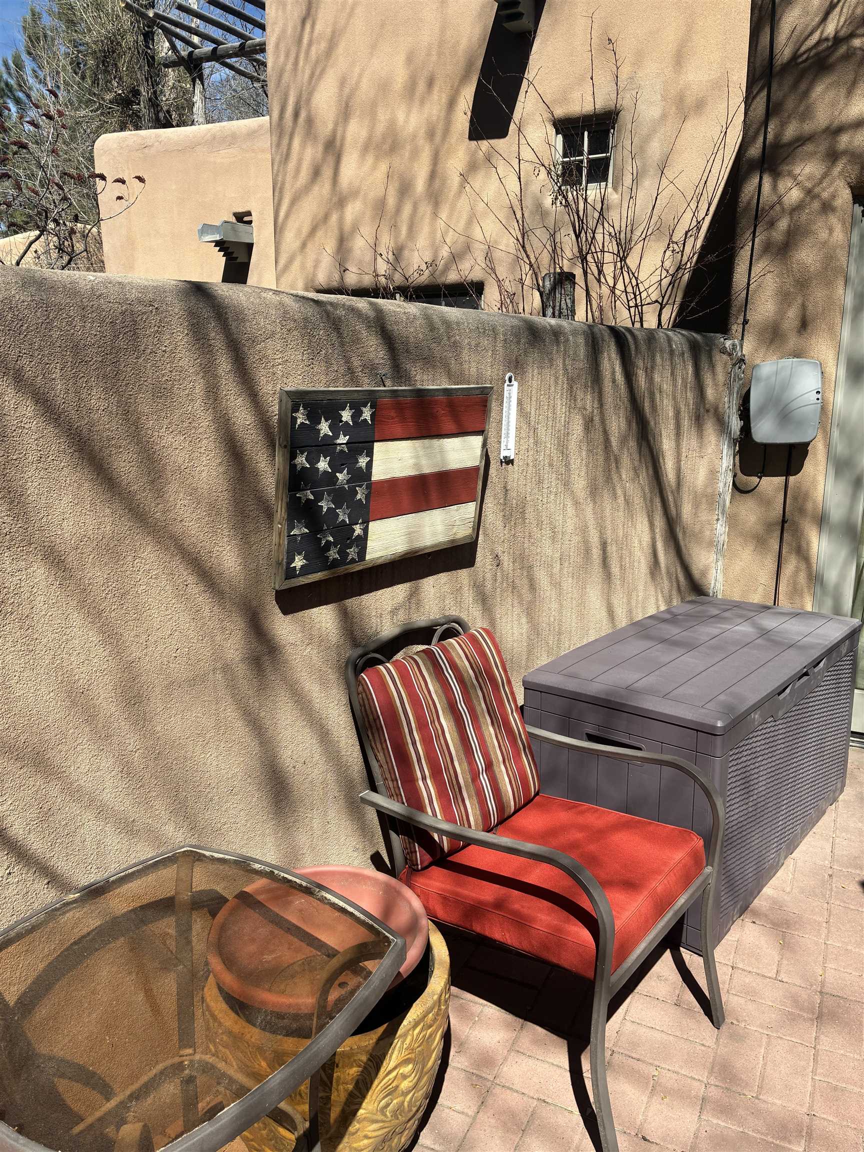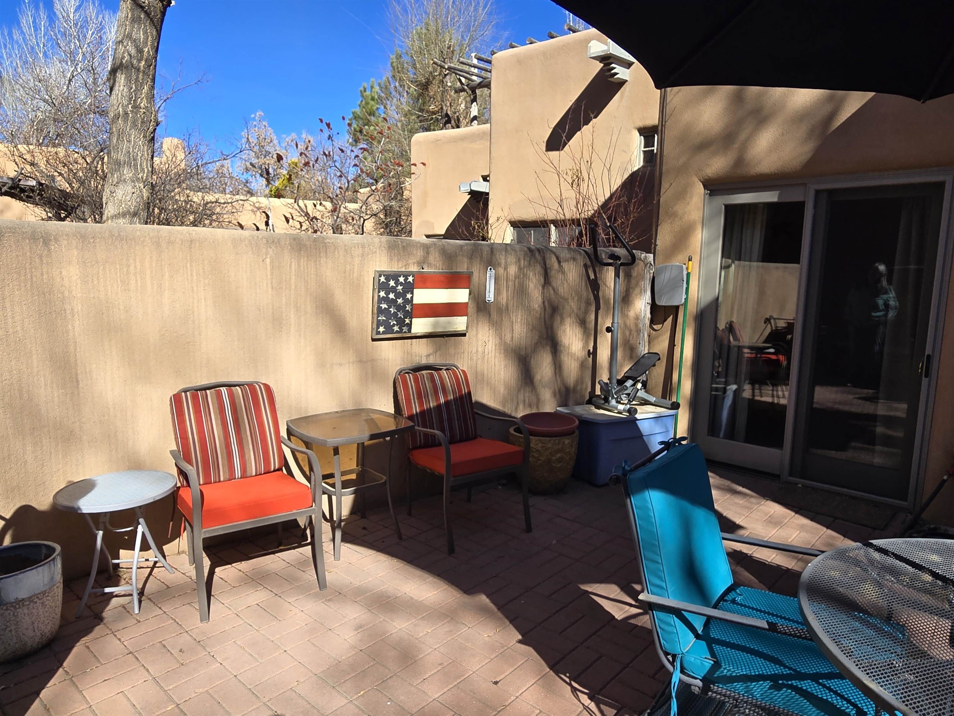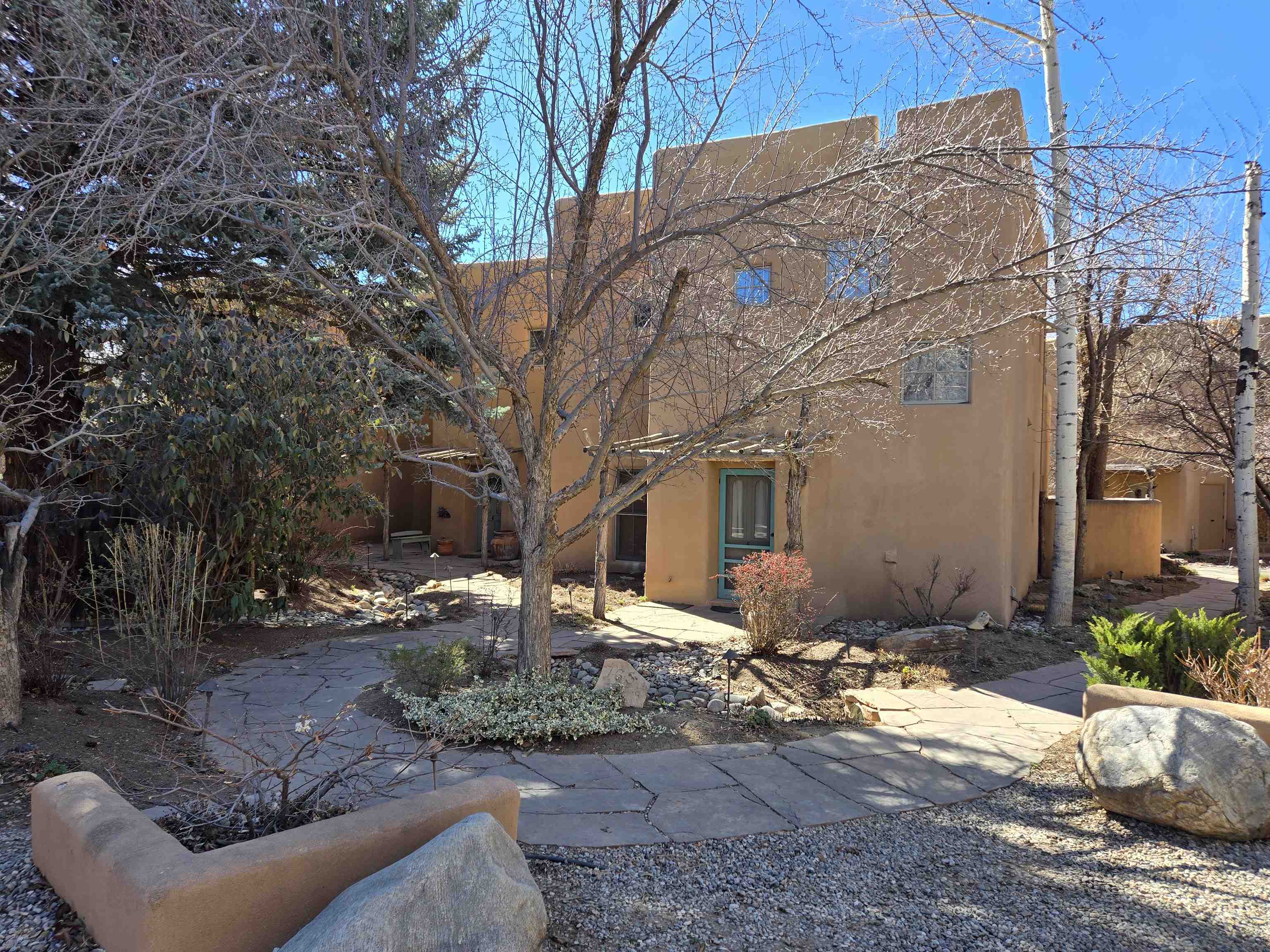 This Kit Carson Road two bedroom two and a half bath condominium location is the place you need to be, within walking distance of dining, shopping, music and galleries downtown in Taos. This quiet compound is home to just nineteen units on a shady street. The two-story condominium has a lovely open floorplan that expands out onto a private courtyard where your potted flowers will glow. Remodeled in 2022, this unit saw top quality upgrades of cabinetry, stainless appliances, new Saltillo tile flooring throughout the ground floor and an on demand water heater for endless showers! Granite countertops sparkle under the two-story skylight. The kitchen supplies ample storage in the rich wood cabinets and island. The owners love to entertain, and the space worked beautifully for many functions throughout the seasons. The large LIVING ROOM is so cozy with handsome vigas, the Pueblo-style gas fireplace and wood frame windows. The warmth of wood flows through the home with pretty raised panel wood doors. Ceiling fans circulate fresh air in handsome fashion. The quality Hunter blinds work seamlessly, opening from top or bottom to control the streaming sunlight or privacy. Large sliding patio doors open out to the private courtyard from the dining room. The main floor also features a BEDROOM / OFFICE with ensuite bath, large closet, a powder room with laundry closet and large under staircase storage area. Upstairs a LARGE PRIMARY BEDROOM is spacious enough to share an art studio area. It features a lovely bath with a large tub, linen cabinets and sunny glass block corner to spread the sky light around. The upper level has its own deck with space for seating overlooking a sunny southern exposure and fresh mountain air. These units do not stay on the market long, so call to request a showing today.