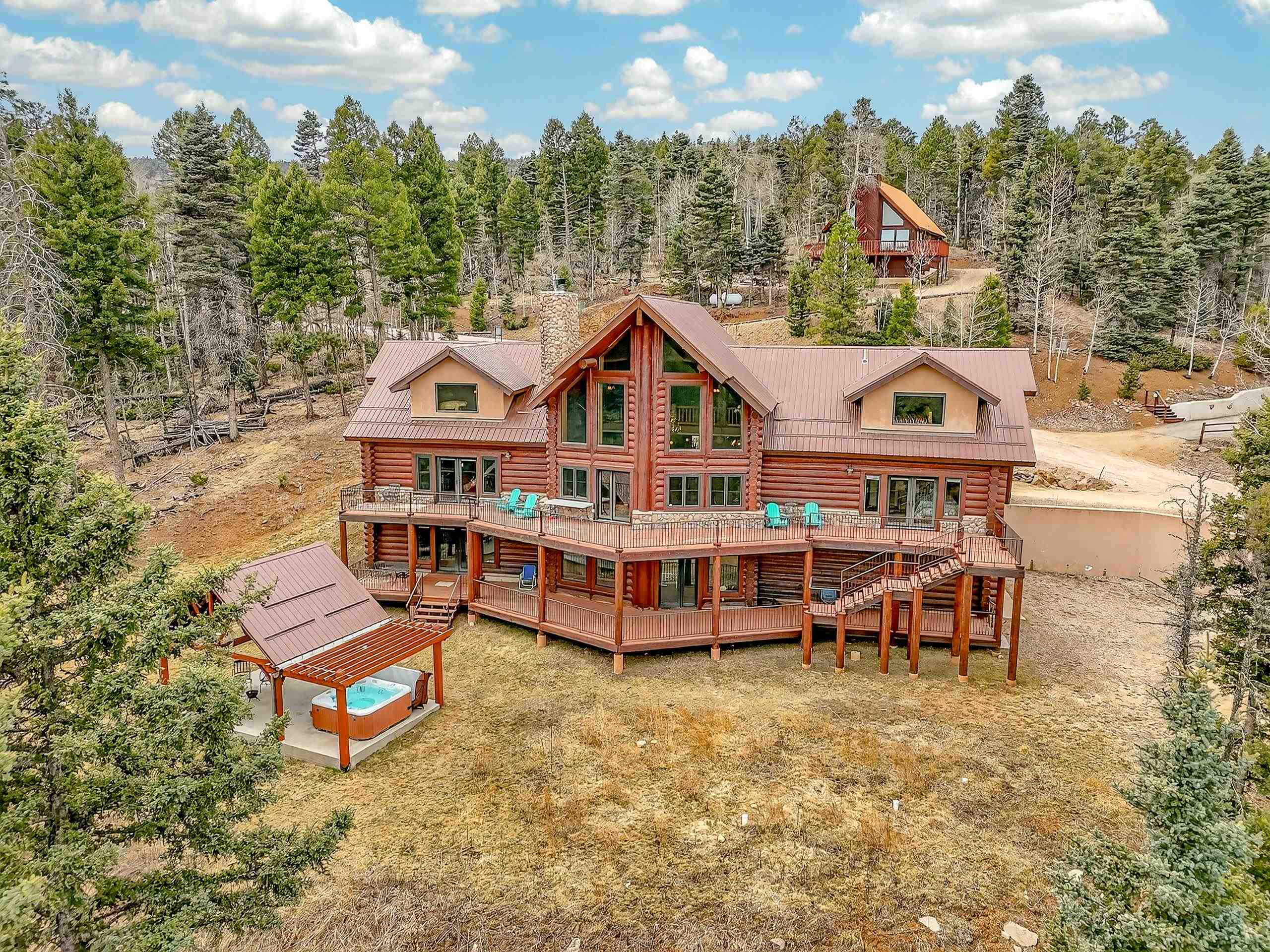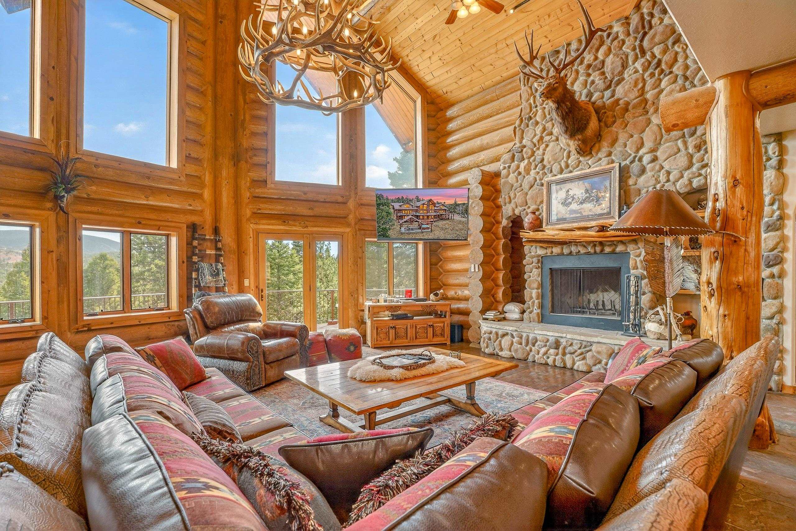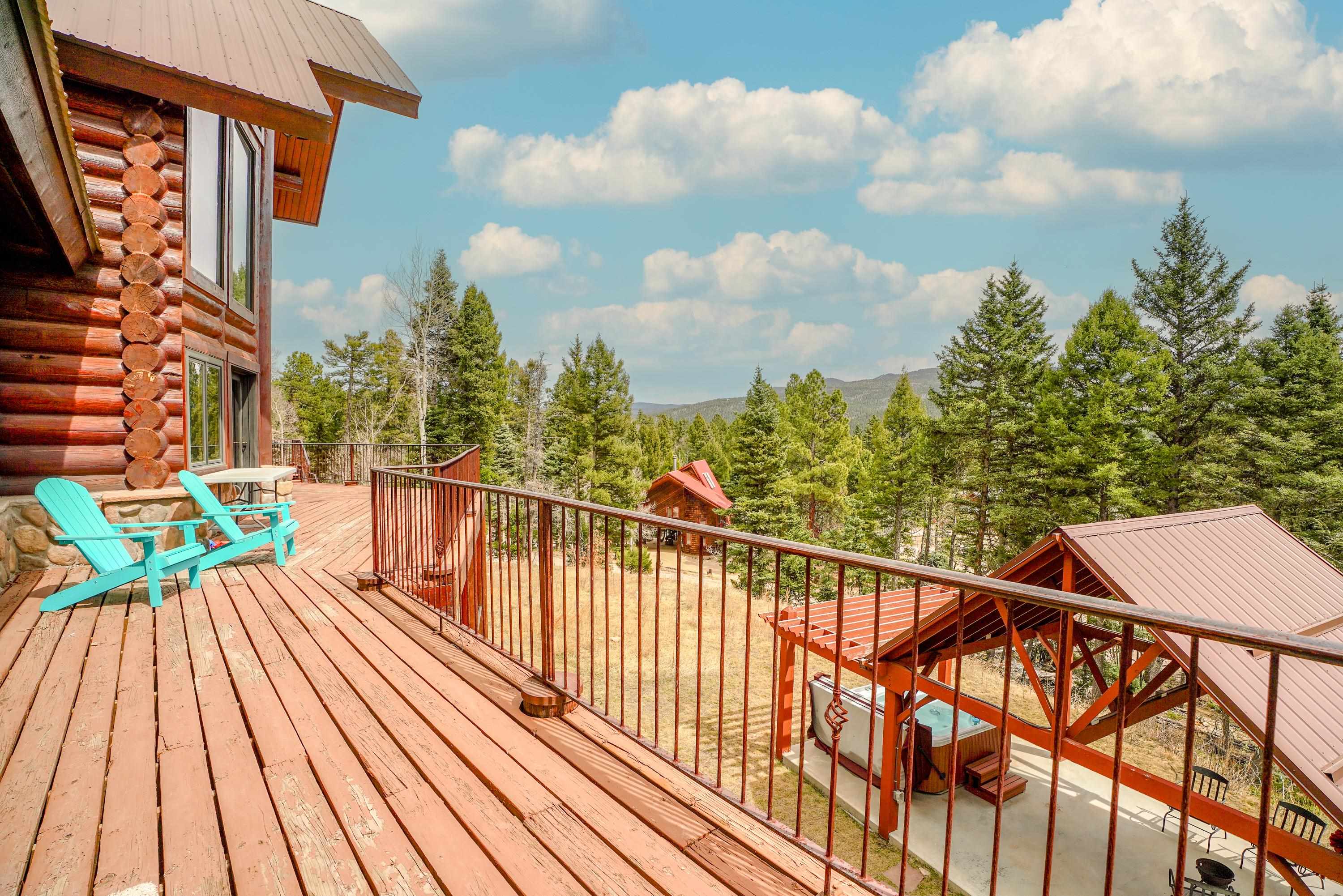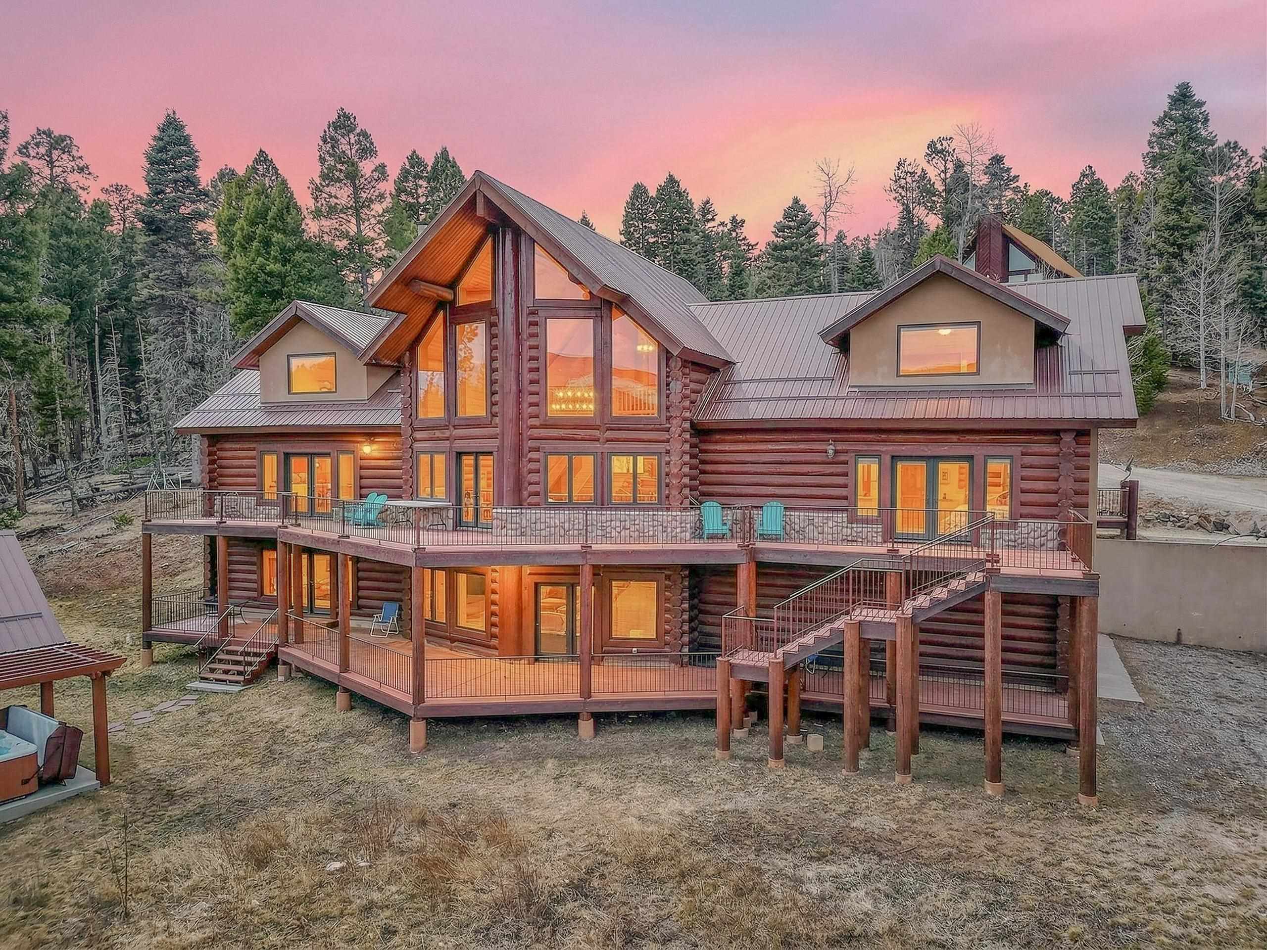 Mountain Luxury Living At Its Finest! This beautiful log and stucco residence boasts 4 spacious bedrooms, 5 bathrooms, a safe room, a children's game room and multiple living areas. Highlighted with impressive natural log columns, soaring ceilings and a wall of windows with great views. A massive rock fireplace serves as the centerpiece of the expansive living room. The kitchen is thoughtfully designed with custom cabinetry, granite countertops, and high-quality appliances. This home offers two additional living or recreational spaces, making it ideal for large or extended family gatherings. Downstairs the "bear den" has plenty of space for game-night and the other room has unique custom bunkbeds which is perfect for the little ones. Step outside to enjoy multiple outdoor spaces, including a hot tub gazebo, a main-level deck, and a lower deck—perfect for relaxing and taking in the beautiful views toward the Valley of the Utes. Located a couple of blocks from Monte Verde Lake, this stunning home offers easy access to all the amenities Angel Fire has to offer, including skiing and golfing. Additional features include a large two-car garage and a covered drive-up portal at the front of the home, spacious enough for convenient sheltered parking. Generates fantastic rental income with potential for growth.