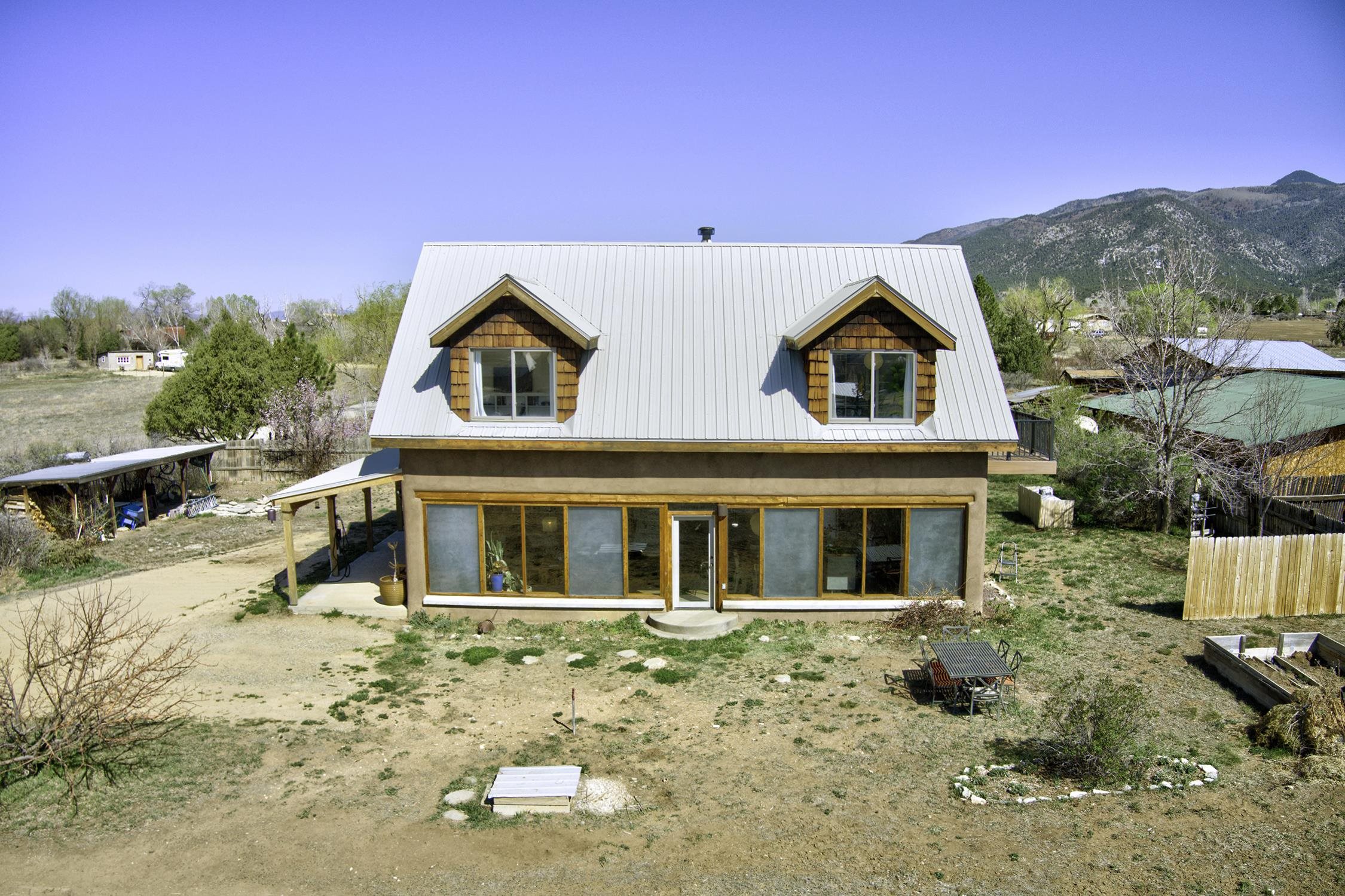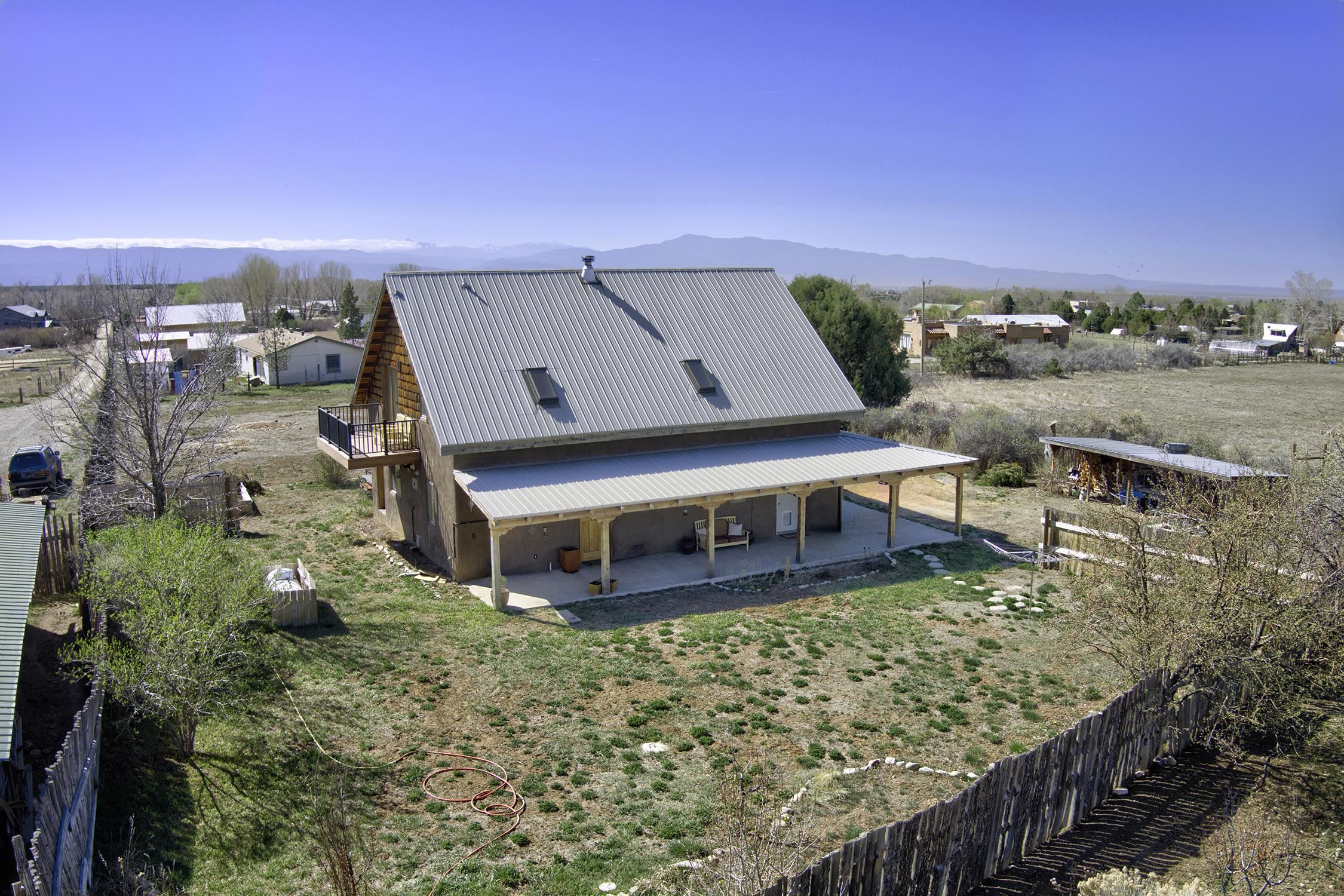 At the end of a quiet, dead-end road near one of Taos County's most beloved villages, this 2,400-square-foot home earns its setting. Large windows pull the mountain views inside, flooding open living spaces with light and sky. Constructed of pumice-crete and frame, the passive solar design ensures year-round comfort. Trombe walls store the day's heat and release it through the night in winter. The wood stove provides additional warmth when needed. The result is a house that works with the New Mexico climate and is grounded in the regional building tradition. Stained concrete, wood, and tile floors flow underfoot alongside organic wool carpeting in the private spaces. Granite countertops anchor the kitchen and baths. Walk-in showers, mica-studded adobe walls, and wood columns give the spaces a quiet sense of craft. Step outside to a deep wraparound covered portal that makes outdoor living a dream, or take in the longer view from the primary suite balcony. Originally intended as a biodynamic farm, this three-quarter-acre parcel boasts established fruit trees and surface water rights. EV charging is available on-site. Arroyo Seco's acclaimed restaurants and shops are minutes away, without having to get in the car. Located just 20 minutes from world-class Taos Ski Valley, and 15 minutes from the historic Taos Plaza. This is the home you've been waiting for.
