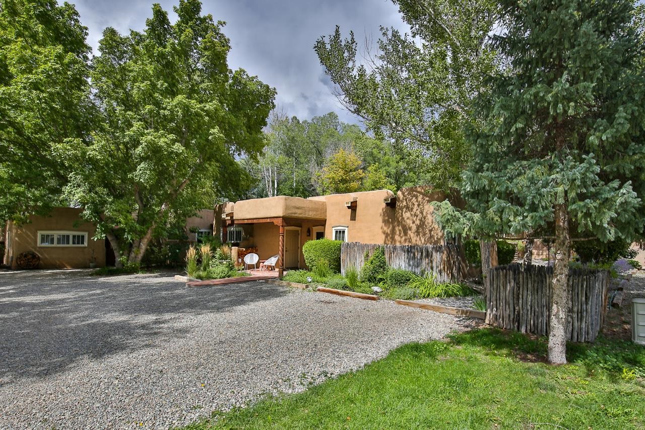 The serene and beautiful Residencia del Rio Pueblo Condo Complex is tucked away in the mature trees, lush and green, offering privacy, wildlife and shade. This updated 2 bedroom 2 bathroom unit has a beautiful brick front patio and walkway to welcome you home with established perennial and herb gardens. The kitchen has been thoughtfully remodeled with quality appliances and the Tabarka tile adds a European flare. The custom island has 2 seats, for casual dining and plenty of storage underneath, with a beautiful butcher block top. Brand new Navient on-demand hot heater will help keep utility costs down. The primary bedroom bath was fully renovated with a walk-in shower, dual sinks, soapstone counter and porcelain tile. The adobe wall around the back courtyard creates privacy in the most attractive way. The large brick patio offers plenty of room for outdoor dining, bird watching or lounging all summer long.